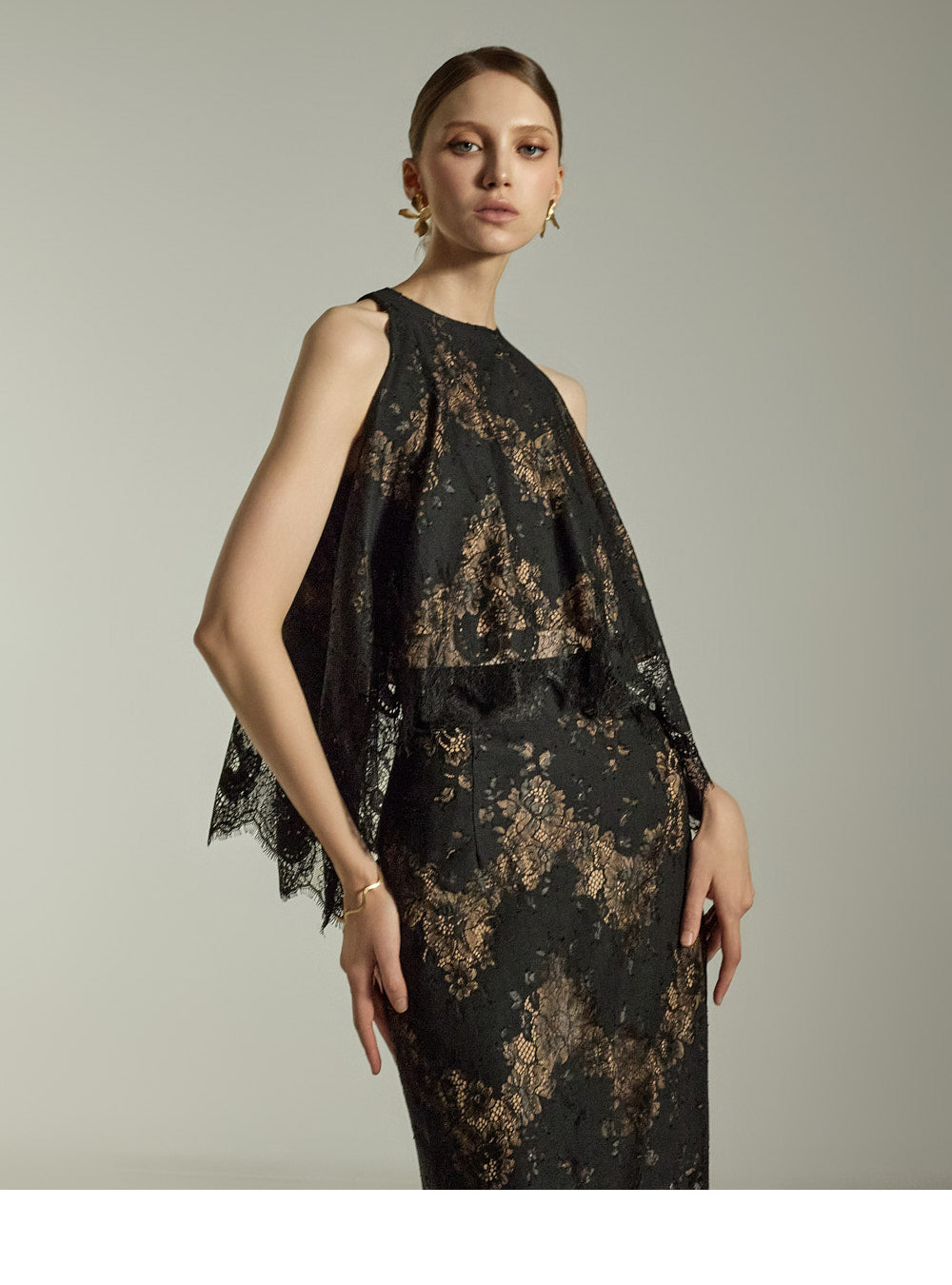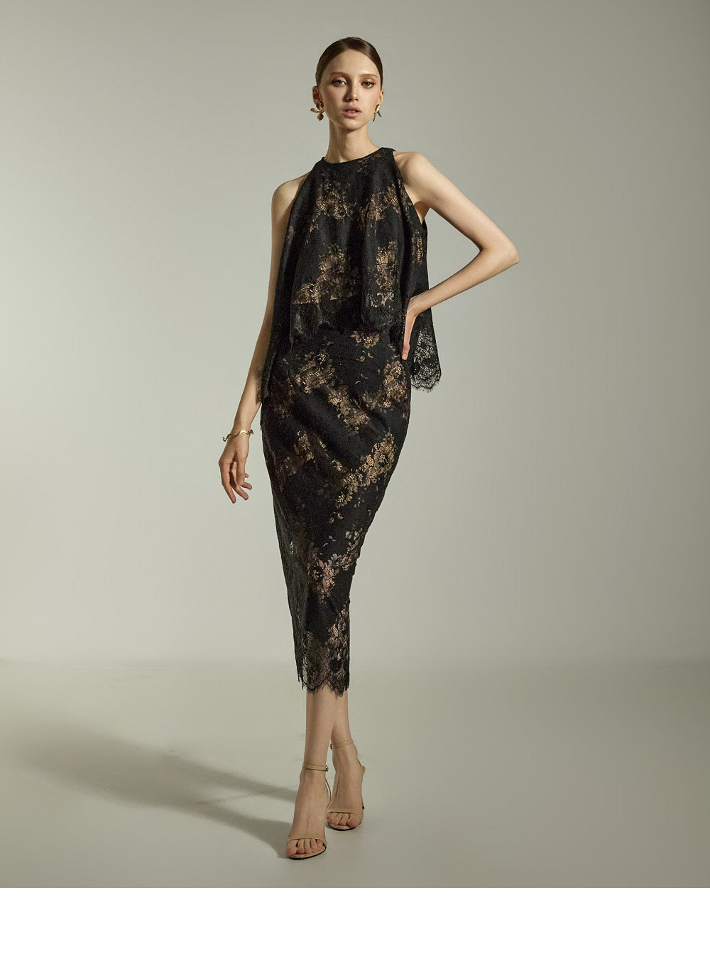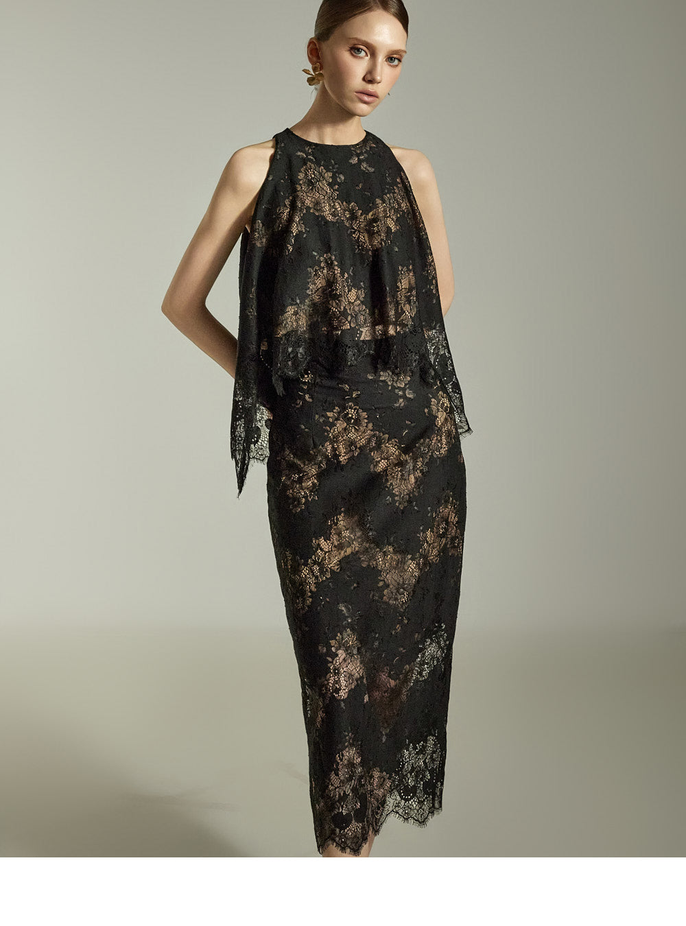 The subtle floral lace pattern on both the top and skirt creates a polished, sophisticated look.