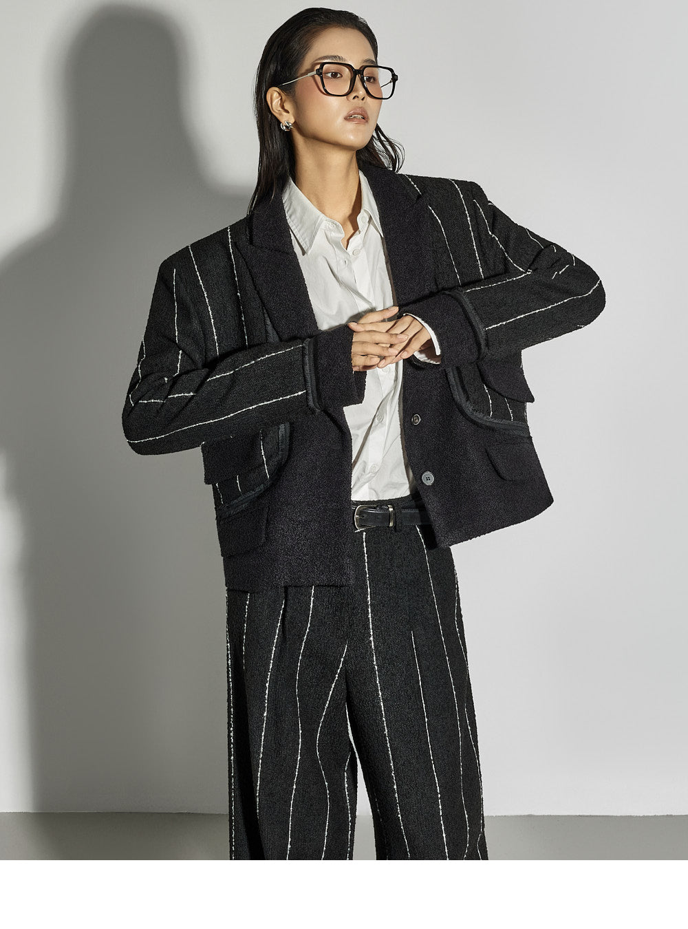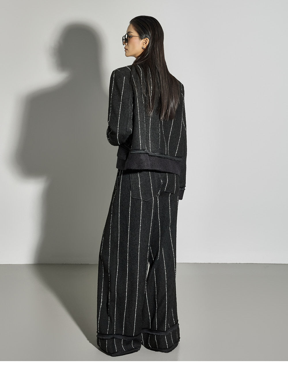 The slacks feature a relaxed, wide fit, providing a formal yet comfortable fit,