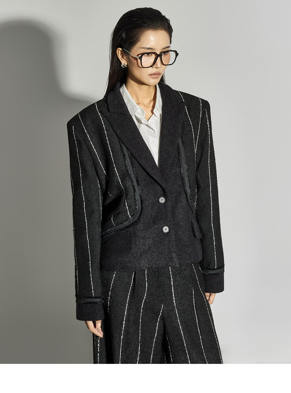 Made from a polyester and wool blend, it offers a solid texture and a warm feel.