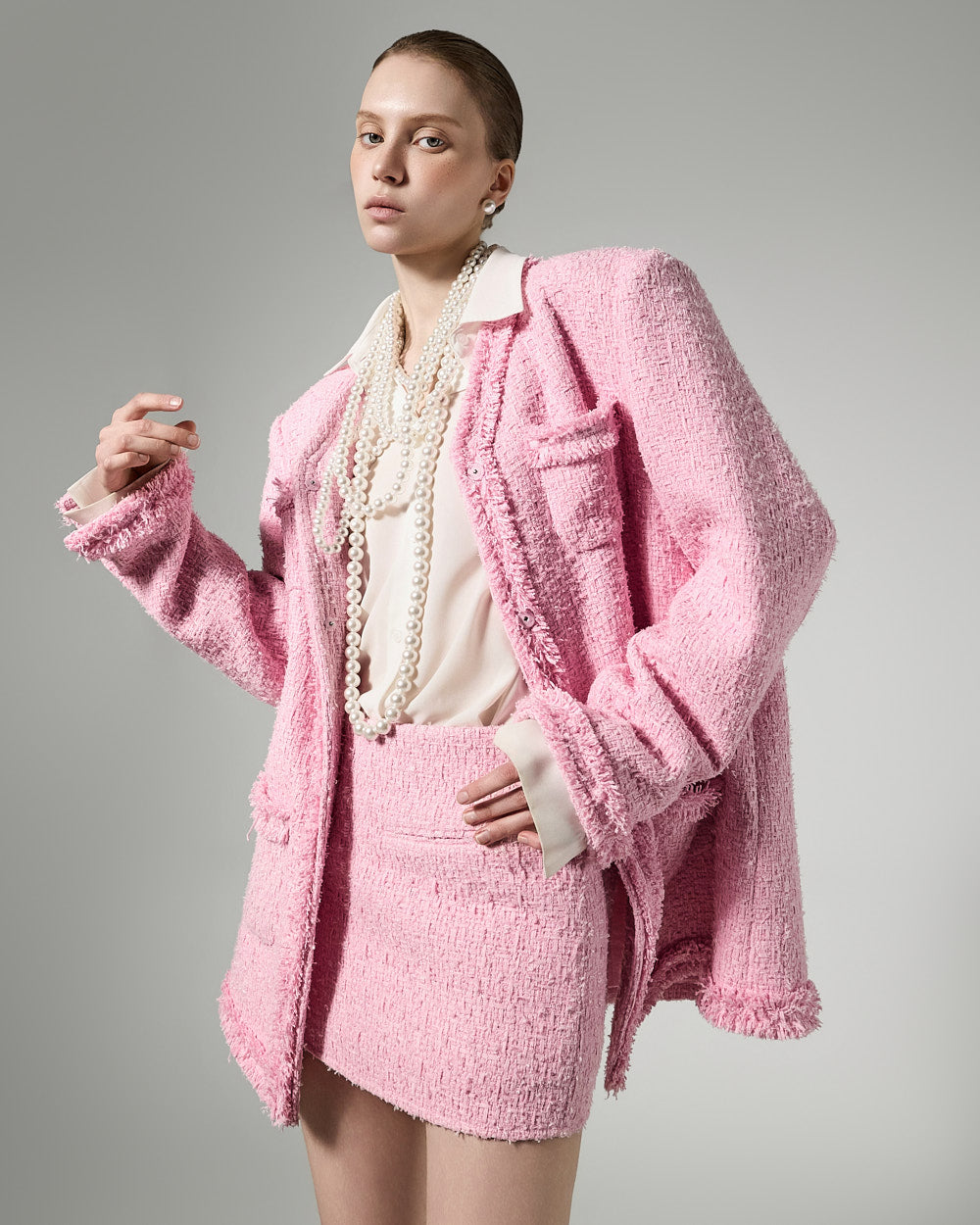The jacket has a clean, oversized silhouette that falls neatly from the shoulders to the waist,
