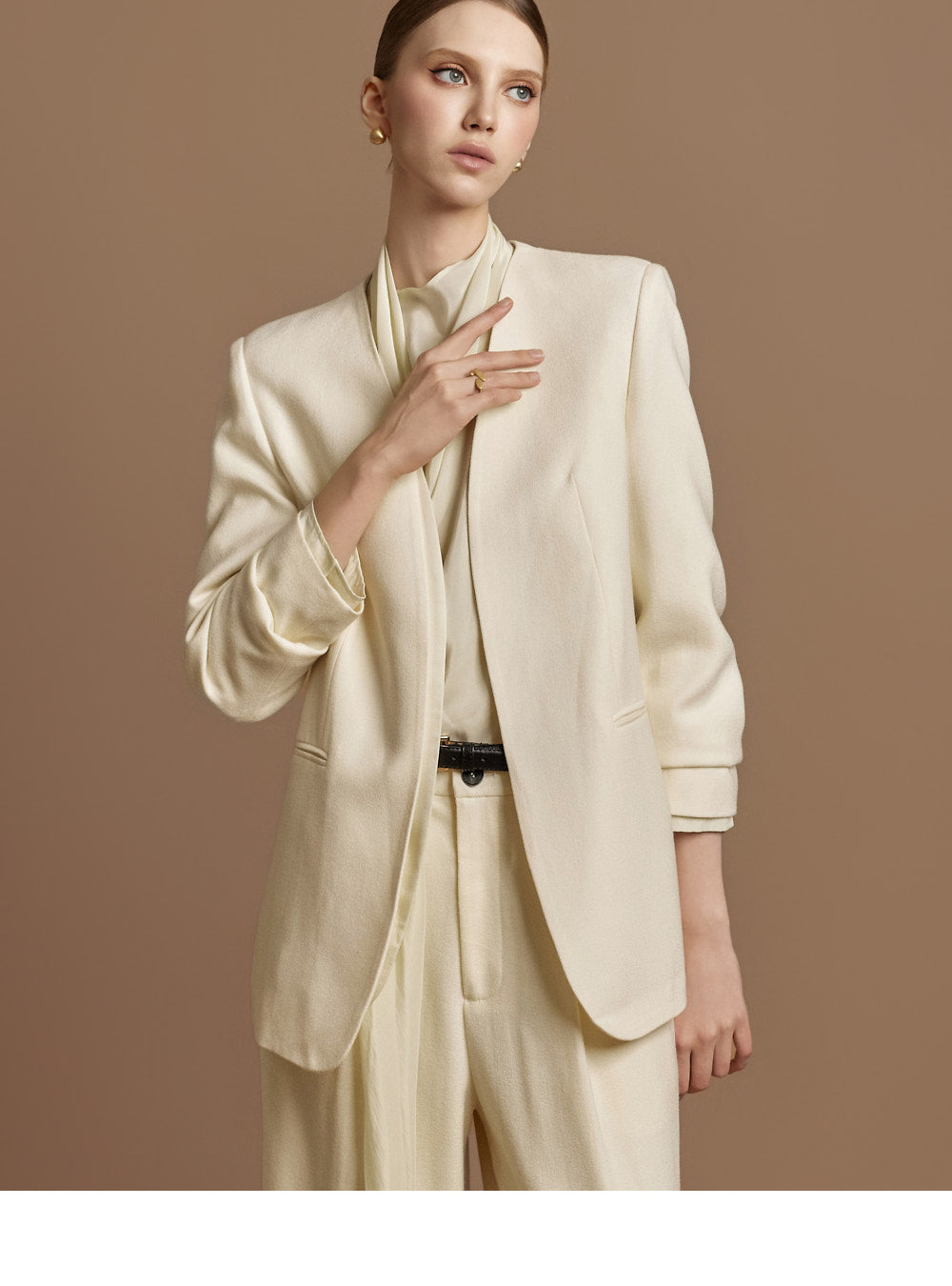 and the loose silhouette and unbalanced length add a sophisticated touch.
