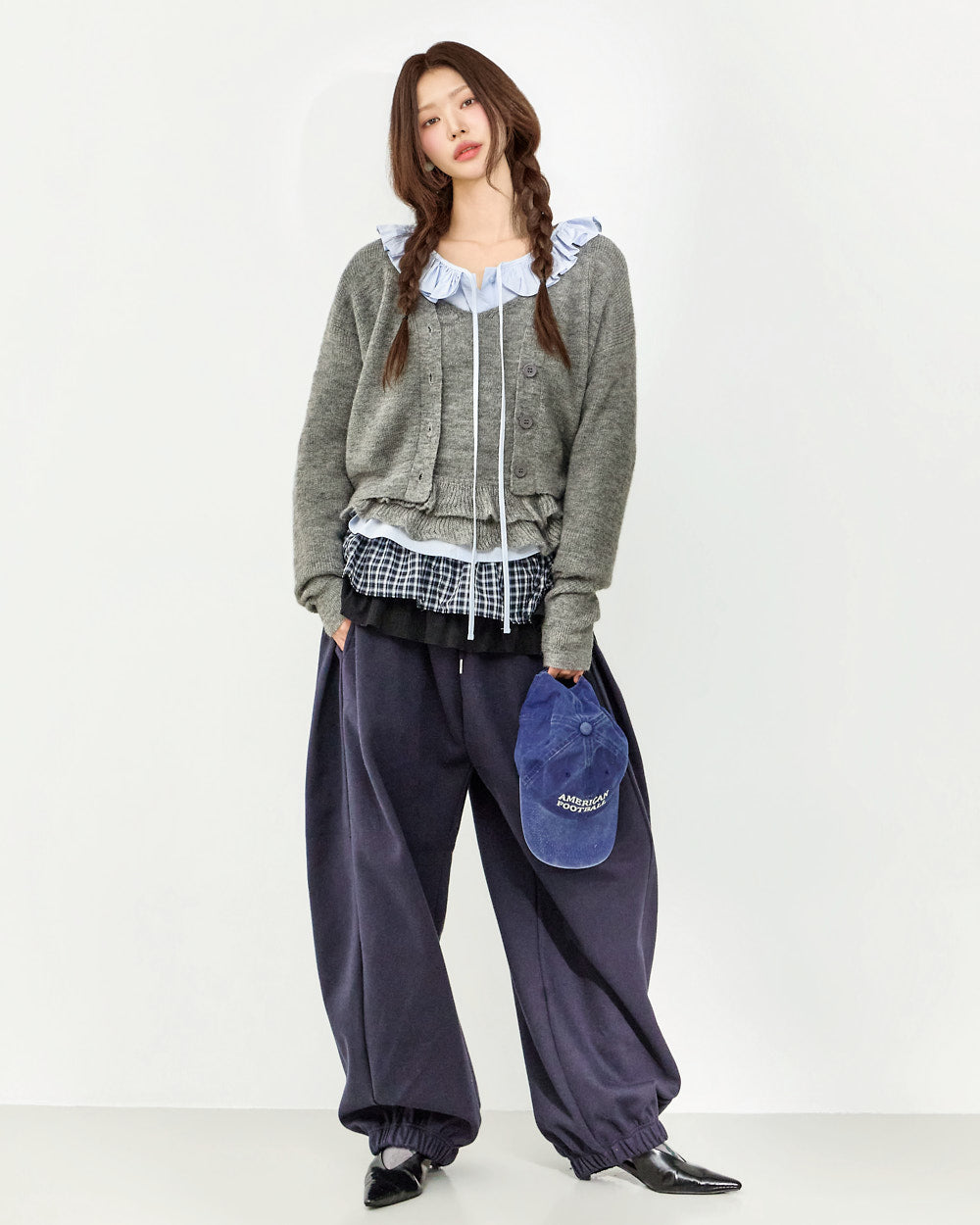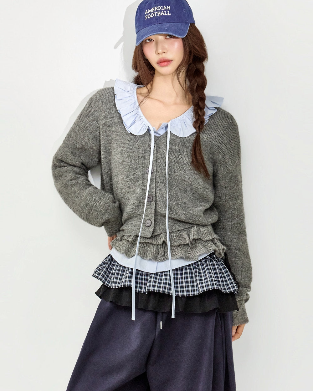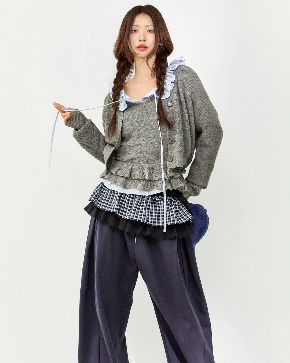 The 171cm model is wearing size one in SKY BLUE.