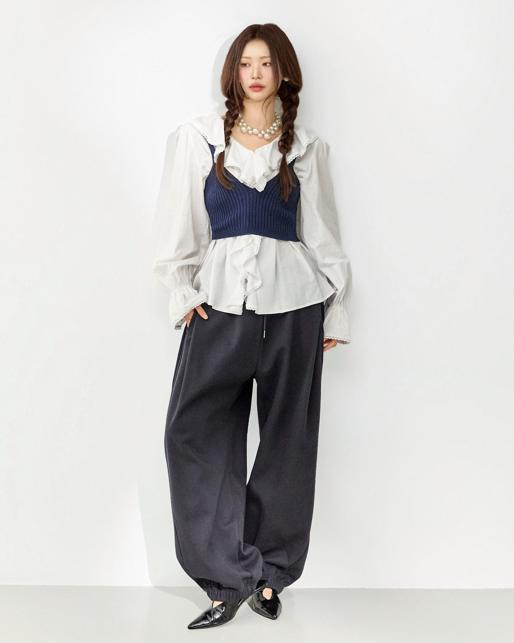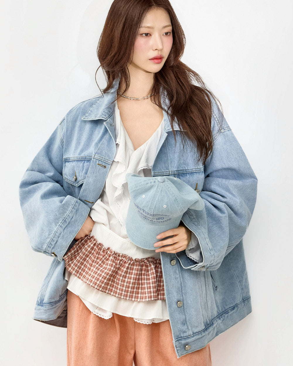 The V-neck design and loose fit create a delicate silhouette,