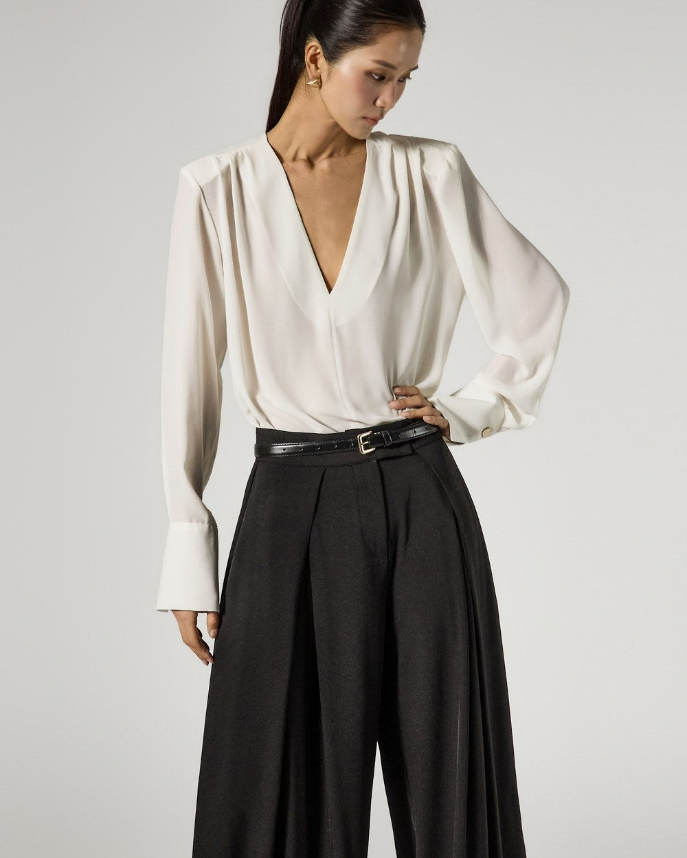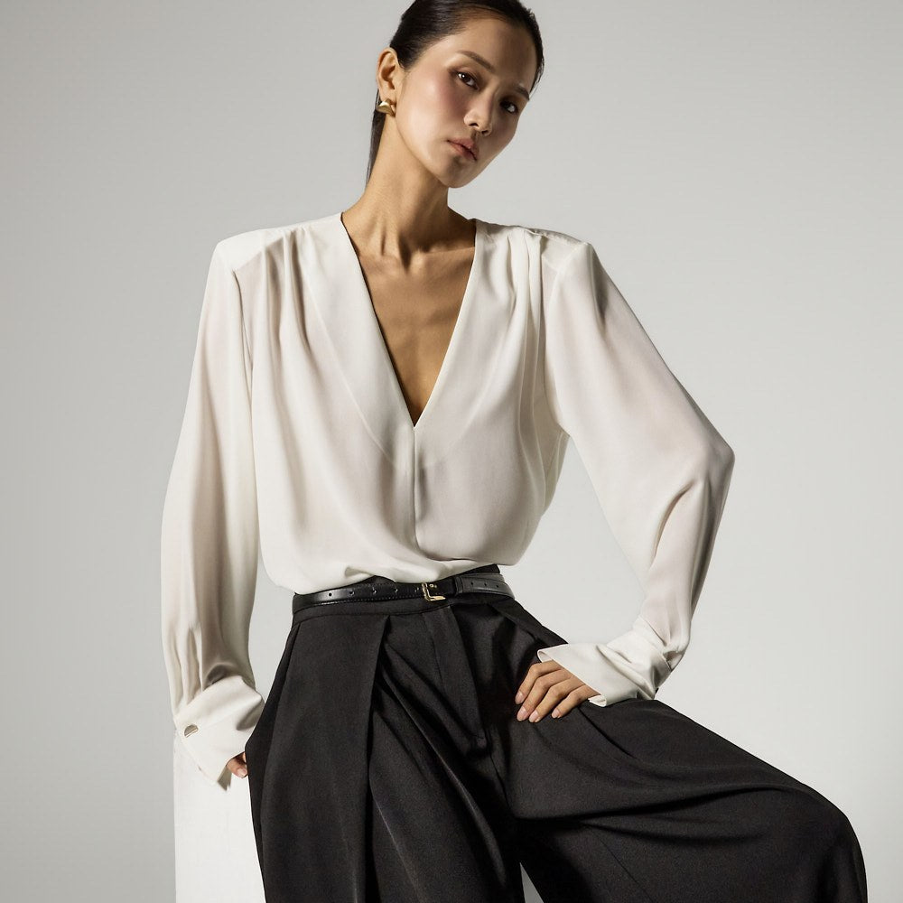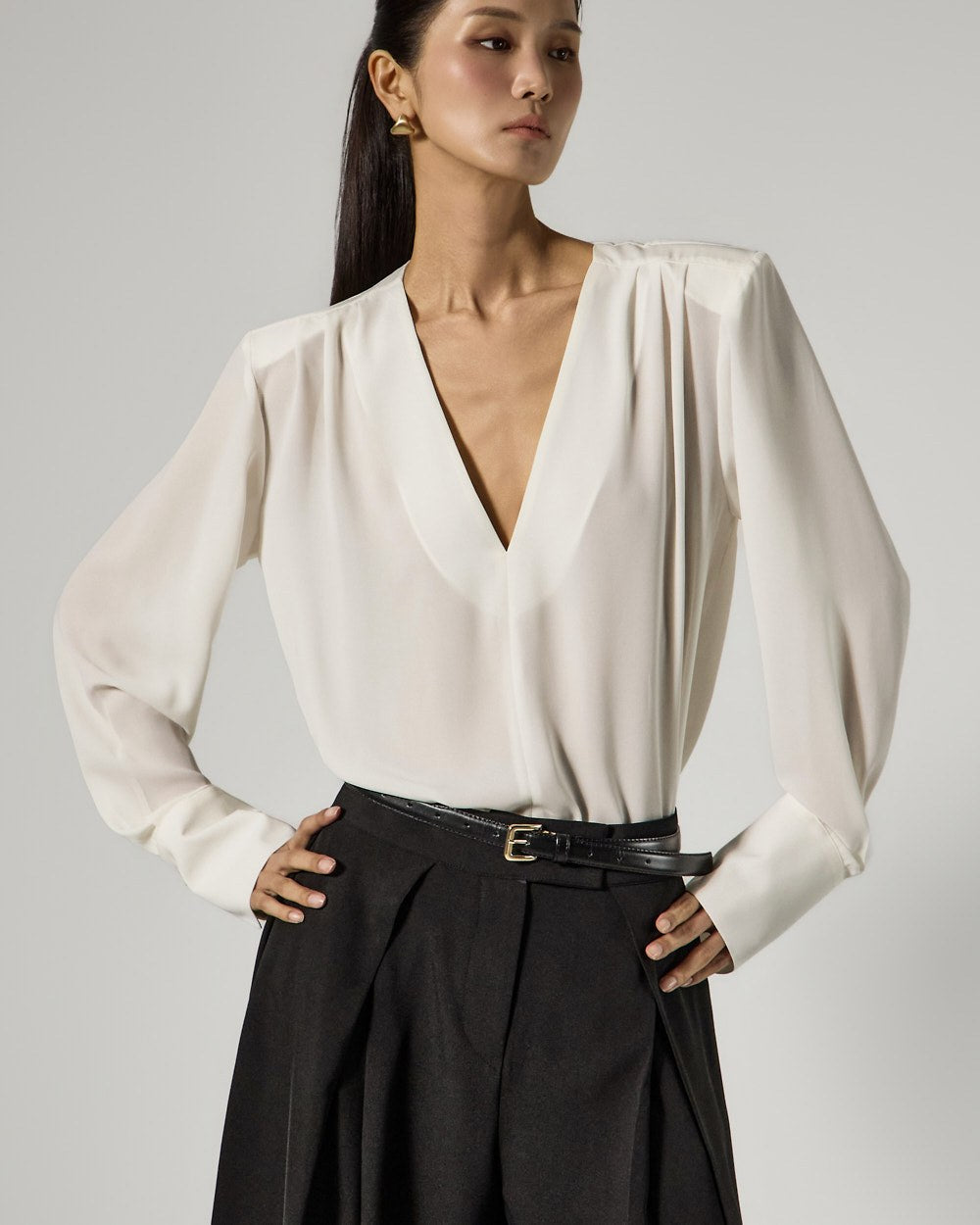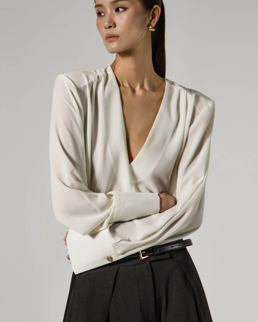 This is an asymmetrical shirred V-neck blouse with a modern vibe.