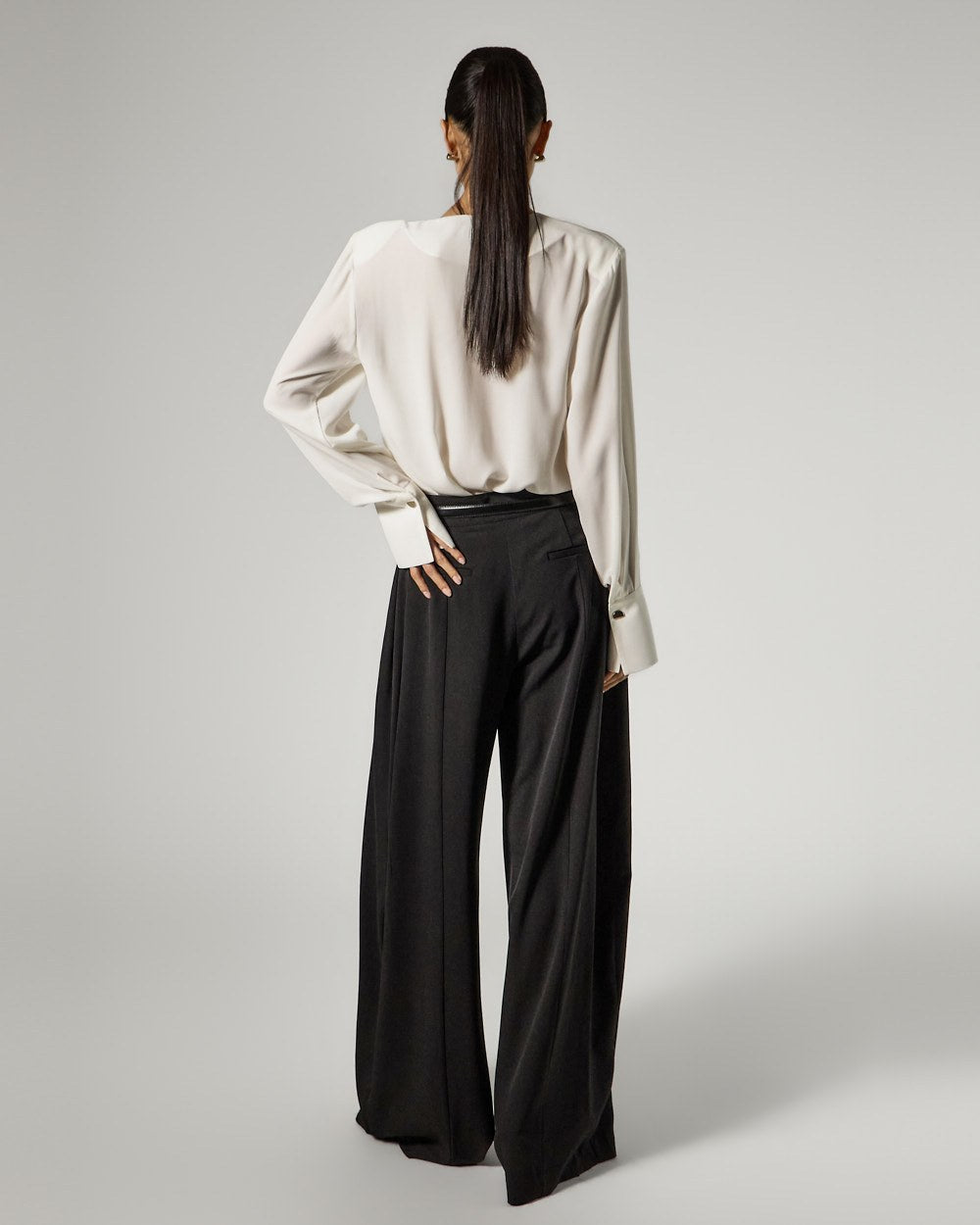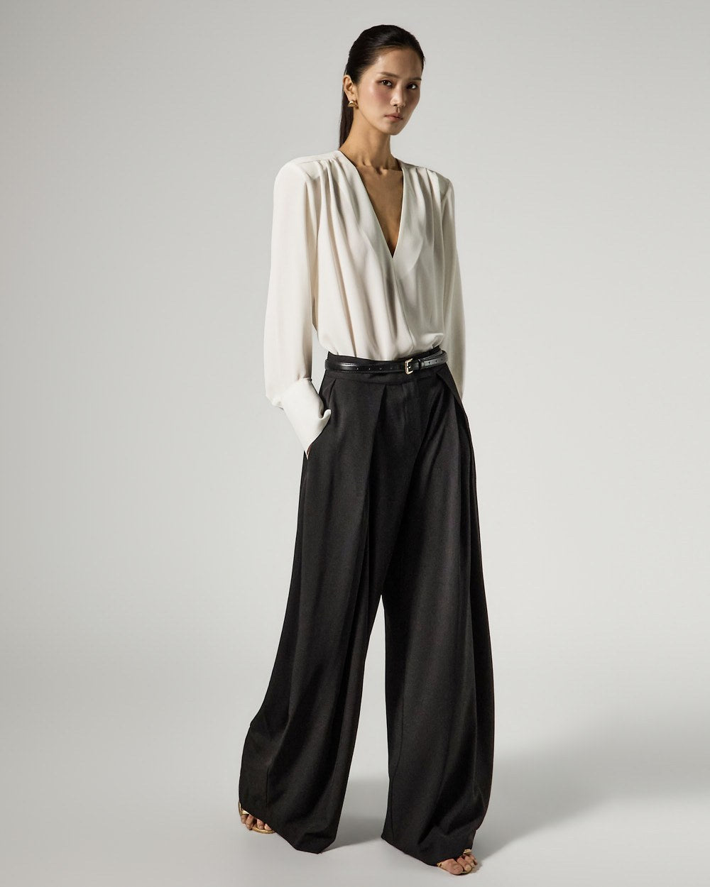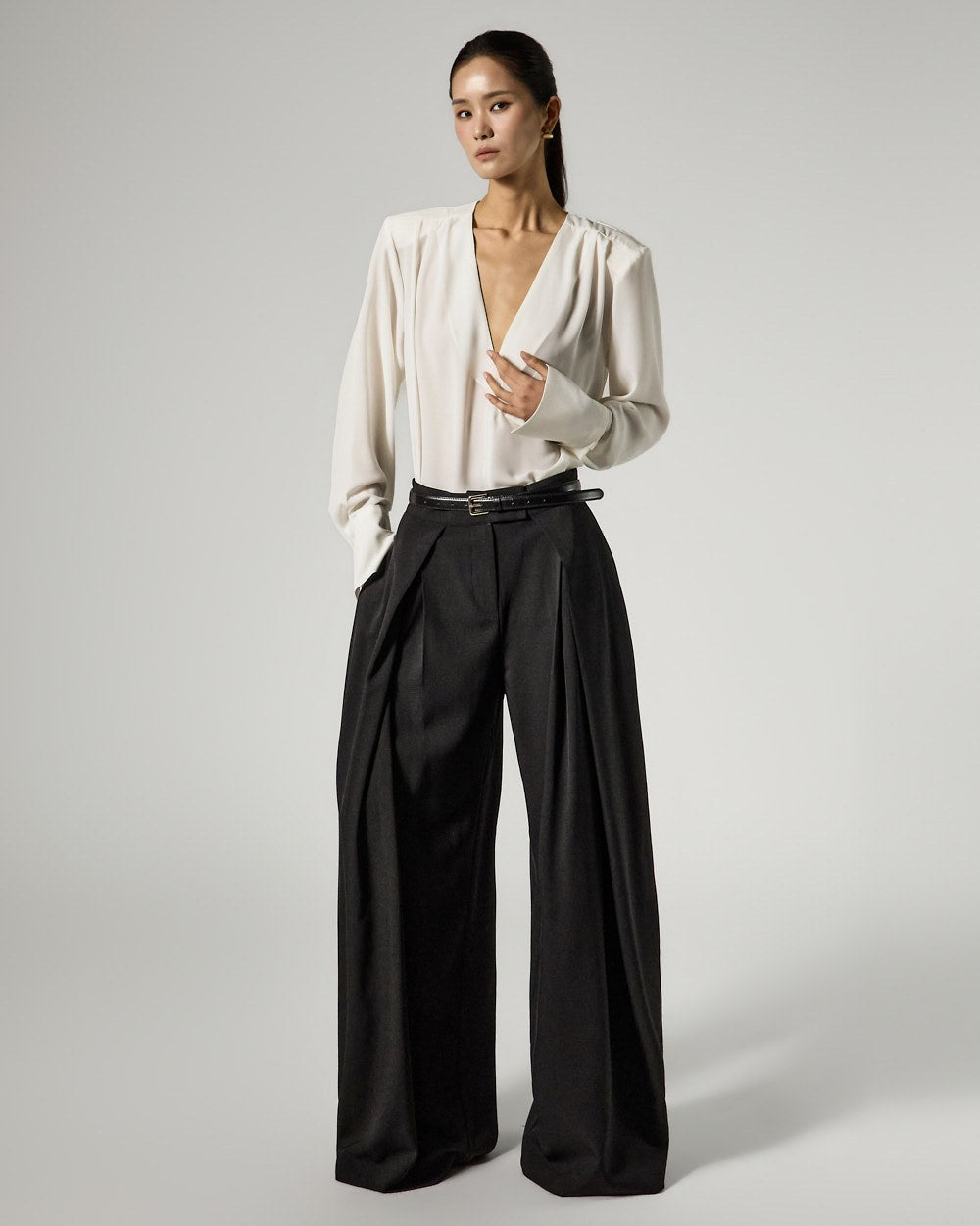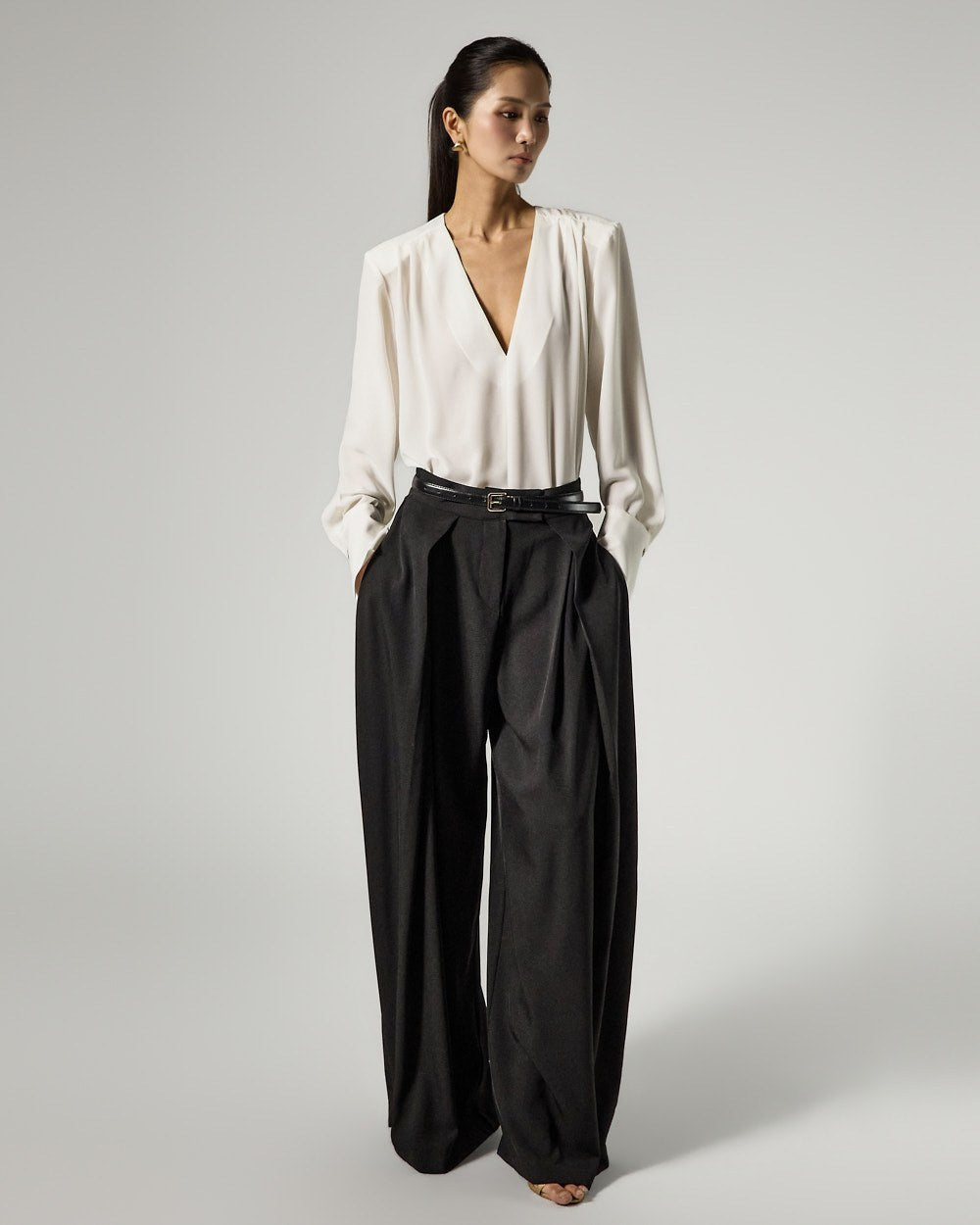 This is an asymmetrical shirred V-neck blouse with a modern vibe.