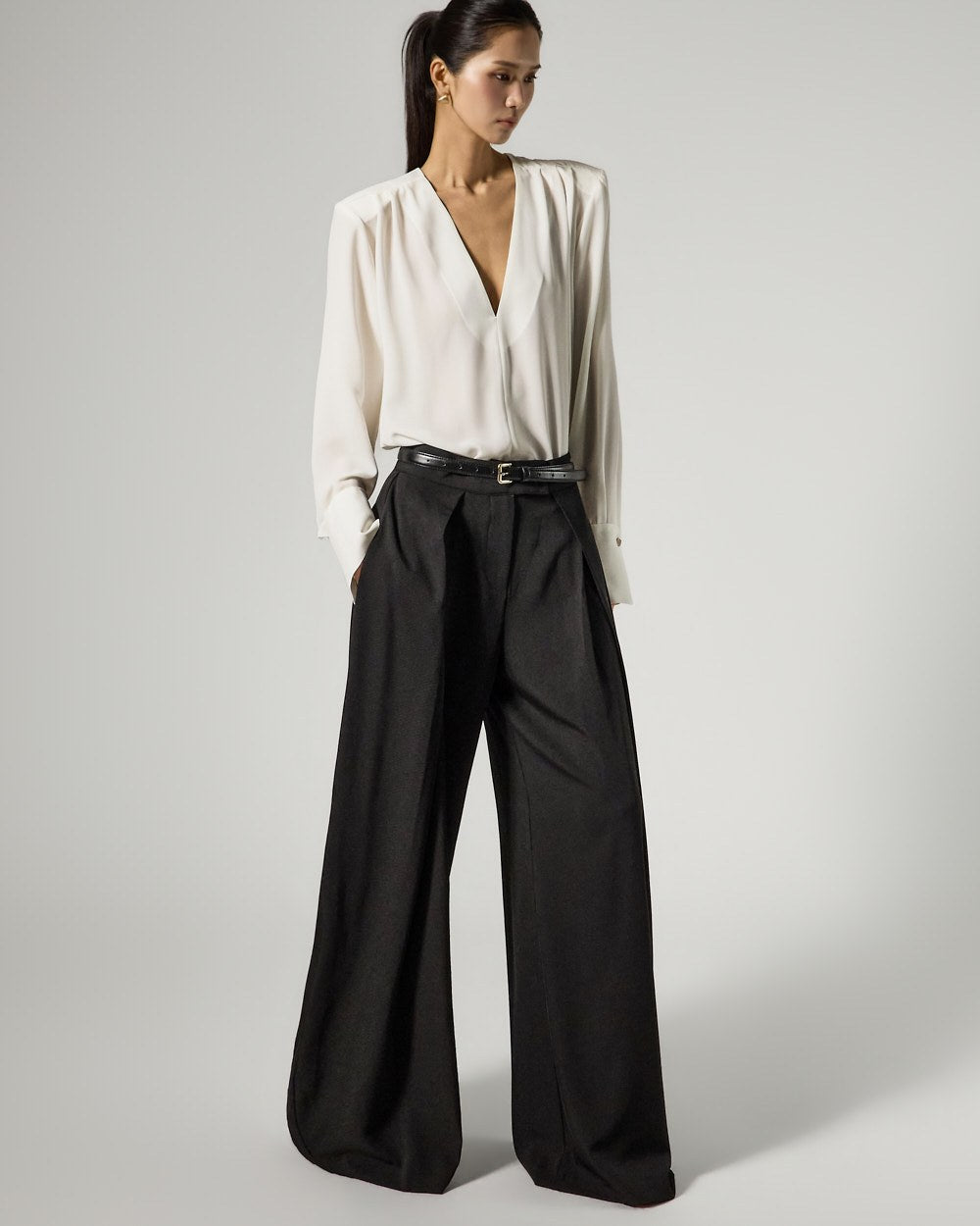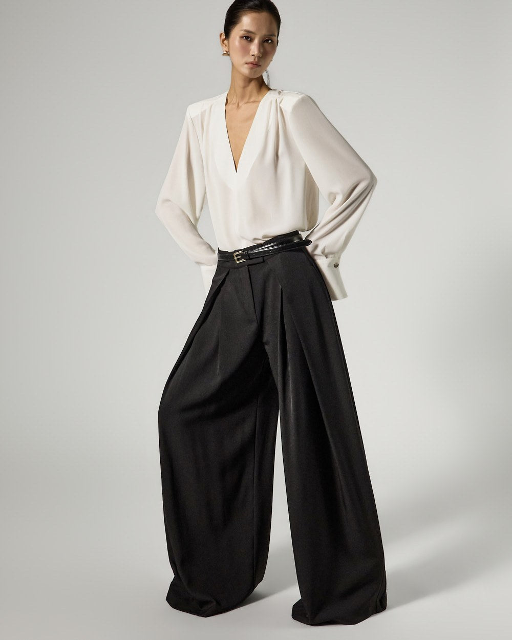 The relaxed, loose-fit silhouette drapes naturally, and the deep V-neck design creates a chic atmosphere.
