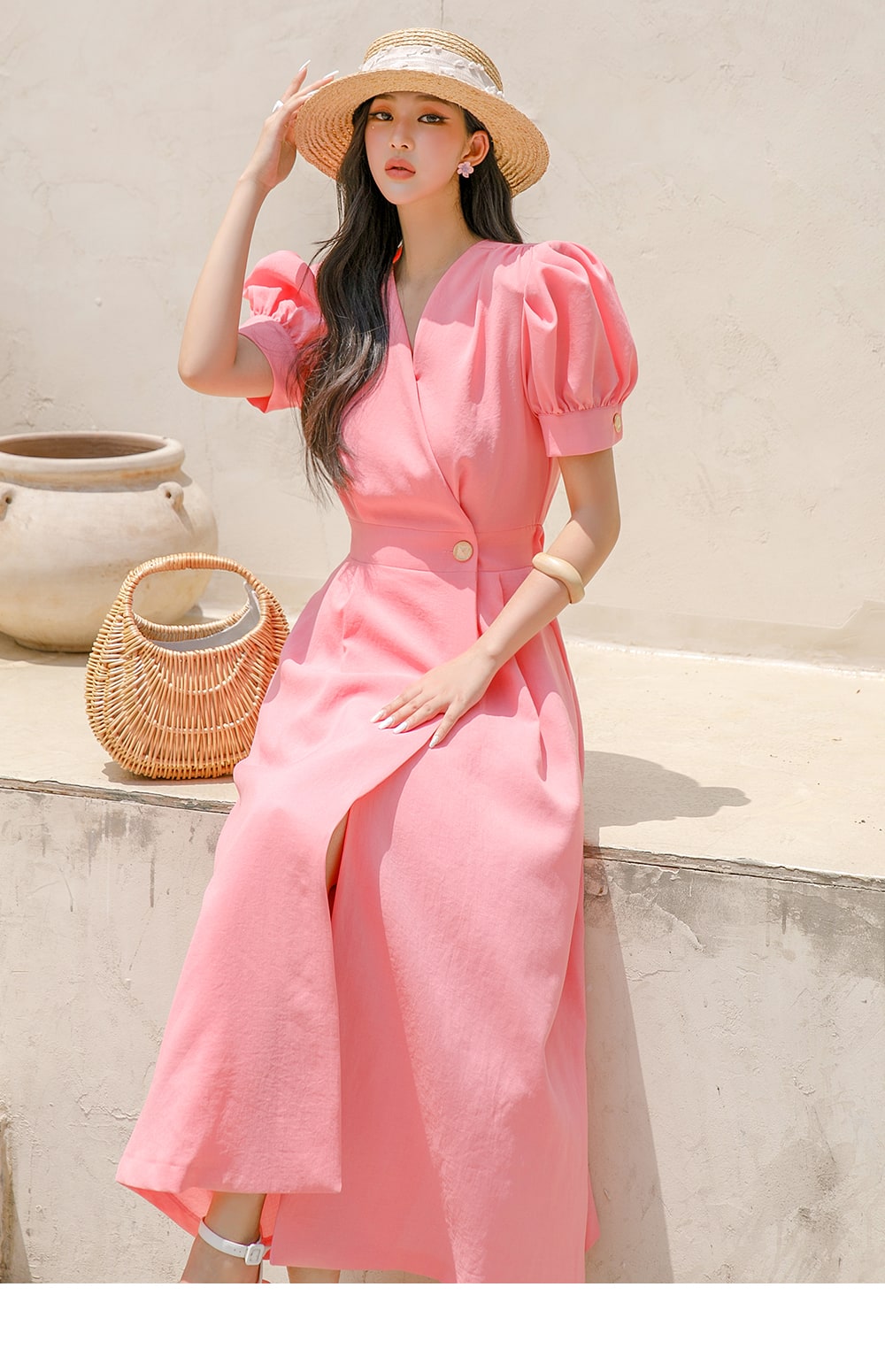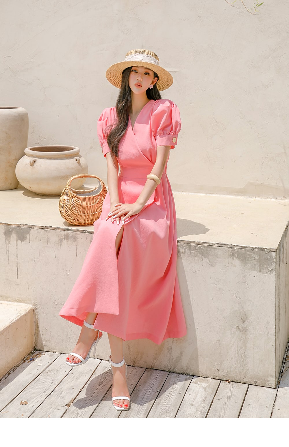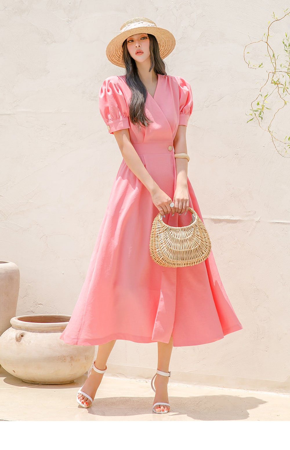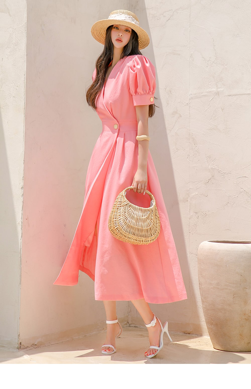 这款女性化的中长连衣裙采用柔软的涤纶制成,