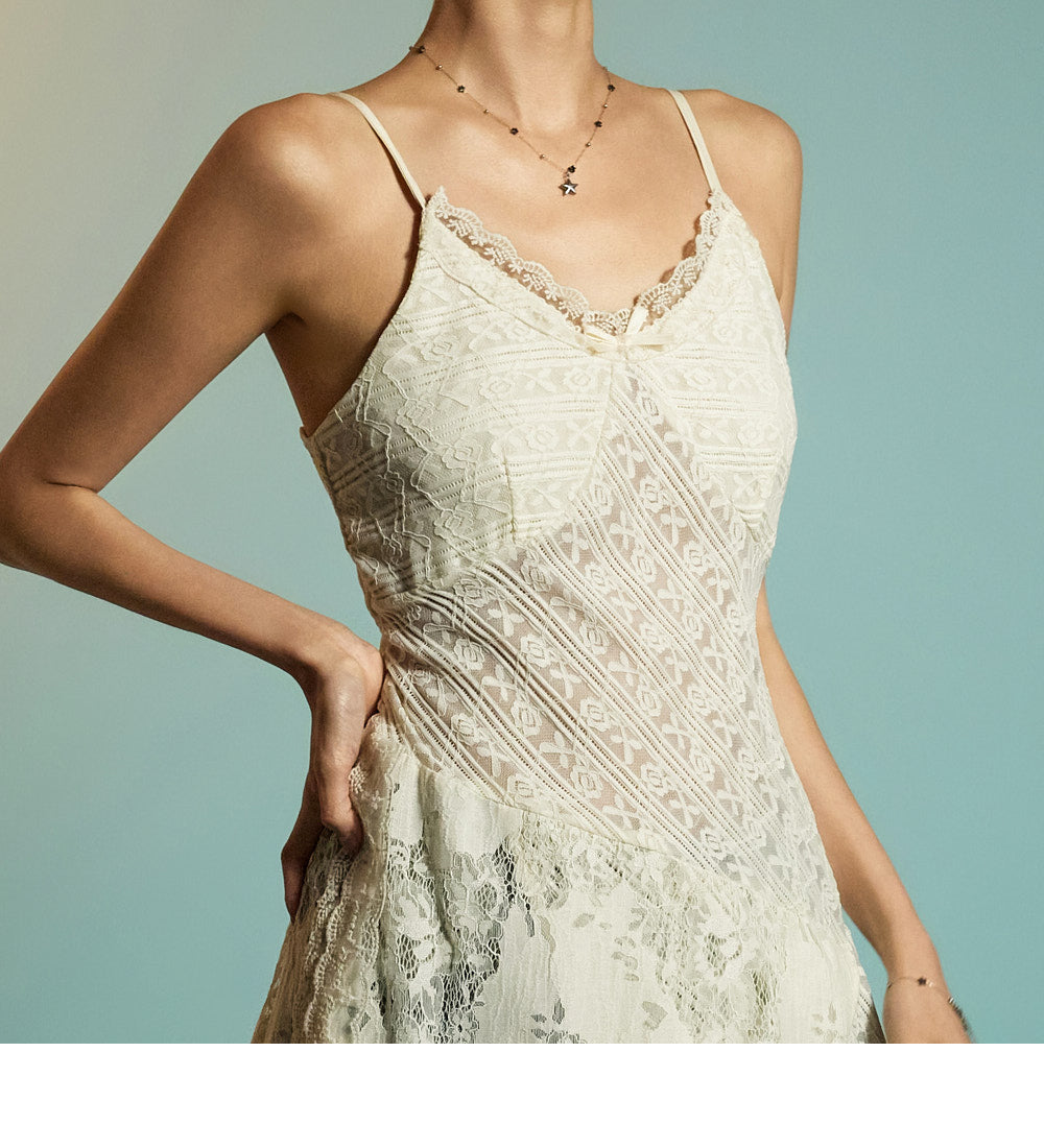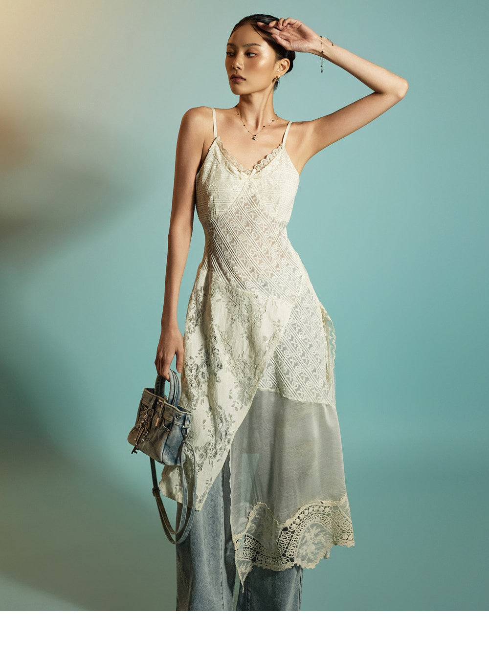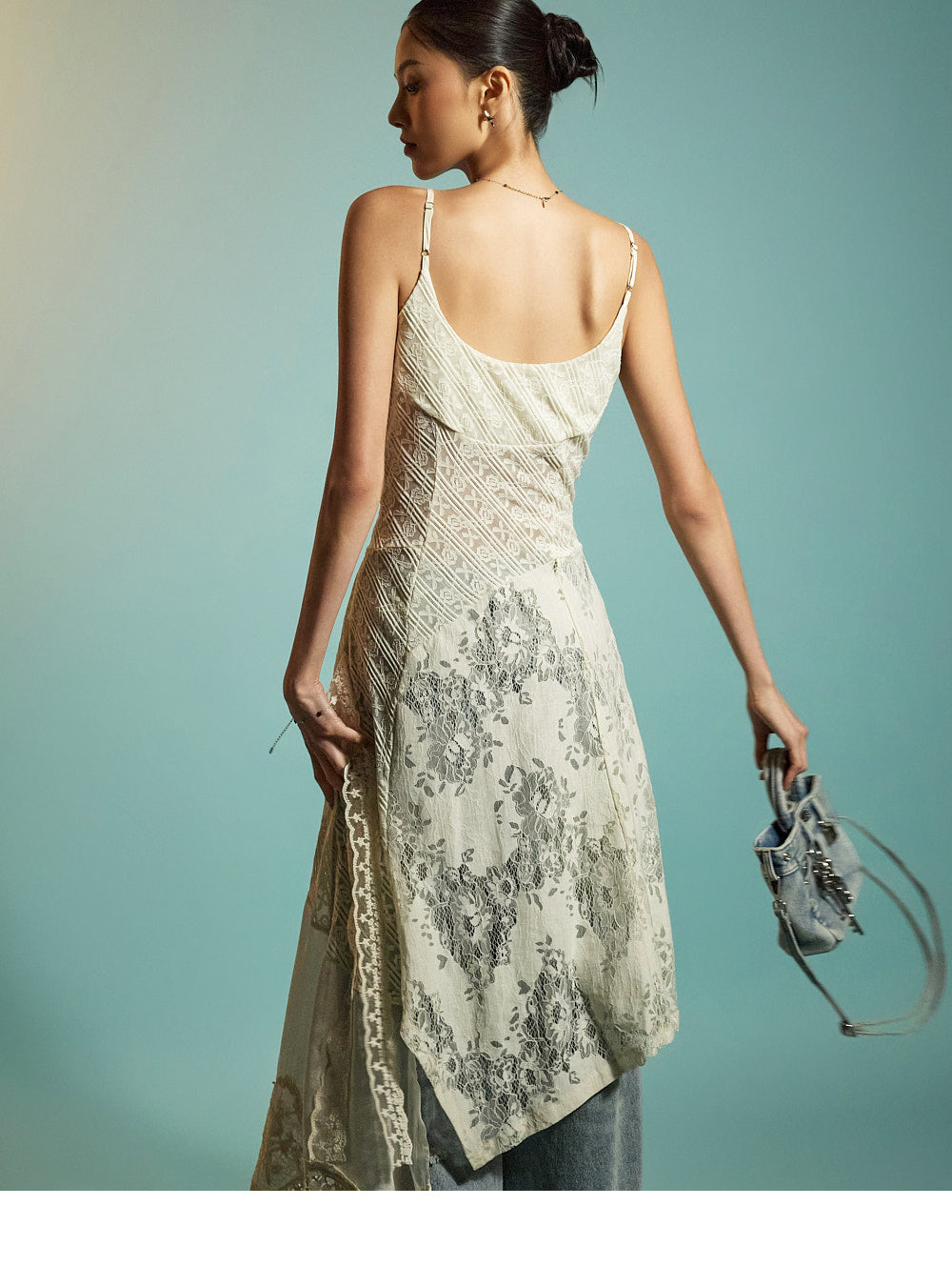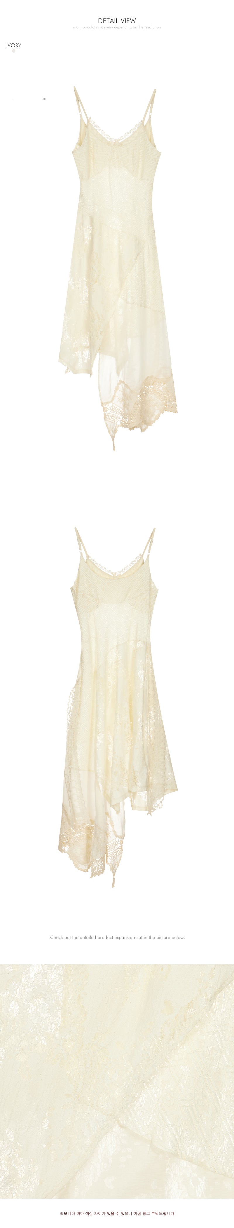 This is an asymmetrical lace dress that exudes a lovely and feminine charm.