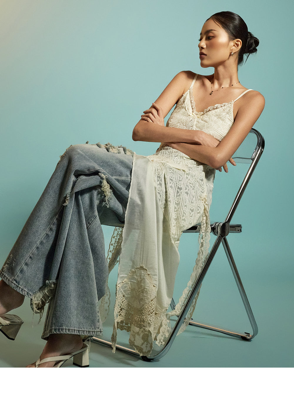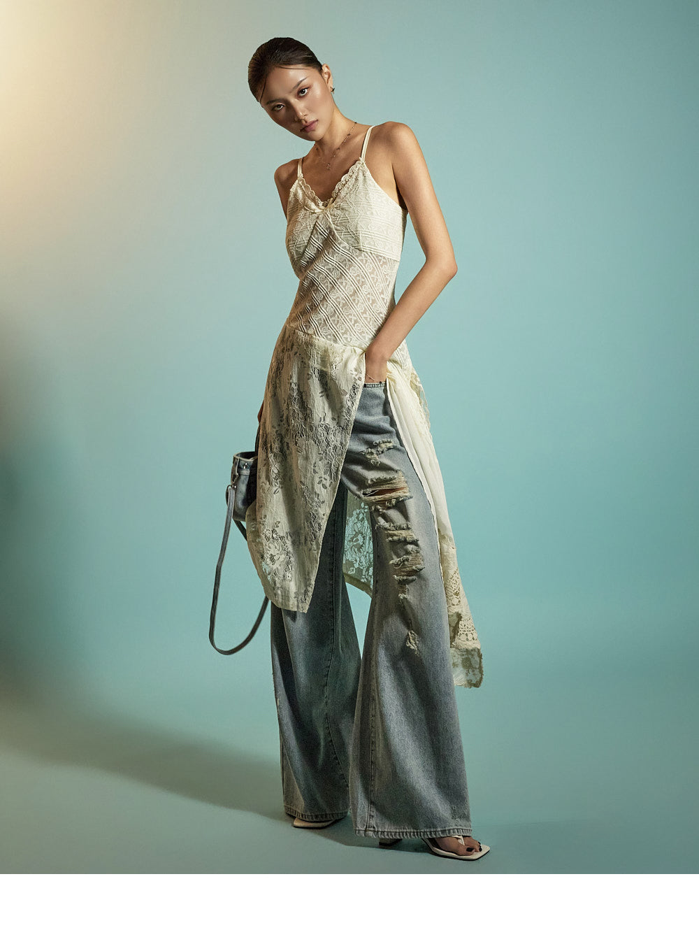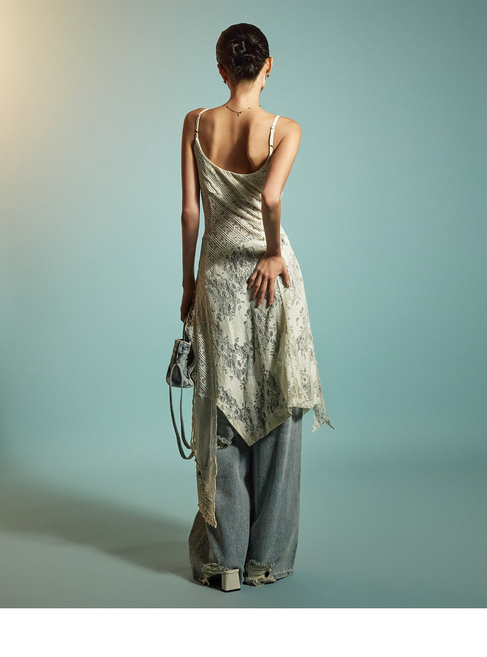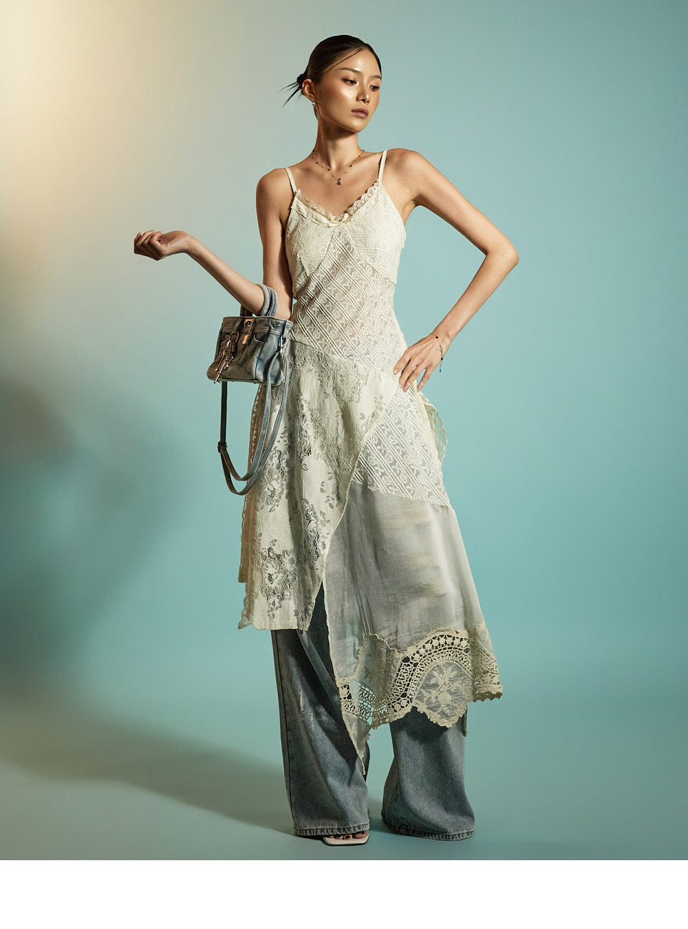 This is an asymmetrical lace dress that exudes a lovely and feminine charm.