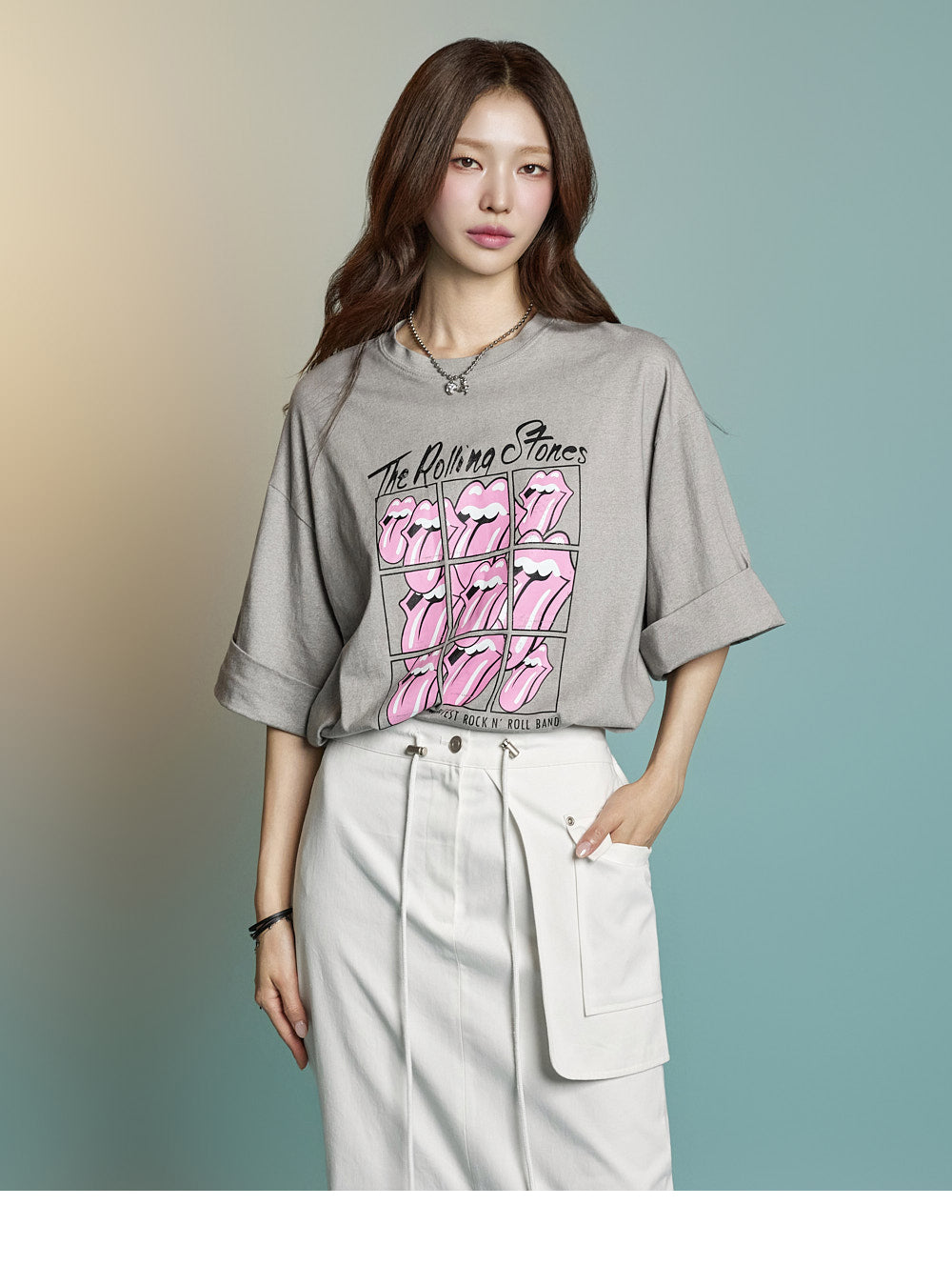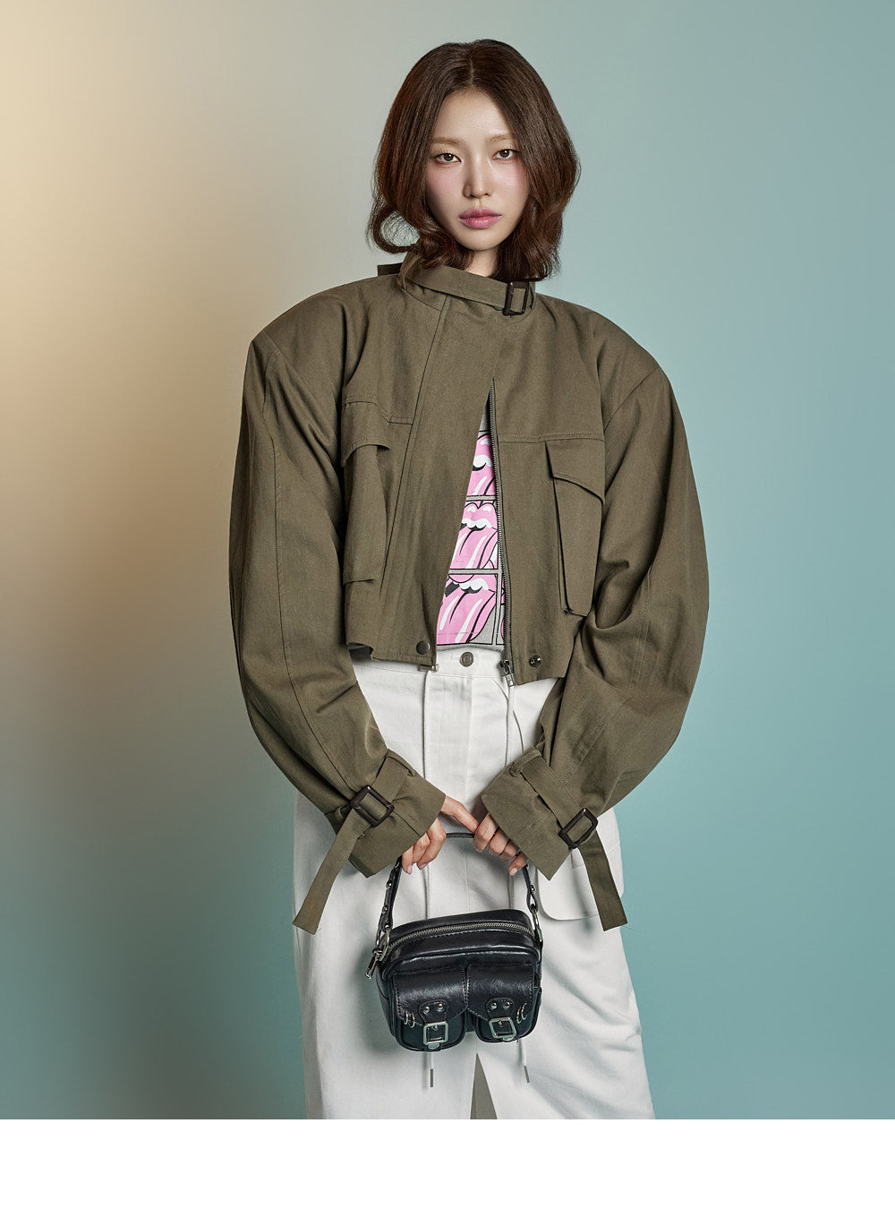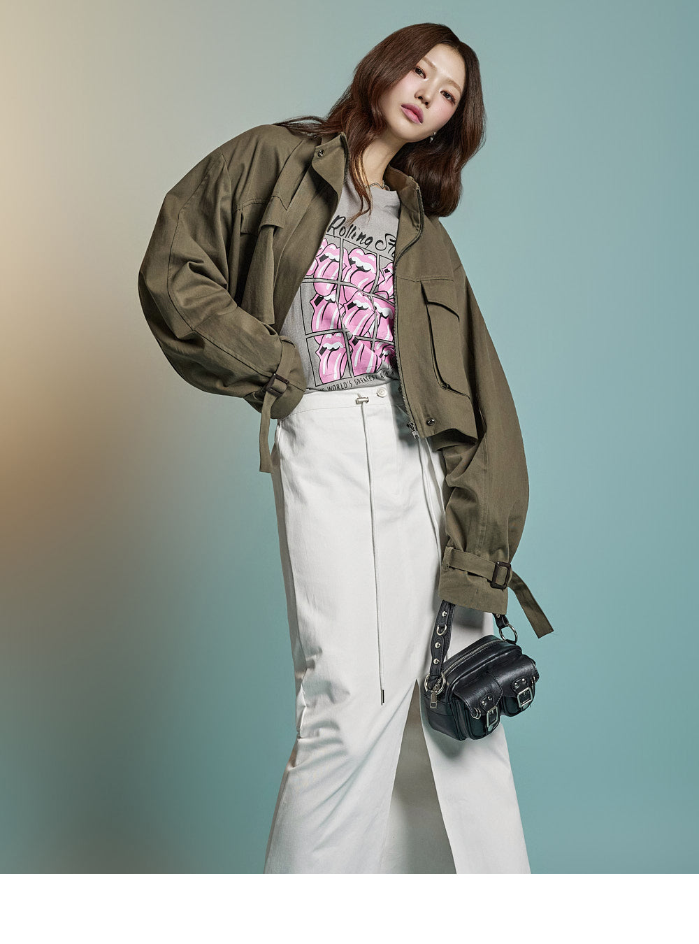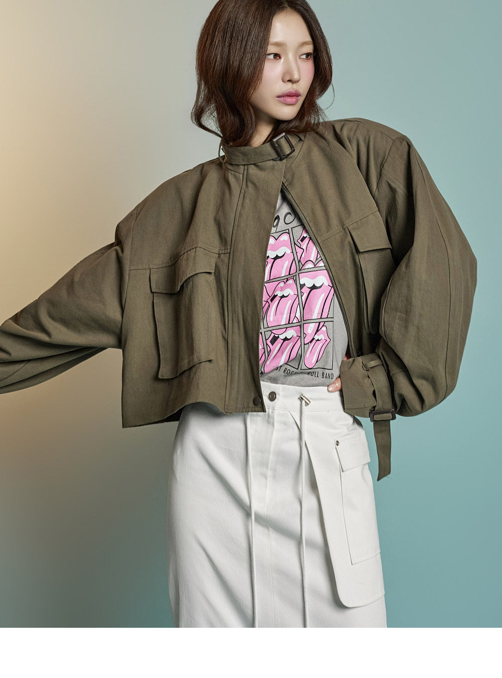 while rolled sleeve details create a natural look.