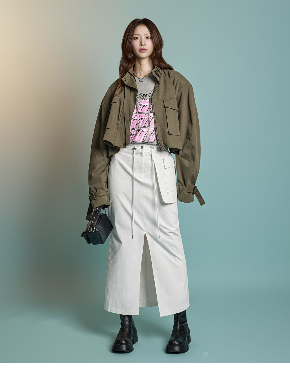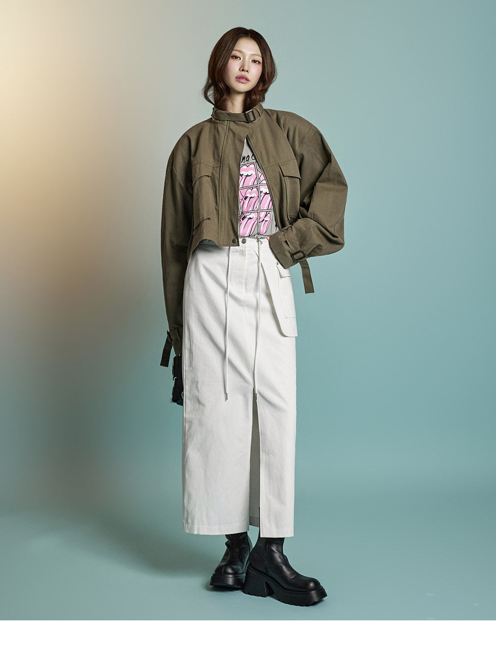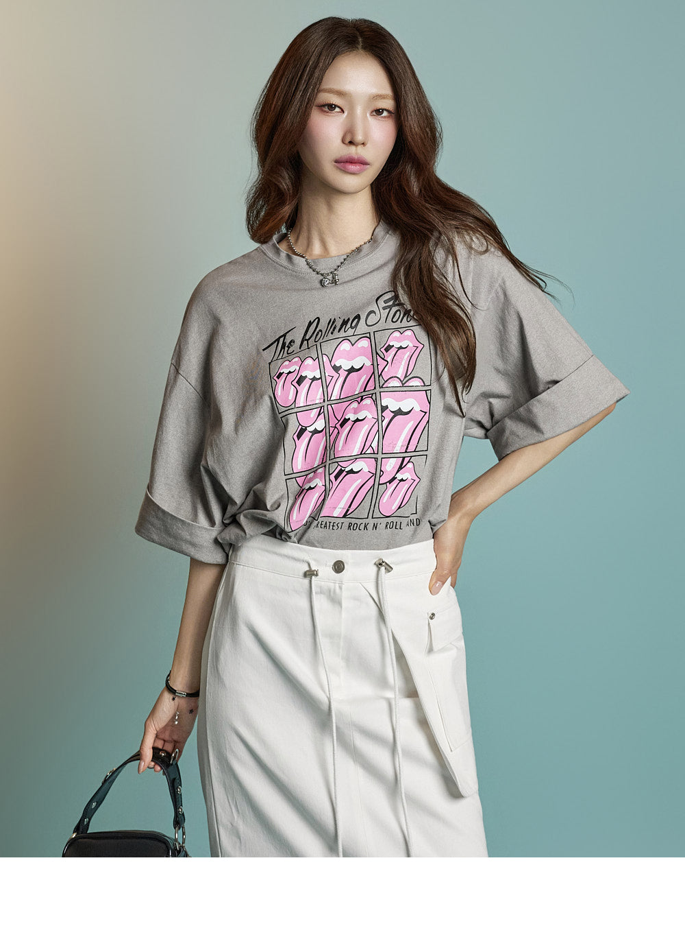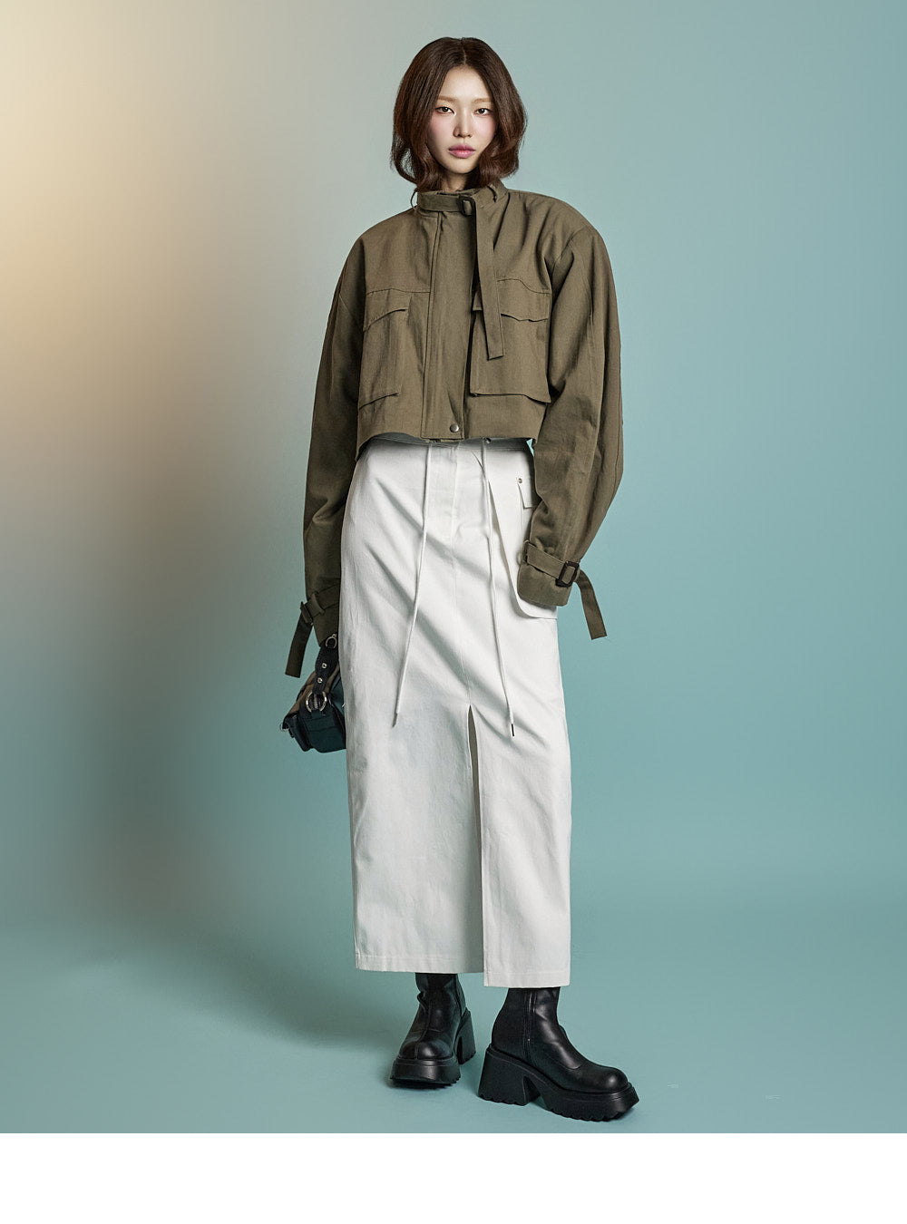 while rolled sleeve details create a natural look.