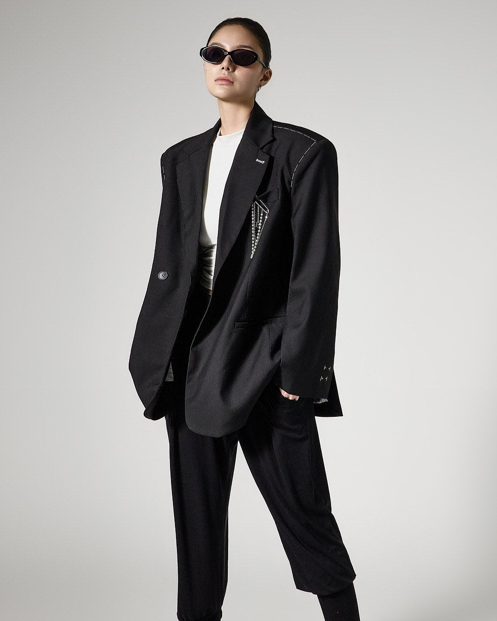 The semi-cropped length and slim fit line neatly accentuate the body line, creating a stylish look.