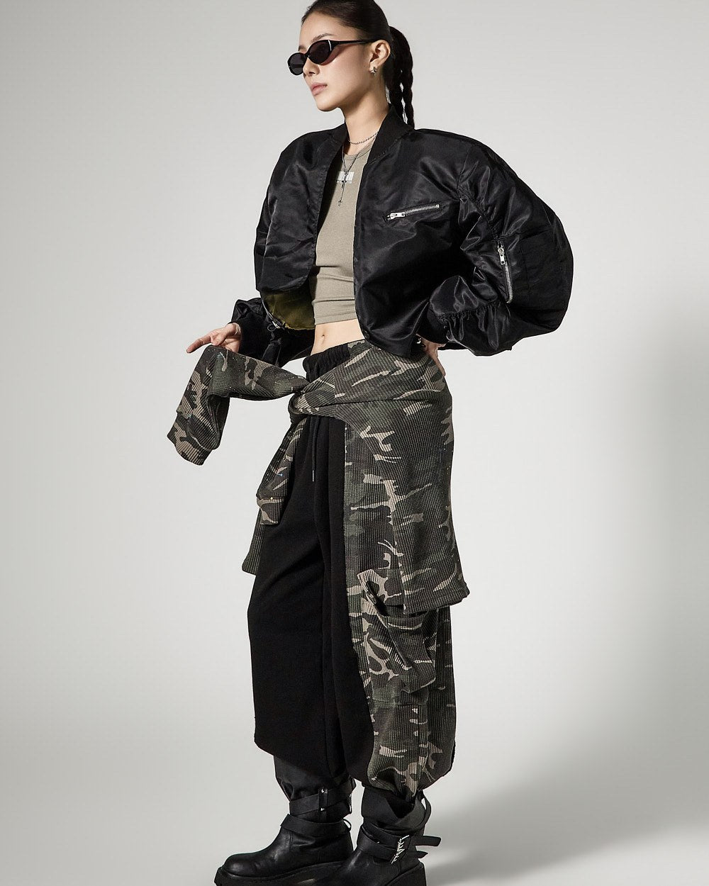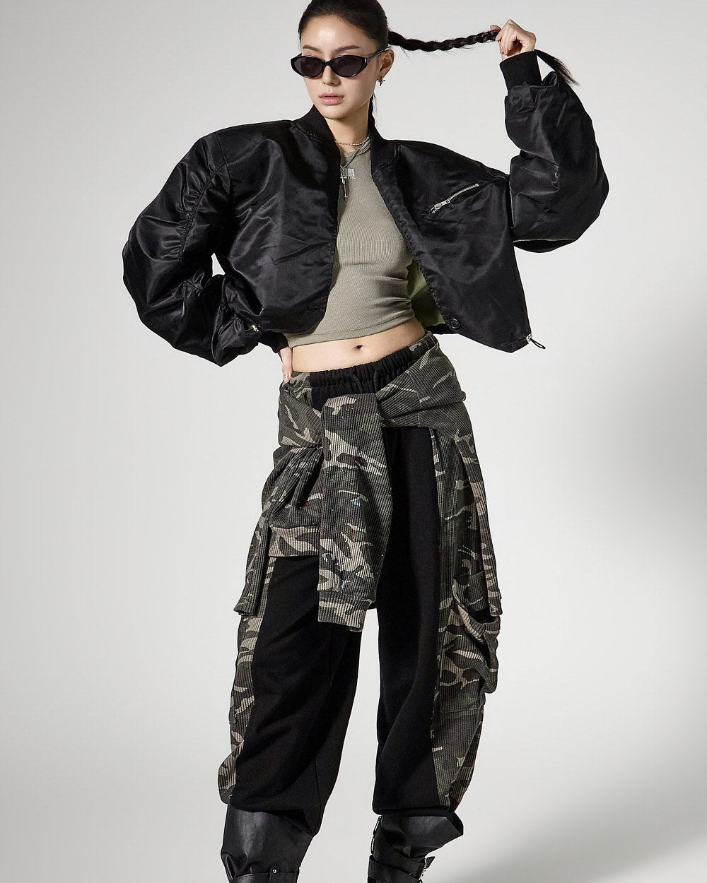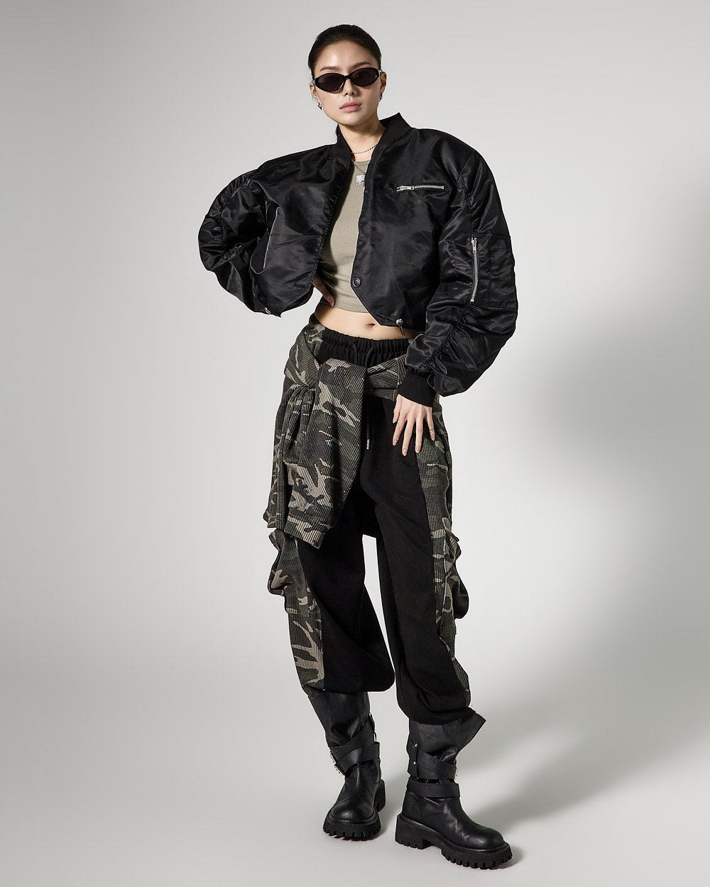 The cropped length creates a trendy silhouette,
