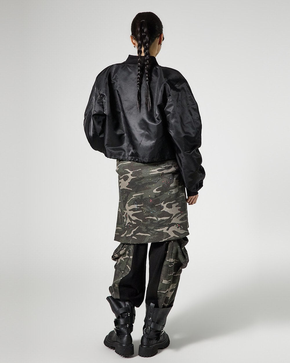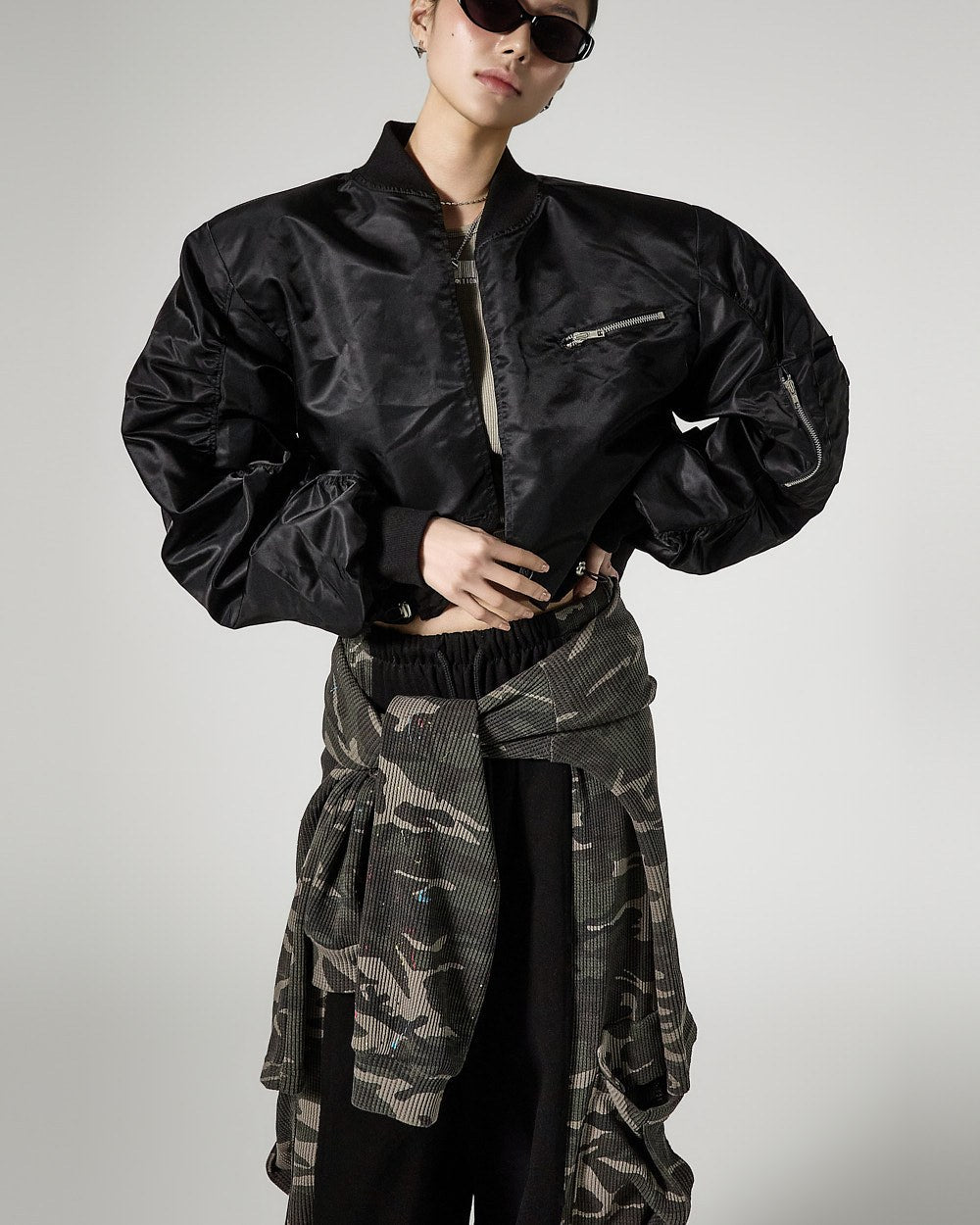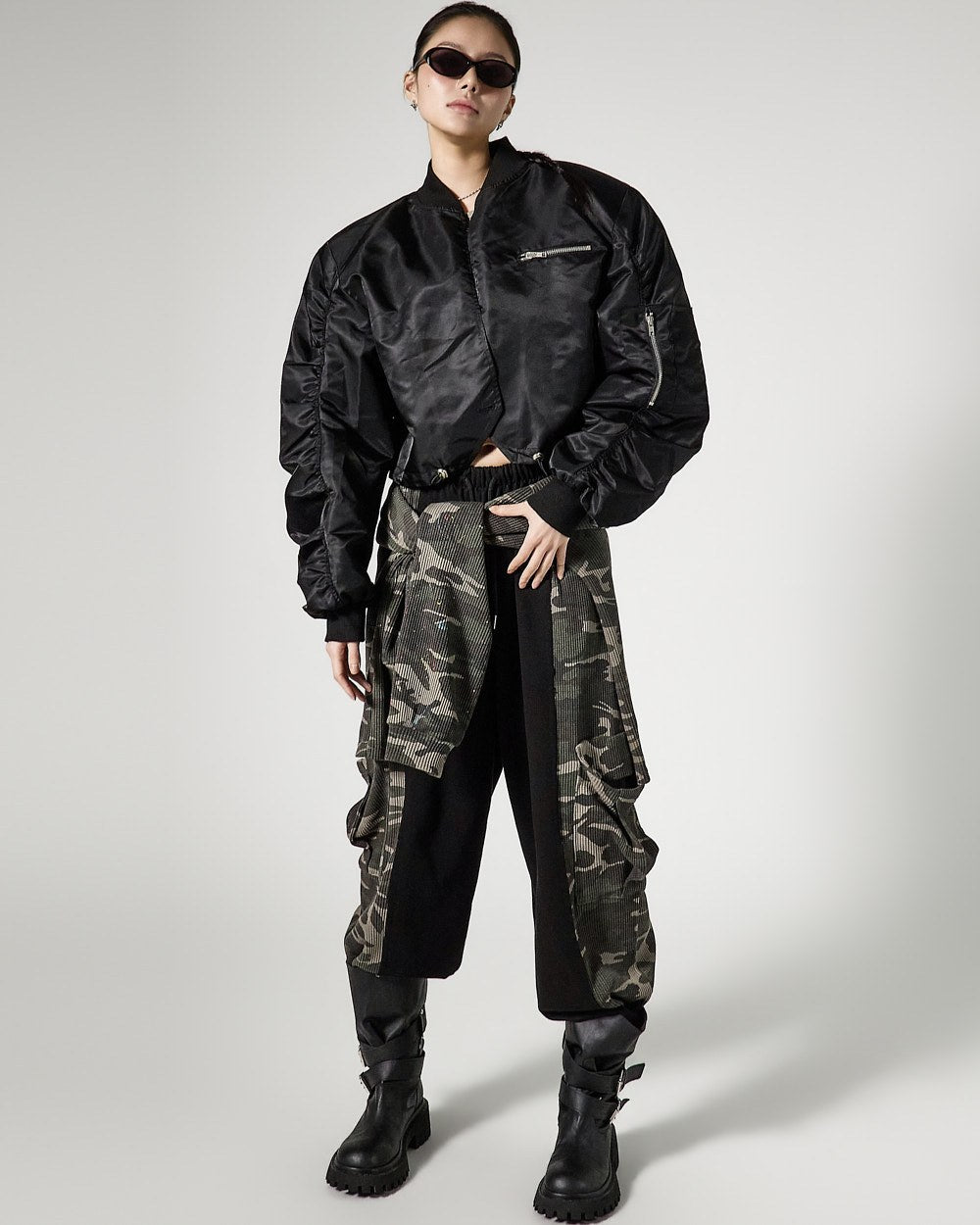 The cropped length creates a trendy silhouette,