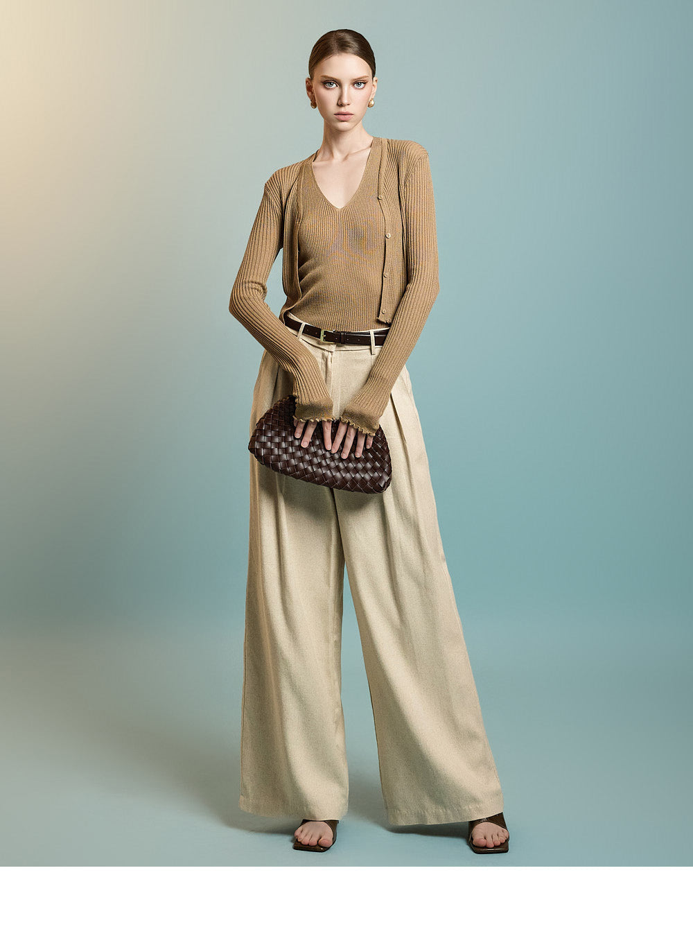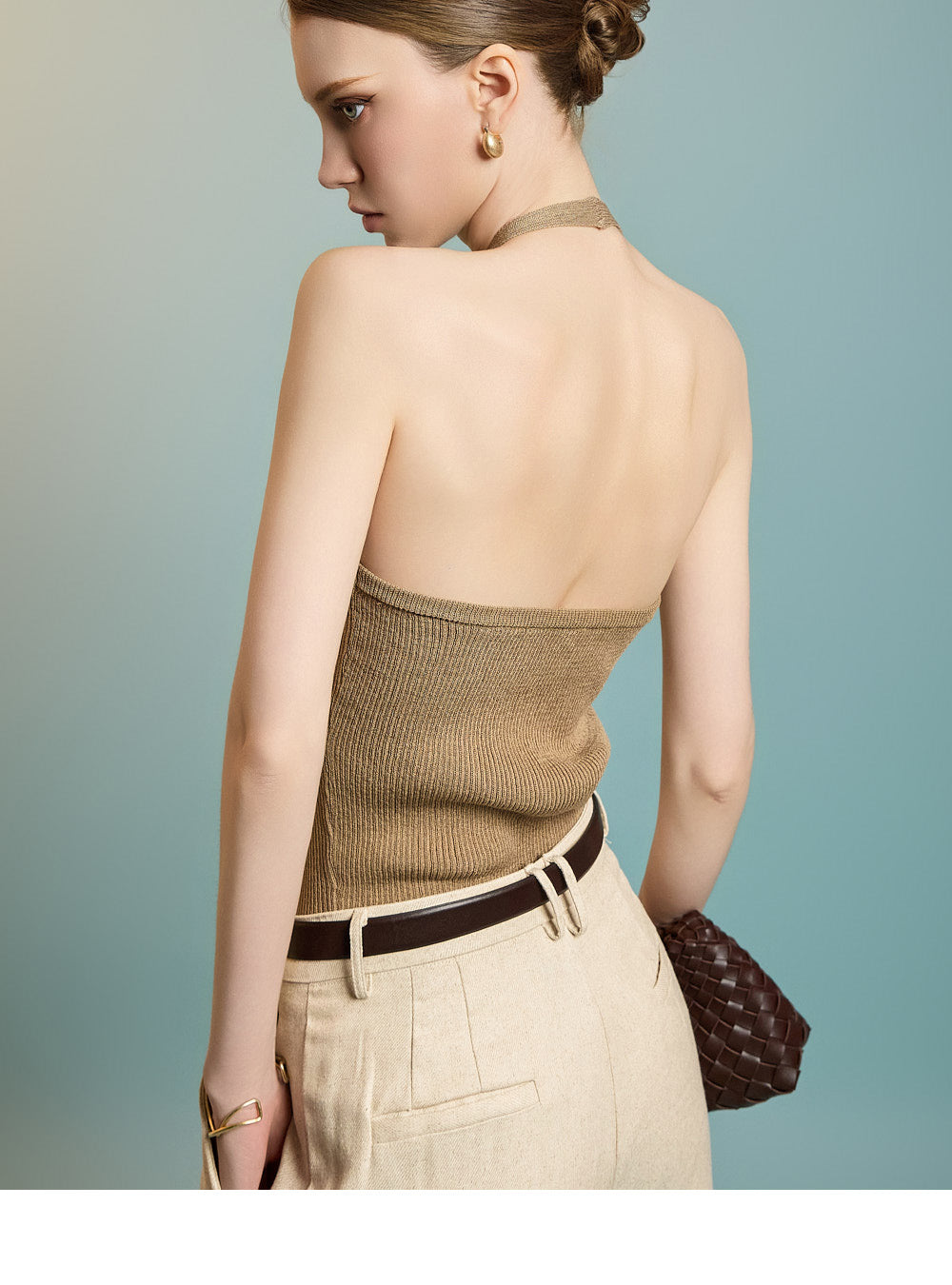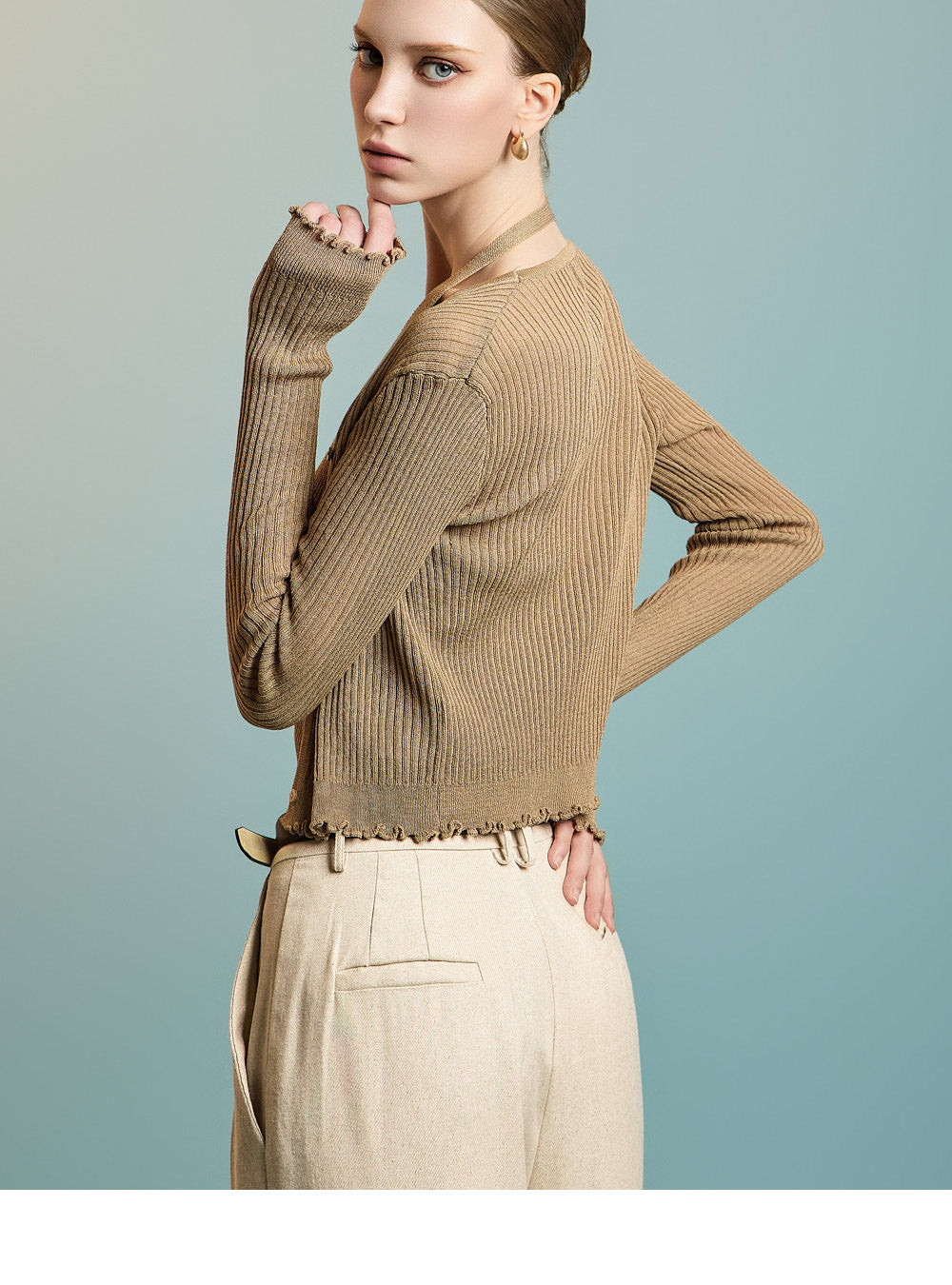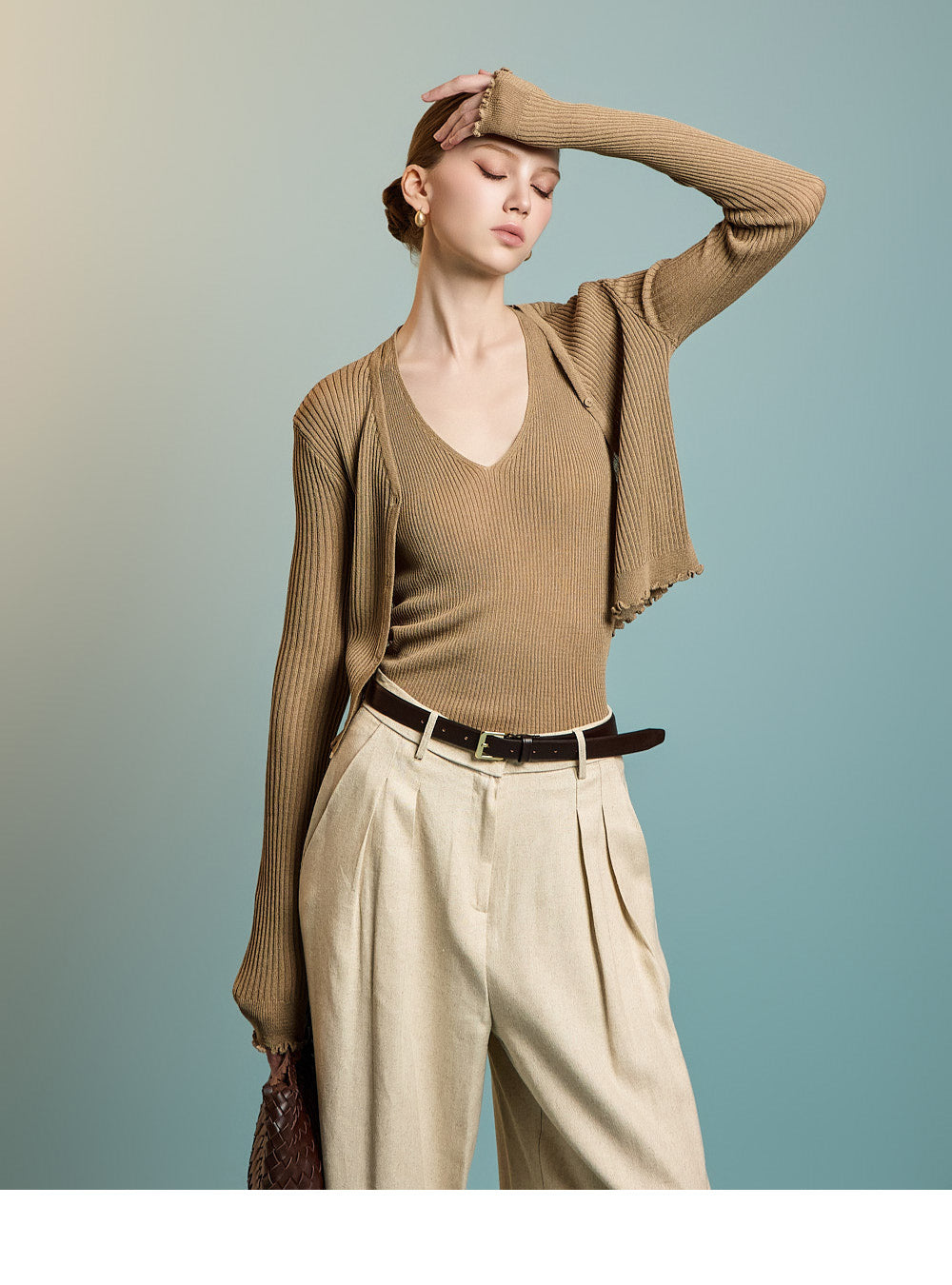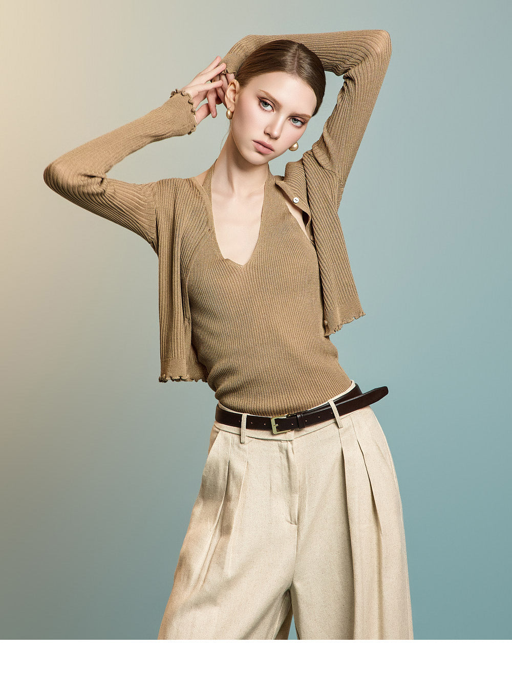 这是一件休闲的露背开衫套装,由轻质材料制成