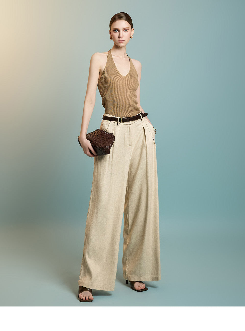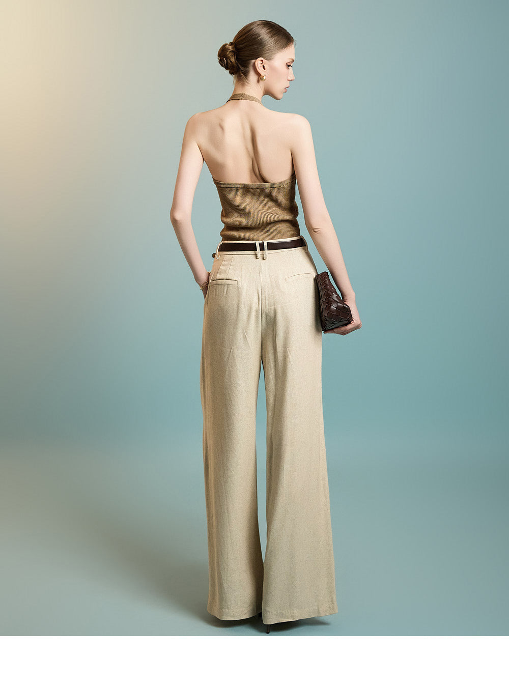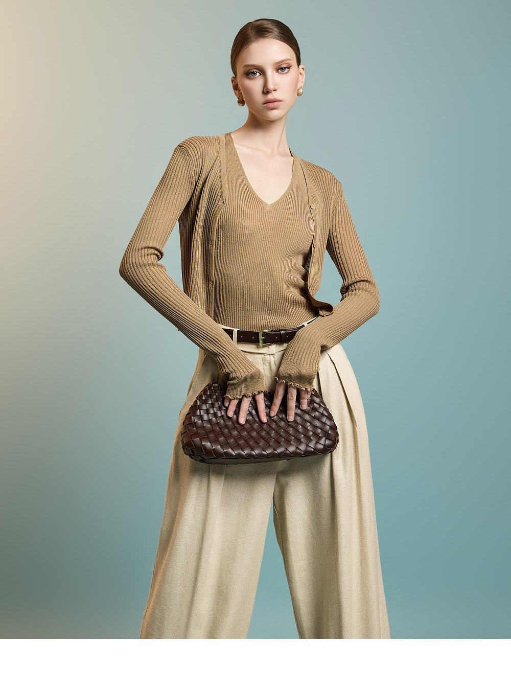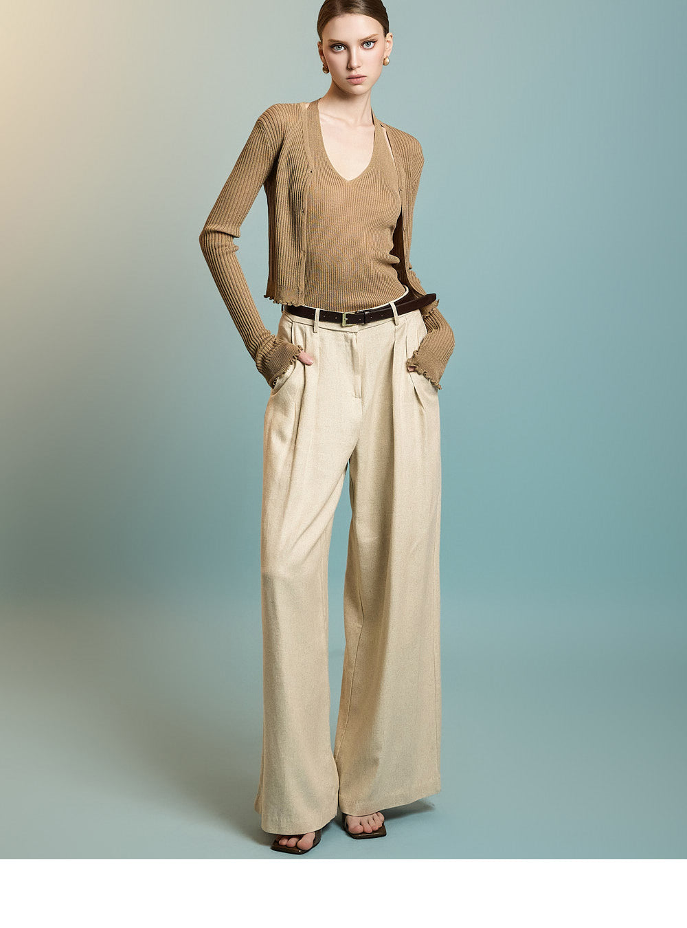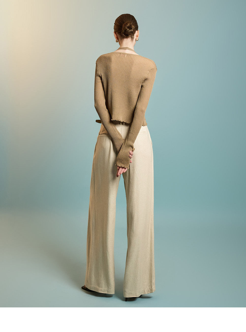 这是一件休闲的露背开衫套装,由轻质材料制成