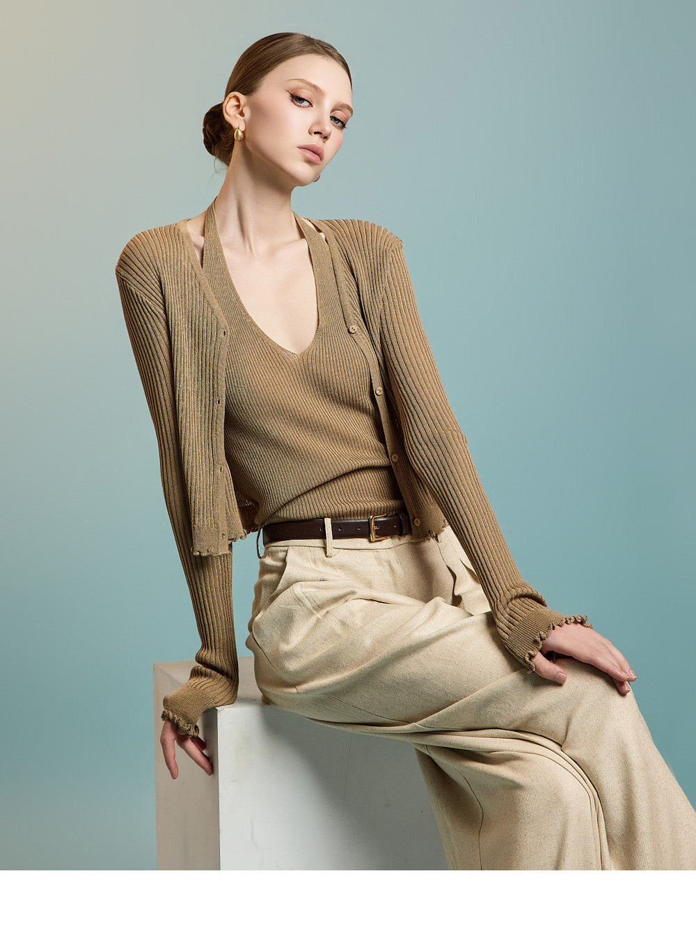 该套装包括一件修身挂脖无袖上衣和一件前扣开衫,