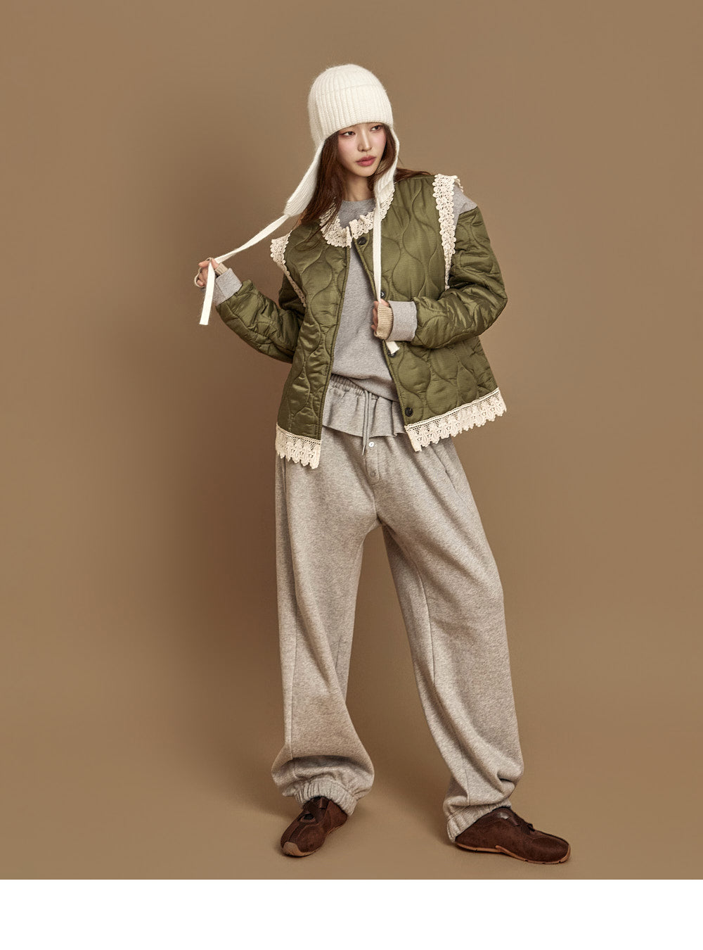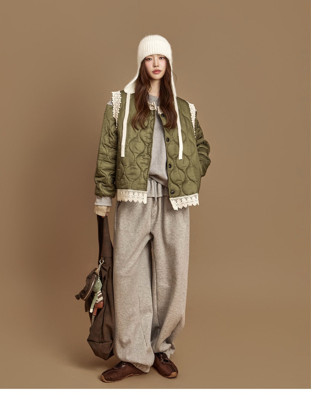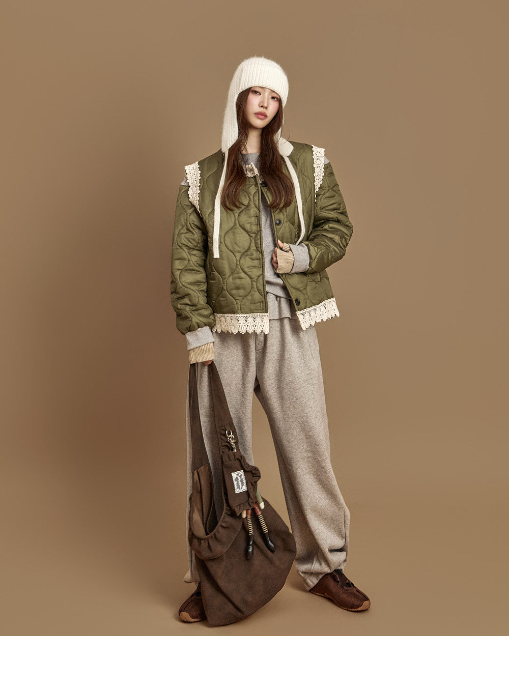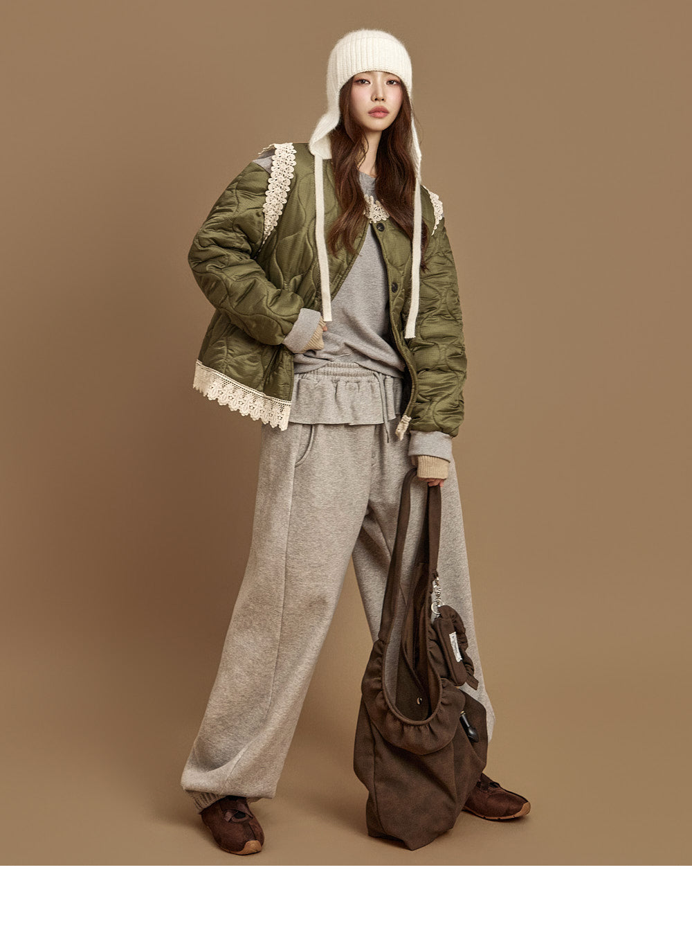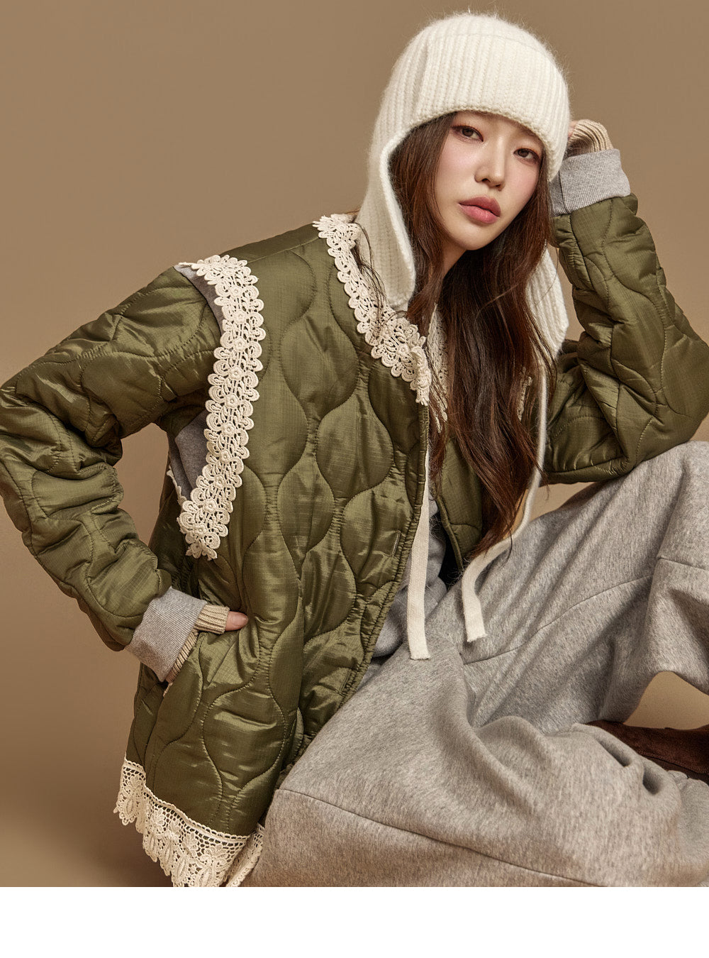 The 171cm model is wearing size ONE in the KHAKI color.