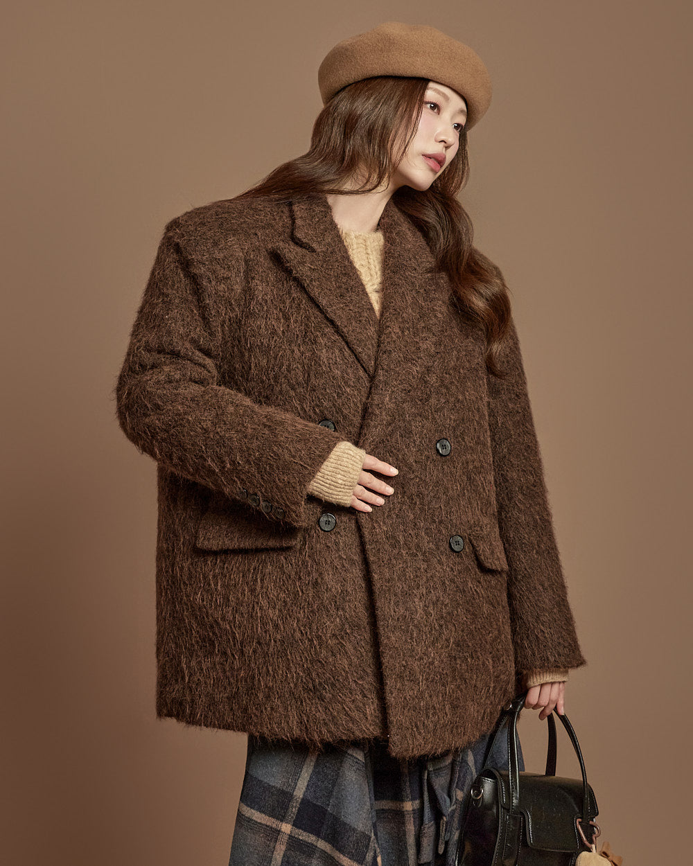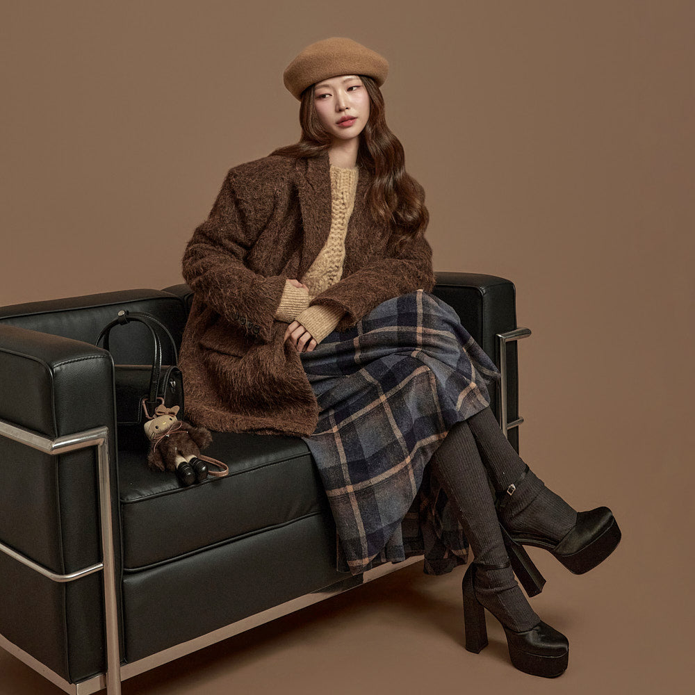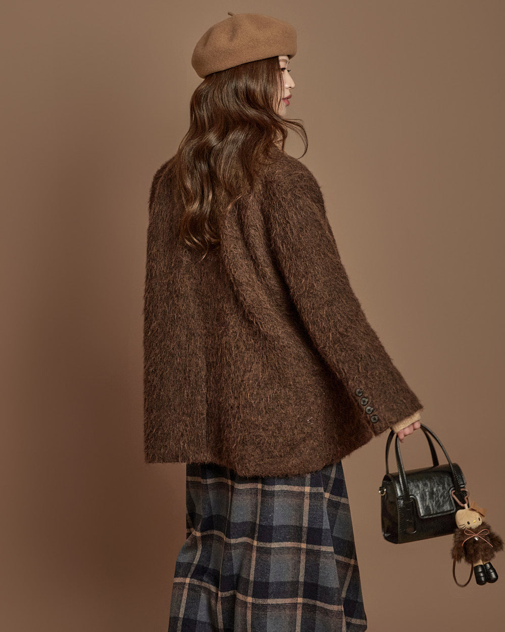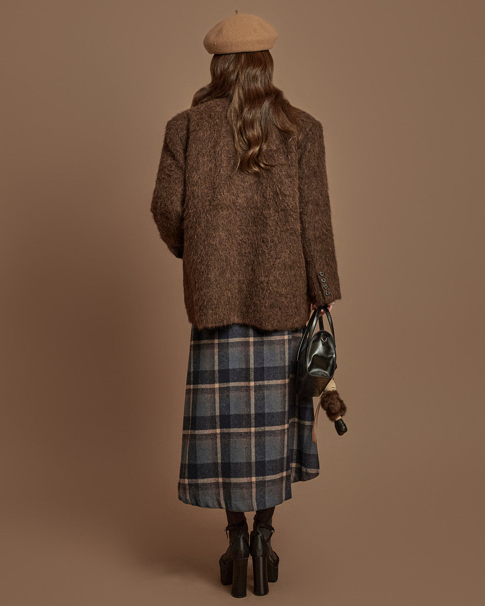 The 171cm model is wearing size one, DARK BROWN.