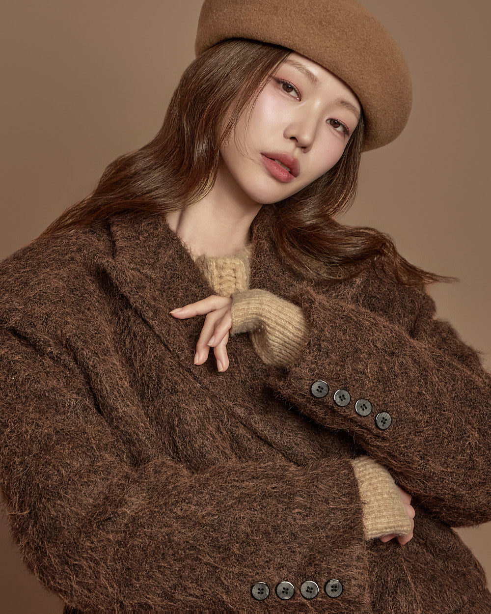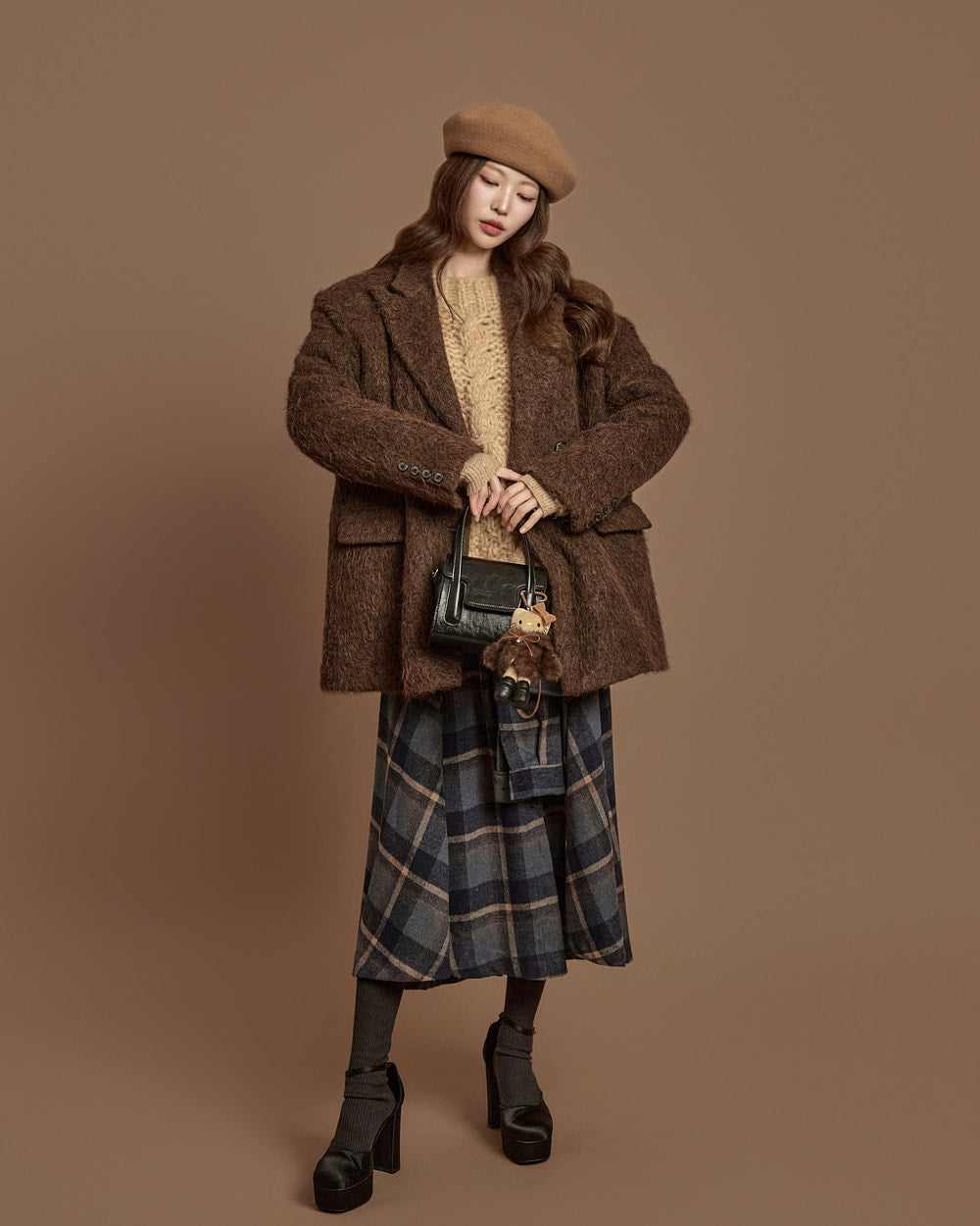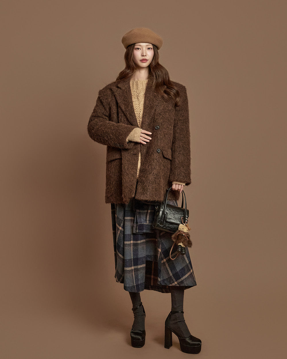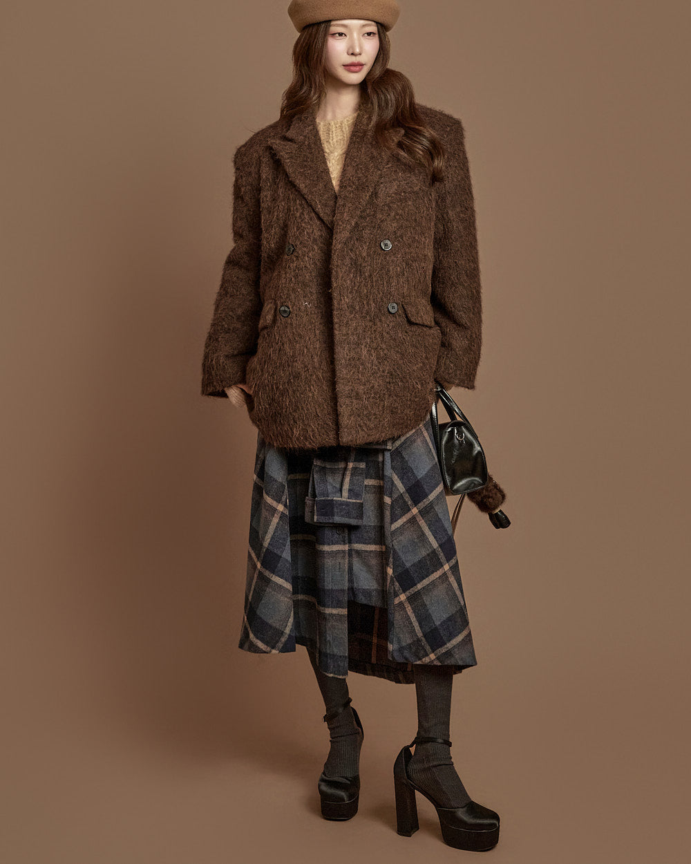 The 171cm model is wearing size one, DARK BROWN.