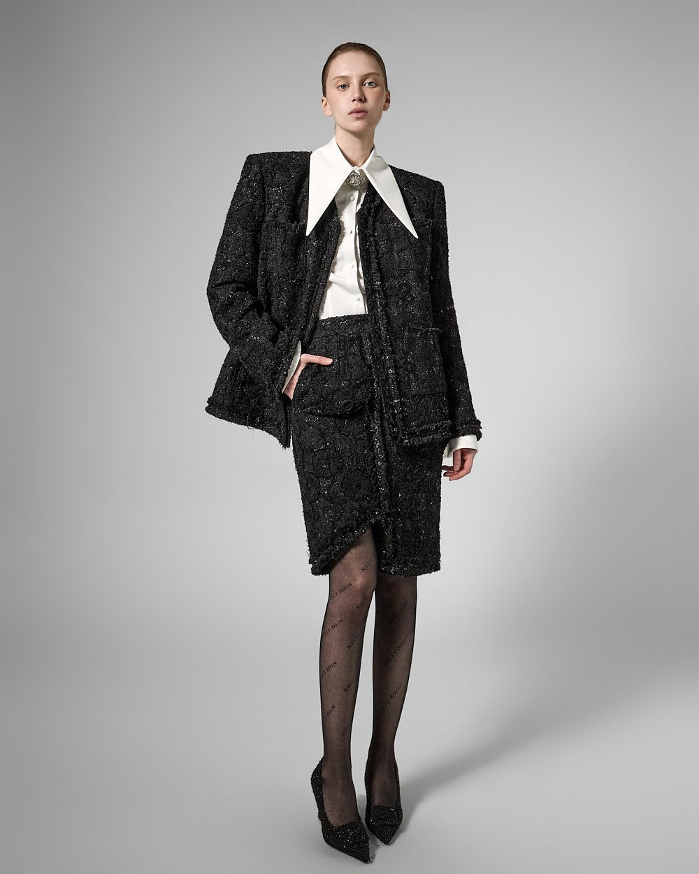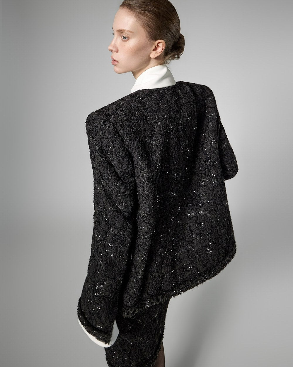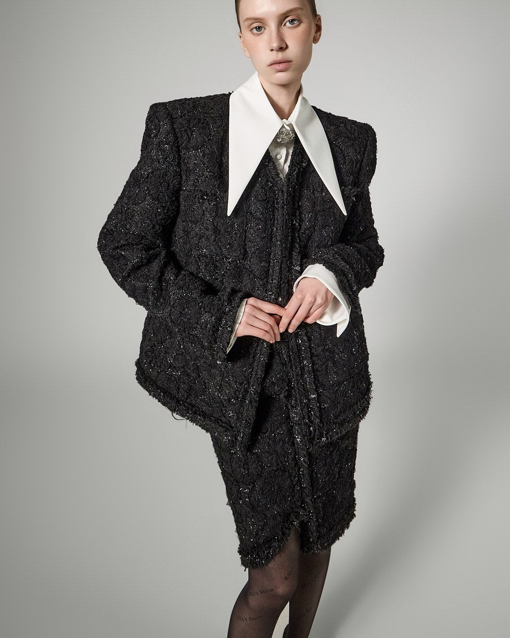 身高 174 厘米的模特穿着黑色 F 码的衣服。