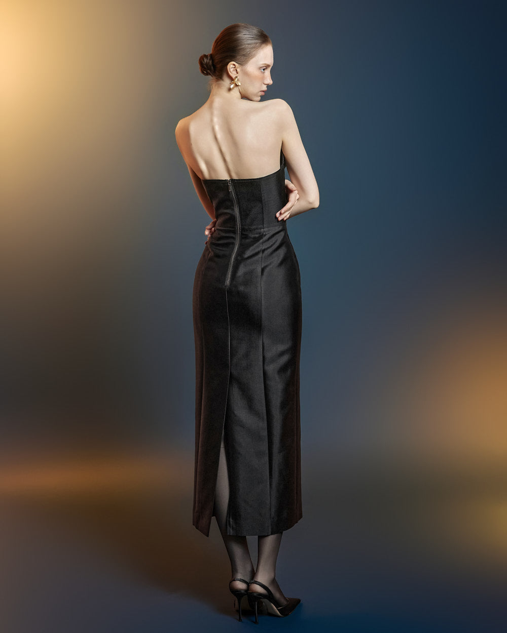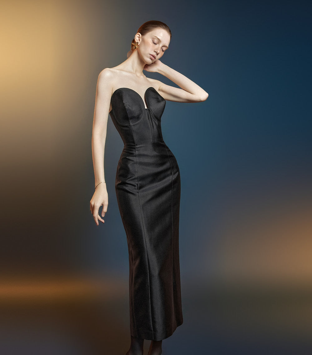 这是一件修身连衣裙,具有优雅的轮廓。