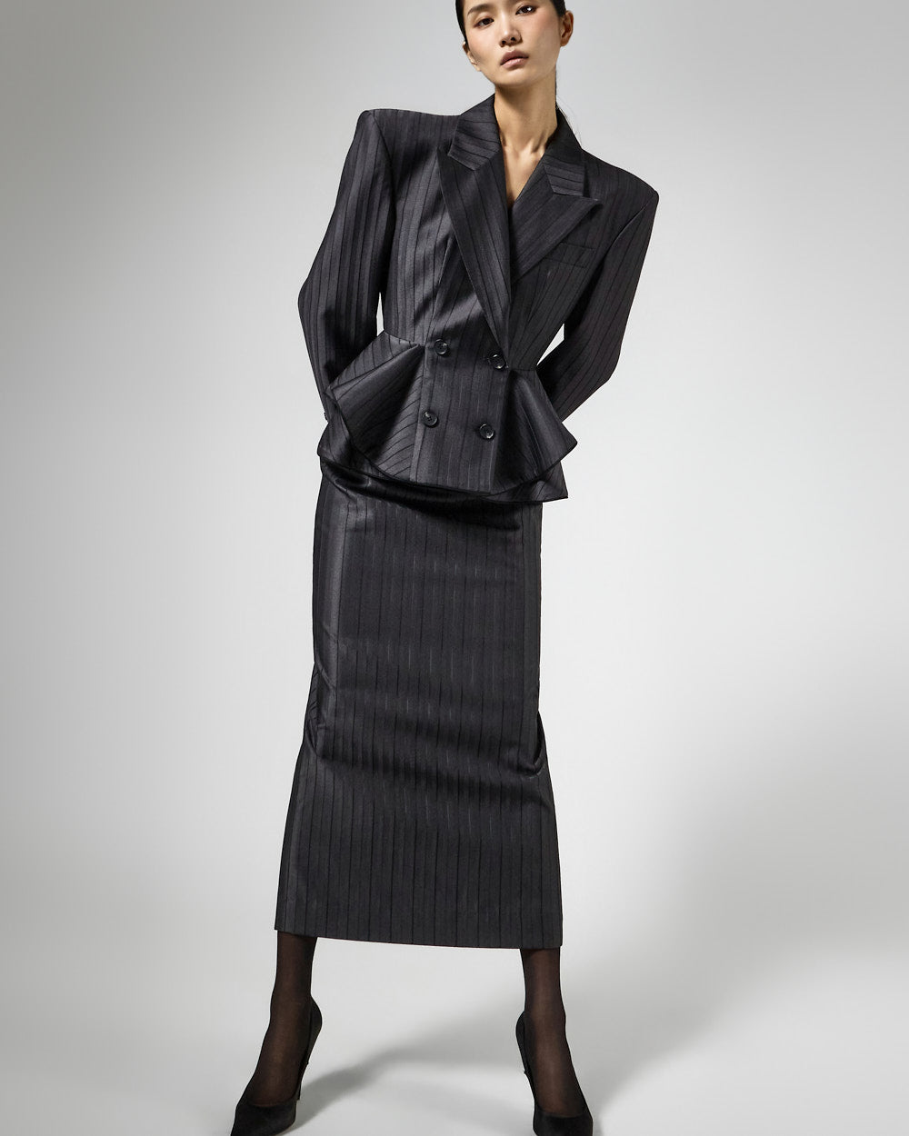 肩部垫高设计增加了廓形的体积,