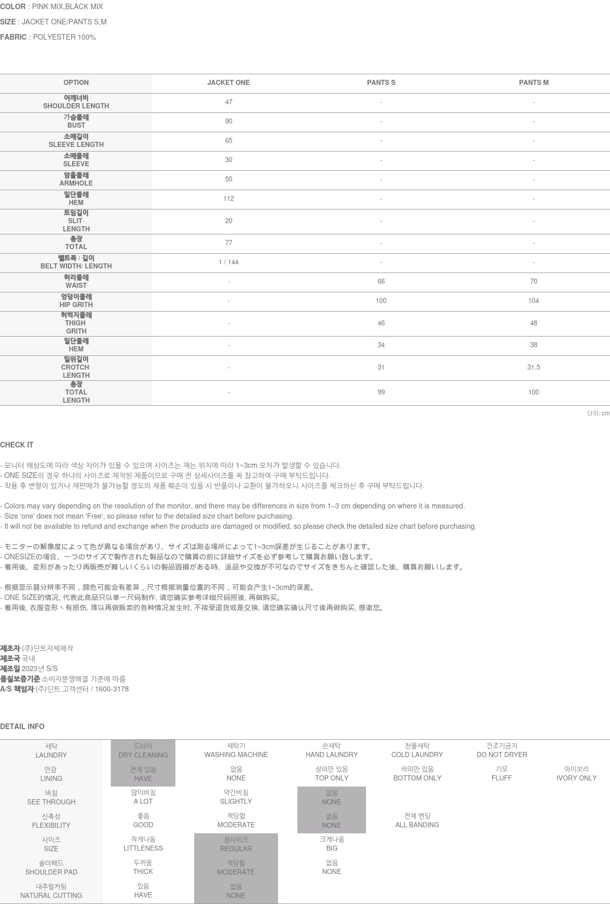 有 ONE 尺寸上衣和小号和中号下装可供选择