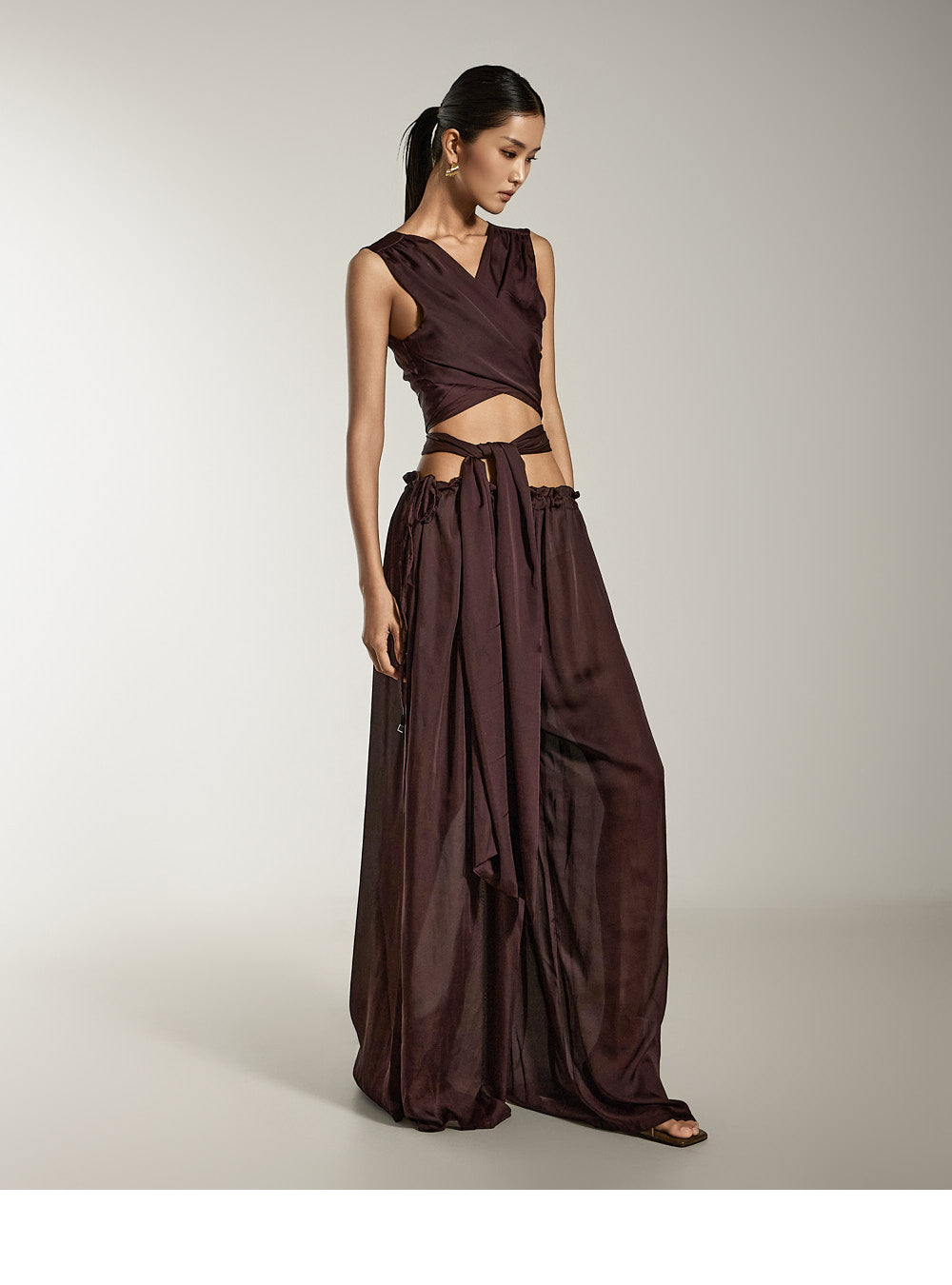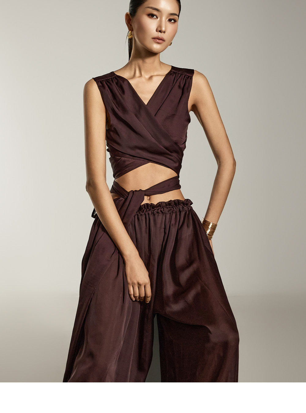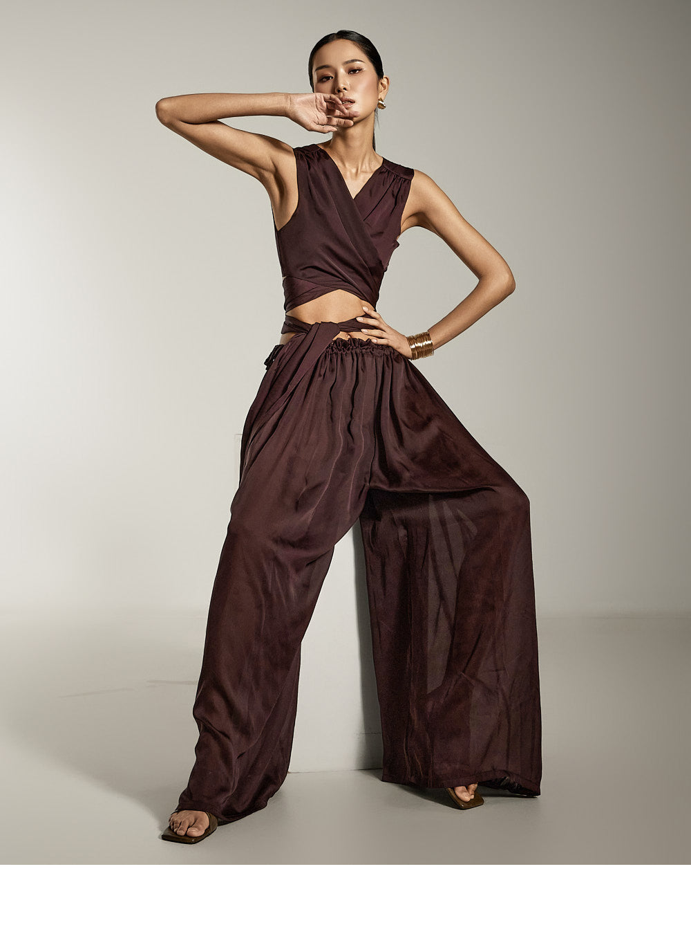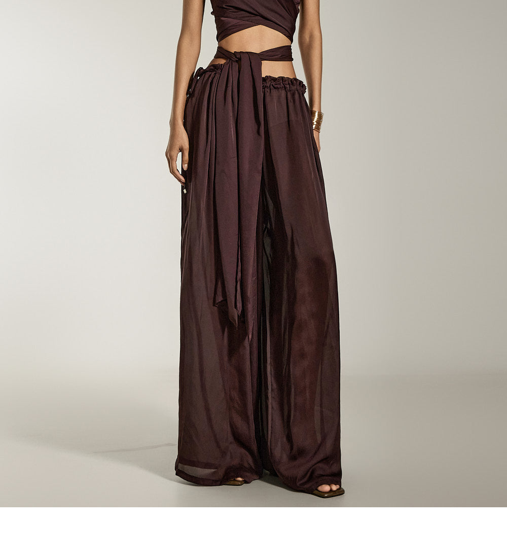 这是缎面宽裤,具有别致而现代的气息。