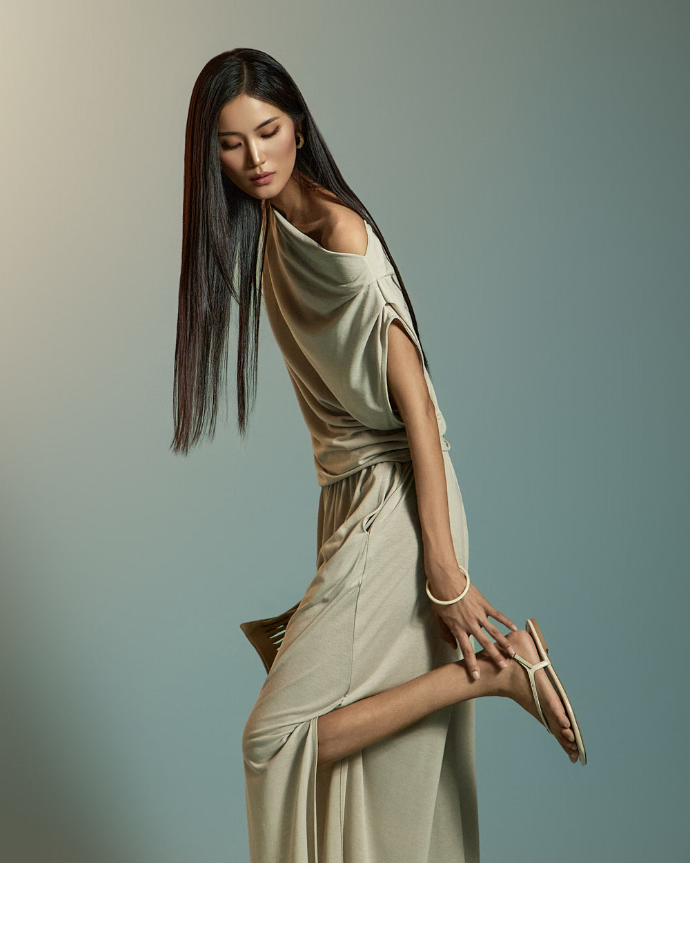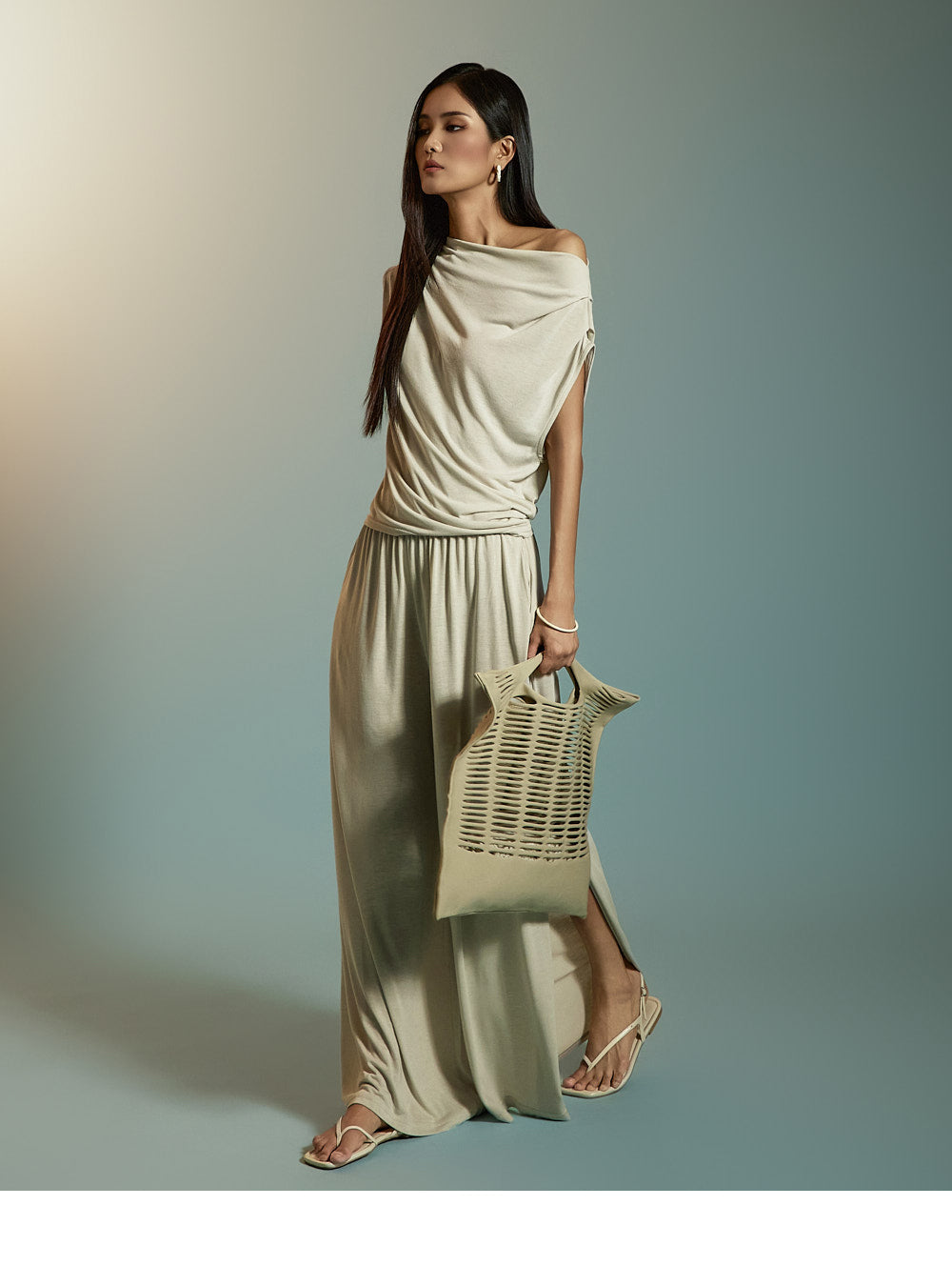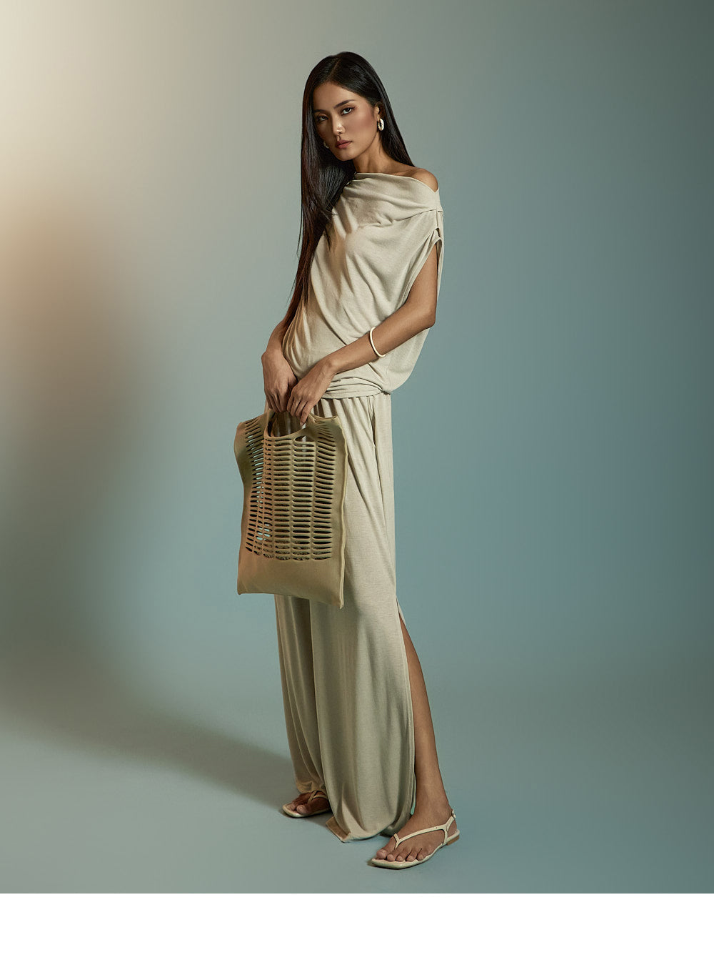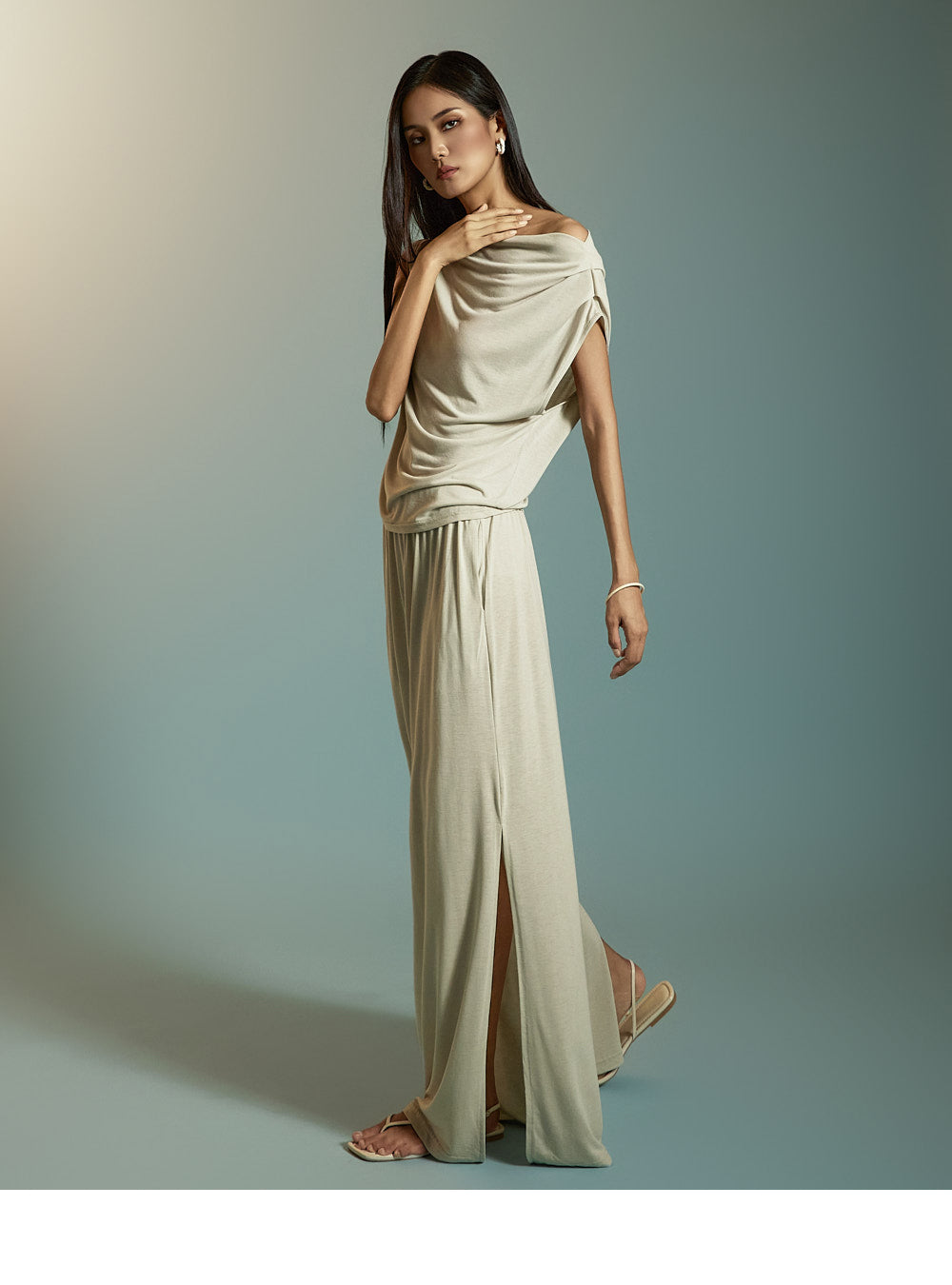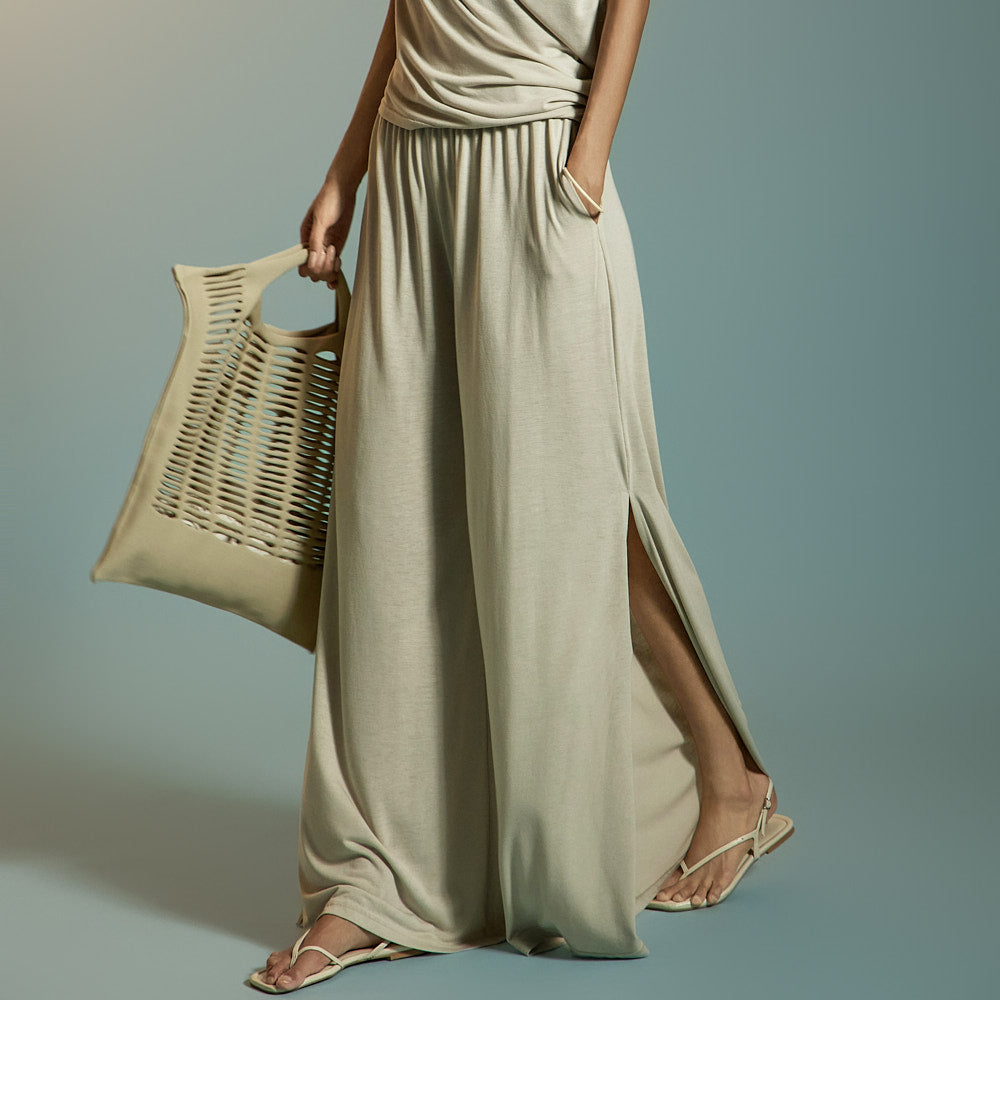 两腿的深侧开衩增添了凉爽的感觉。