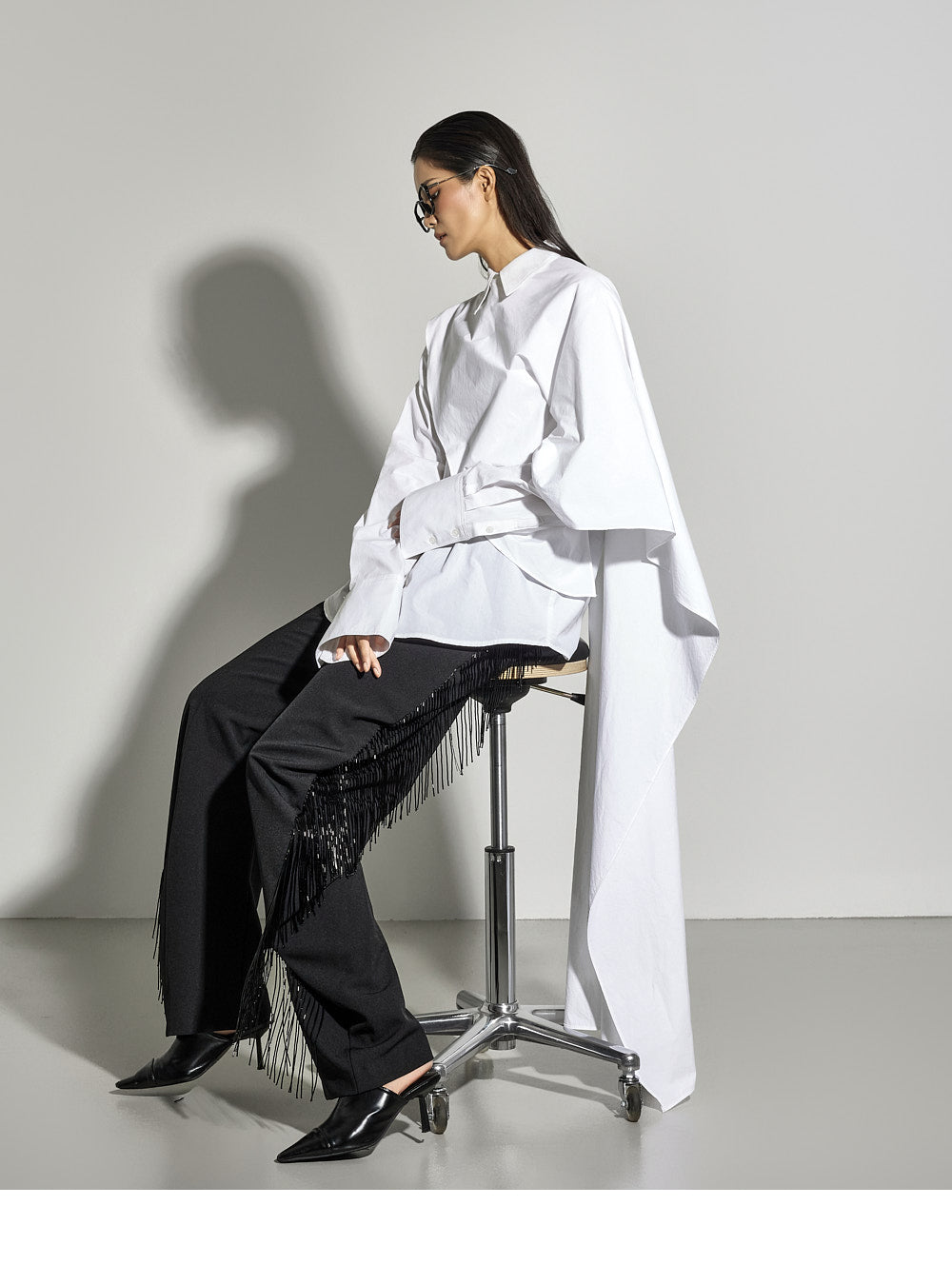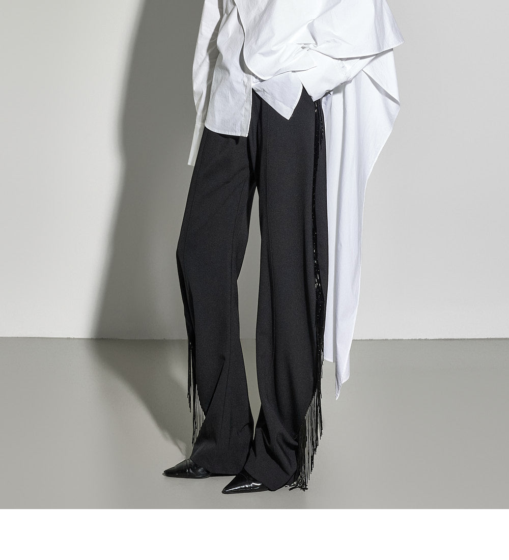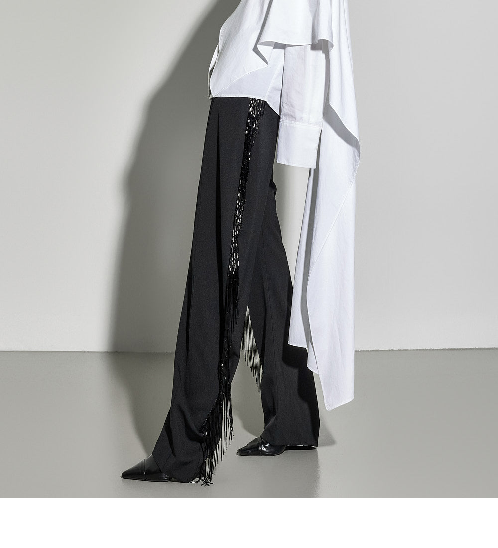 These fringe slacks have a unique style.