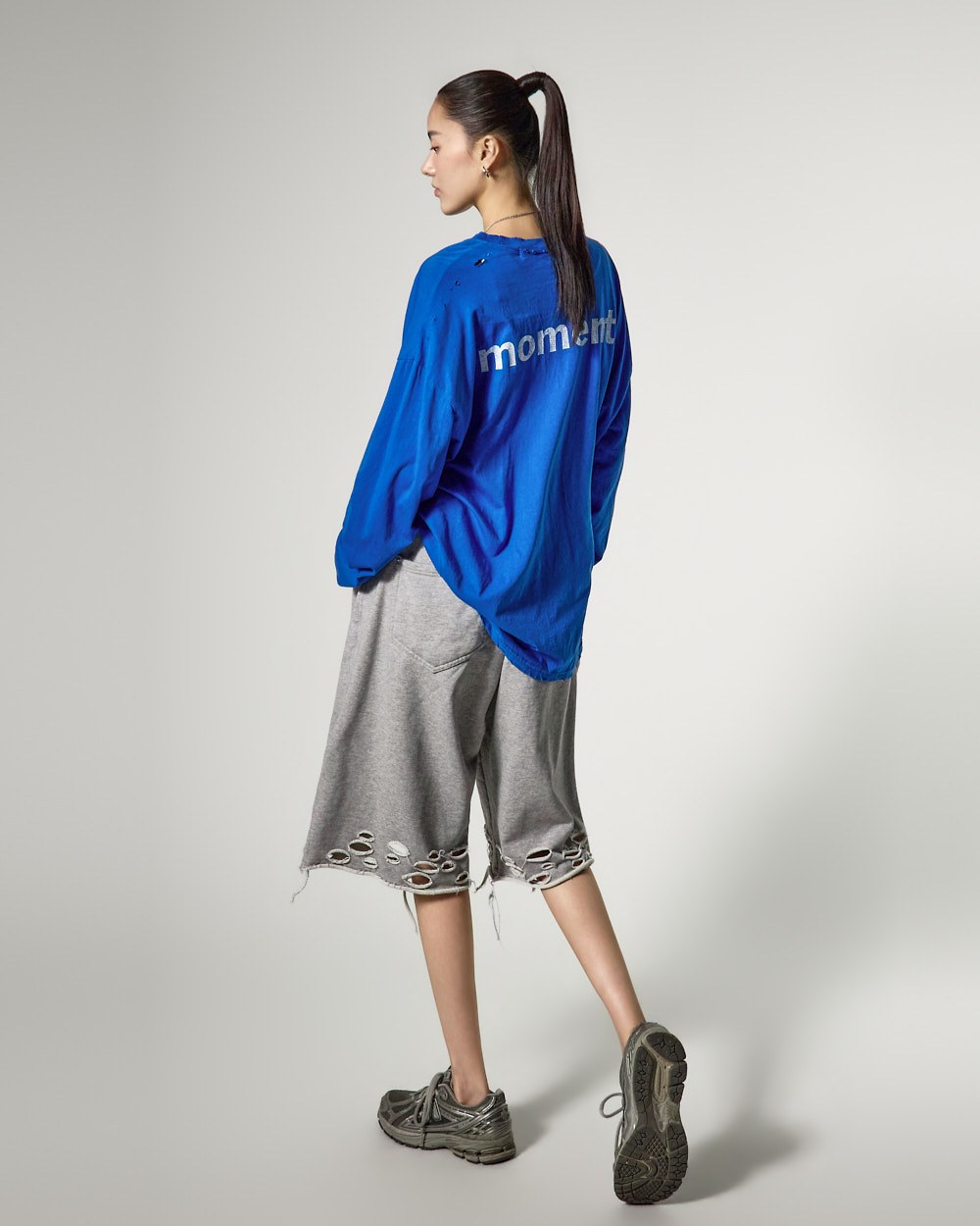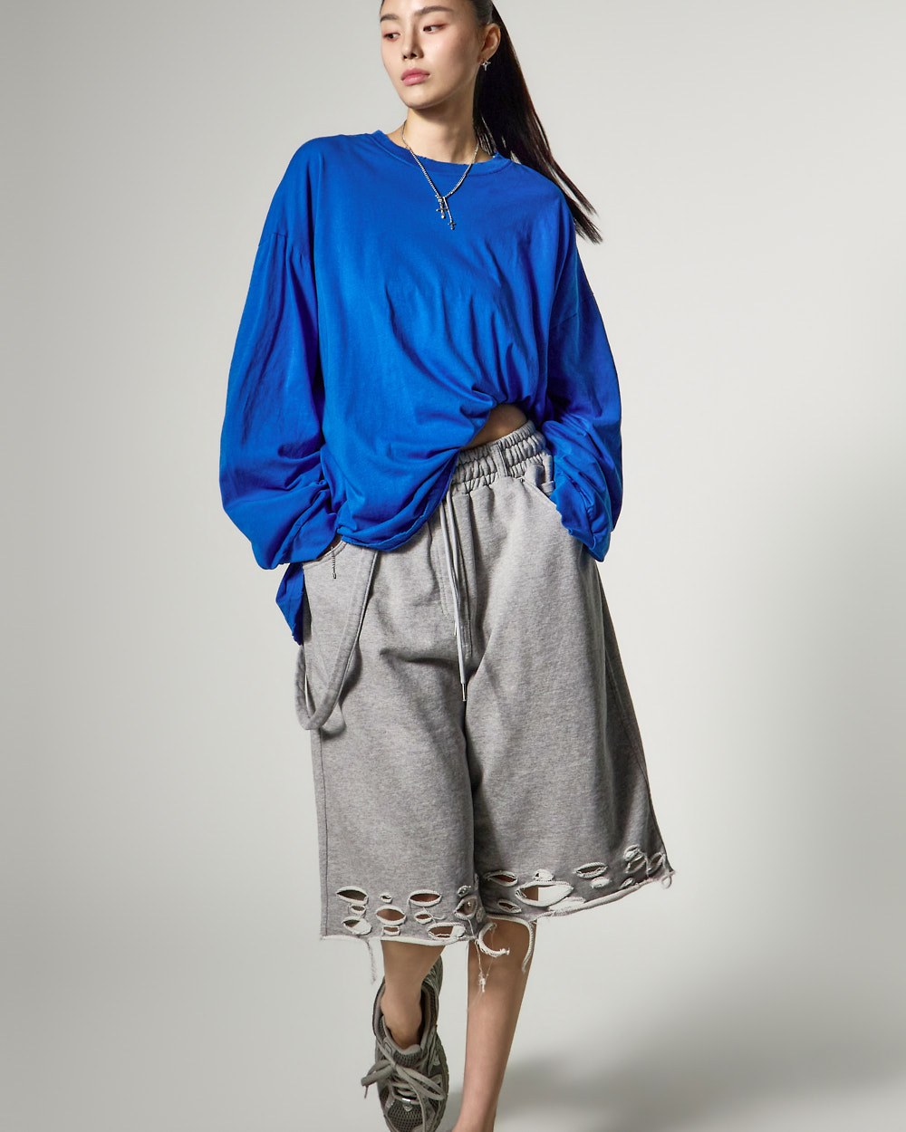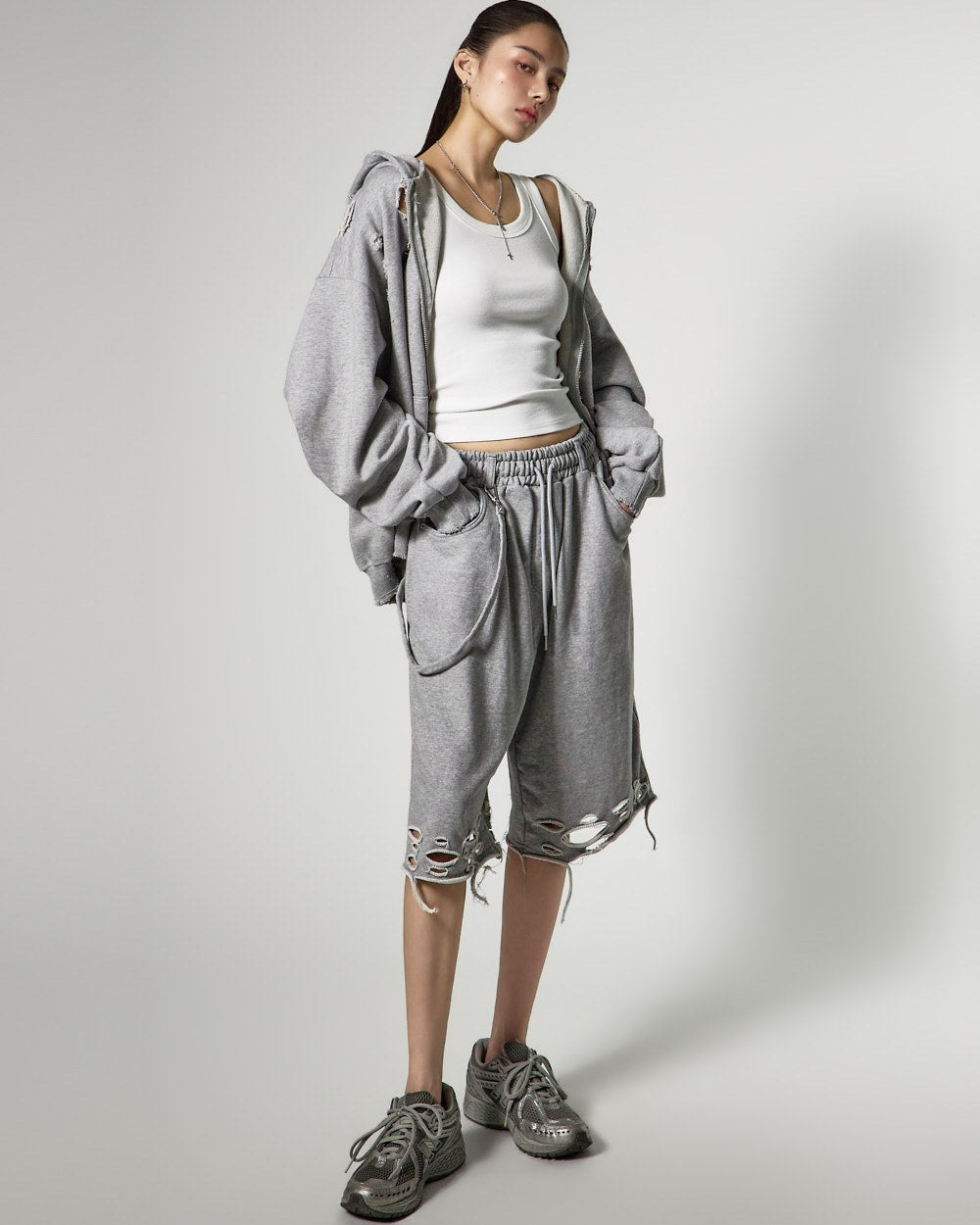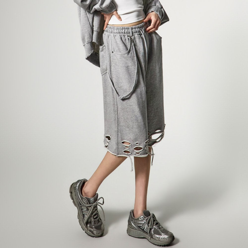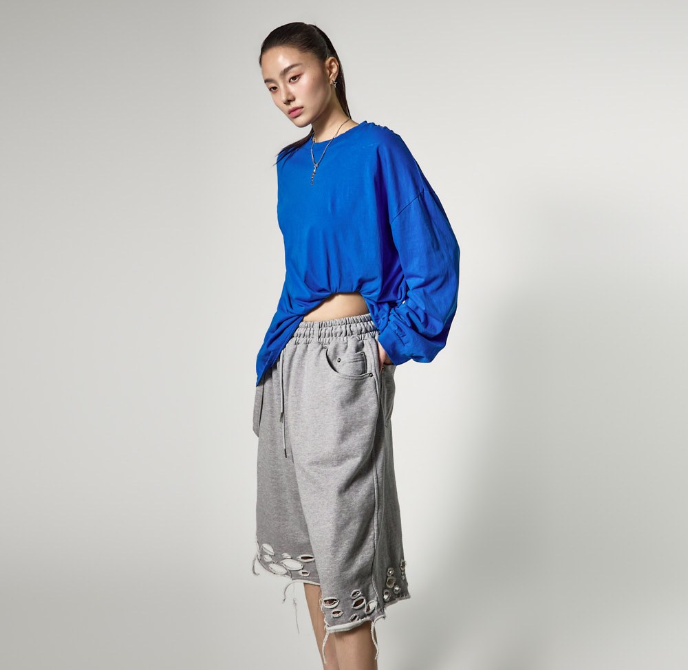 裤脚的自然剪裁和破损细节