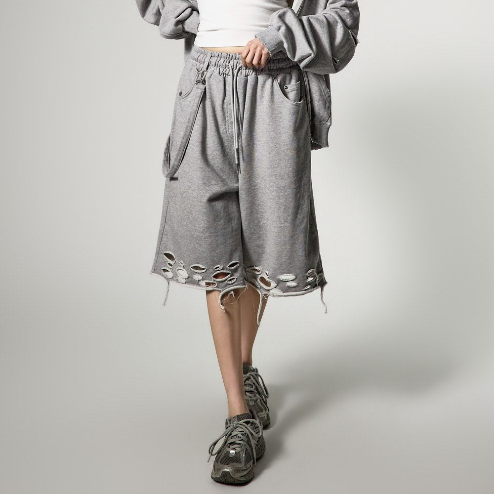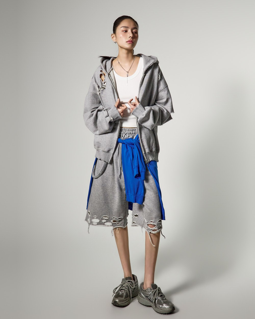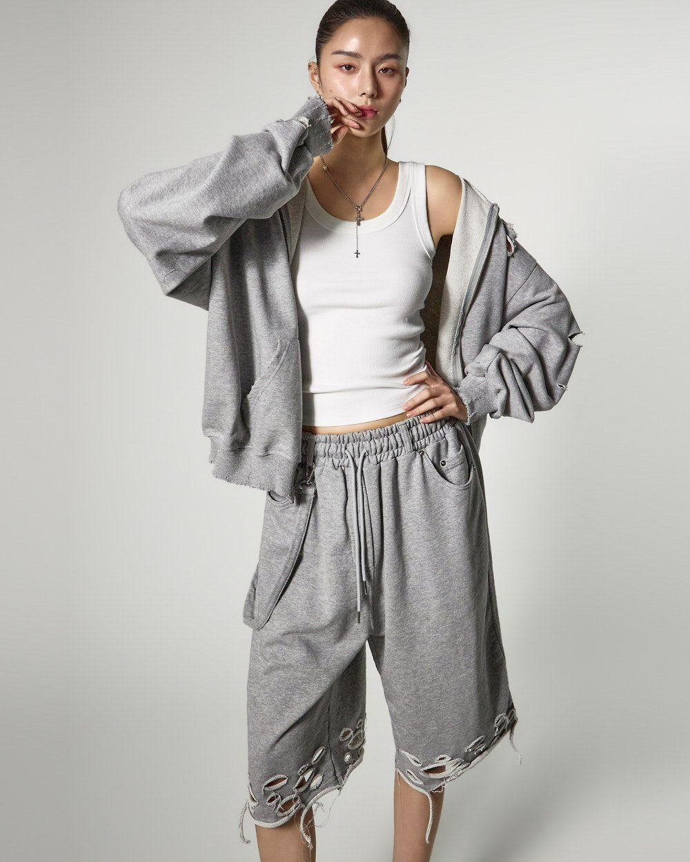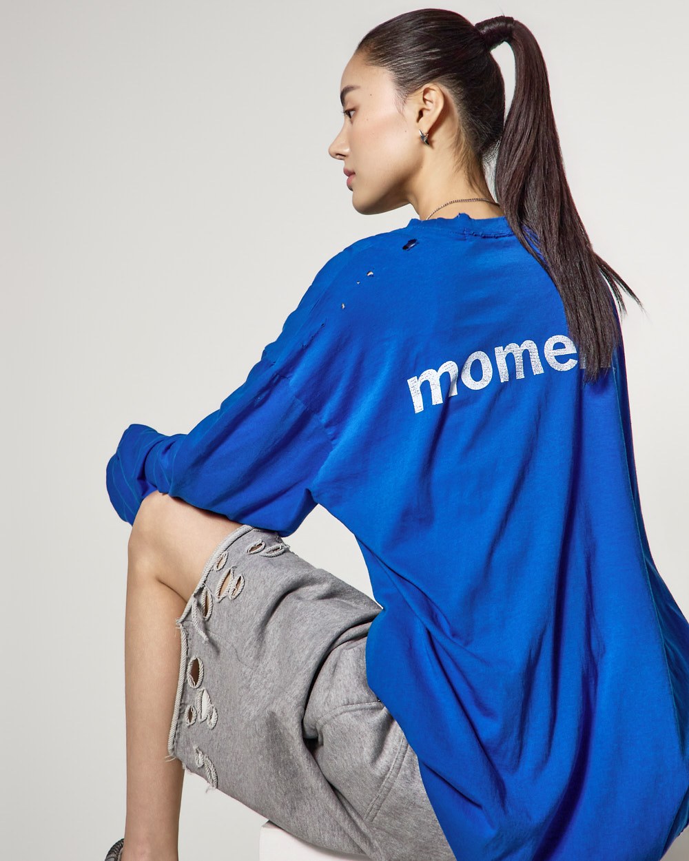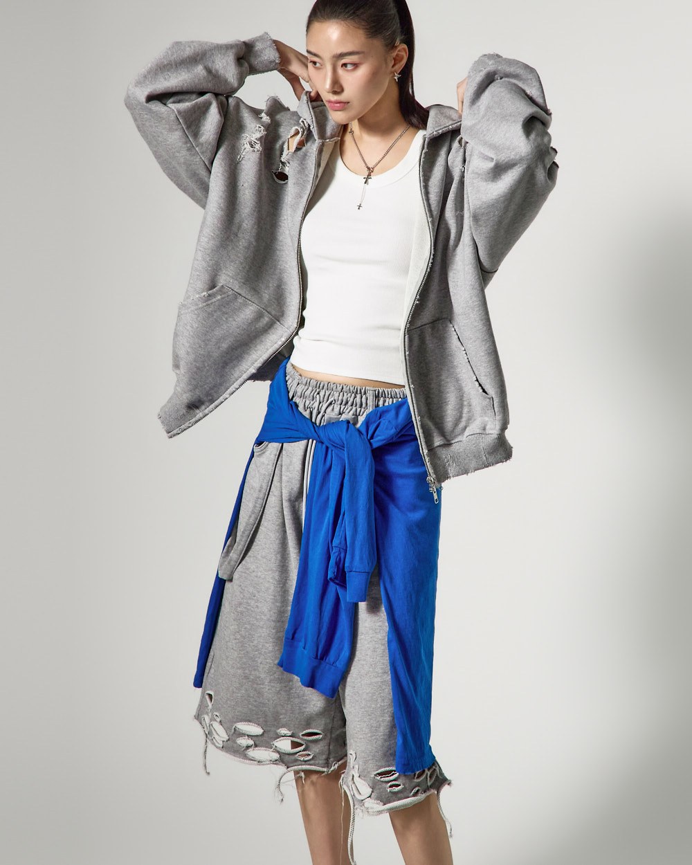 裤脚的自然剪裁和破损细节