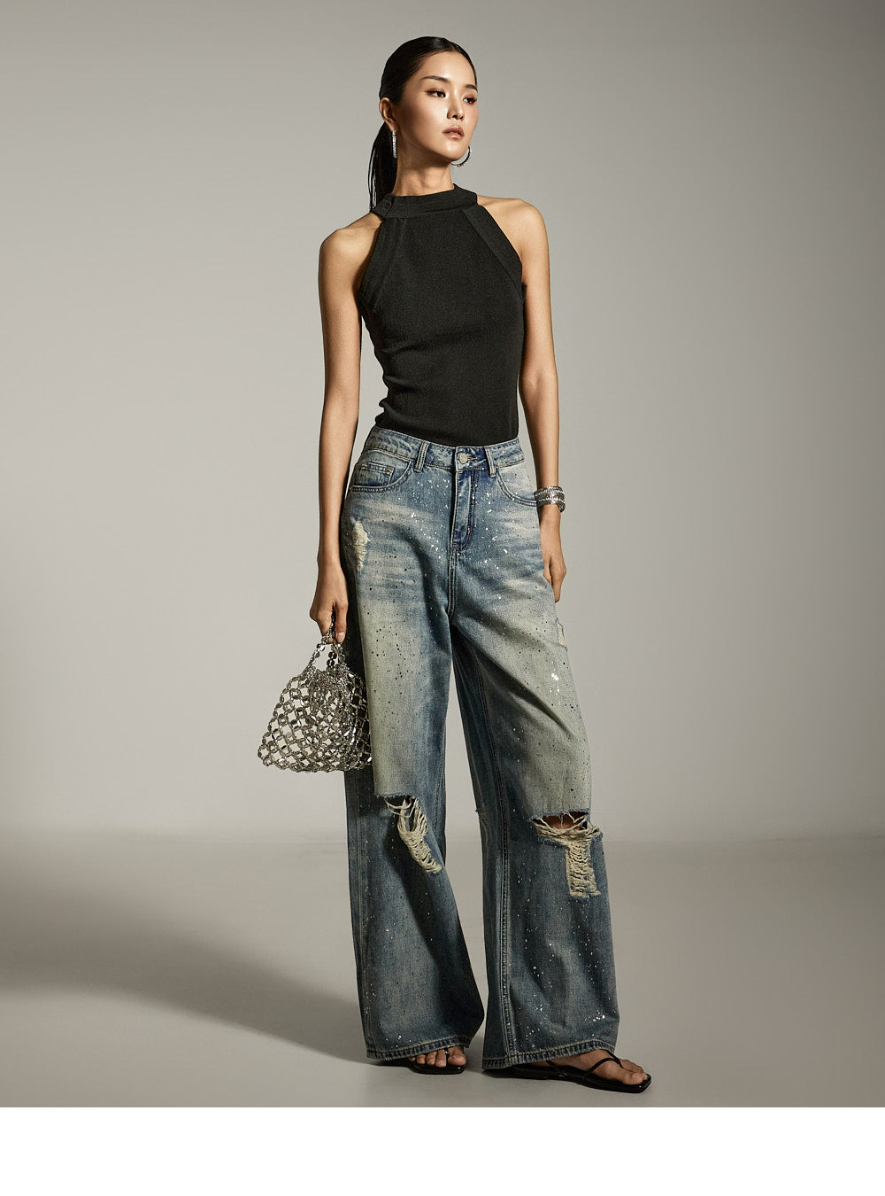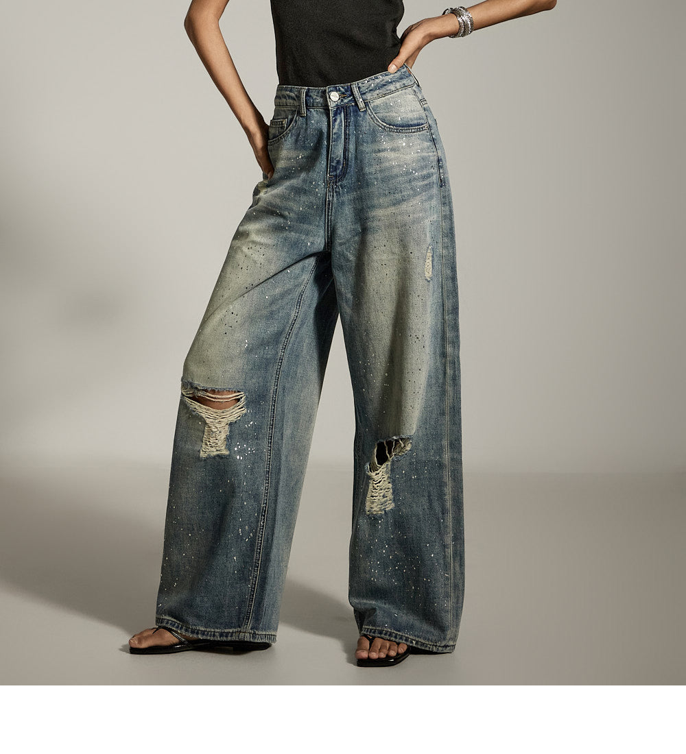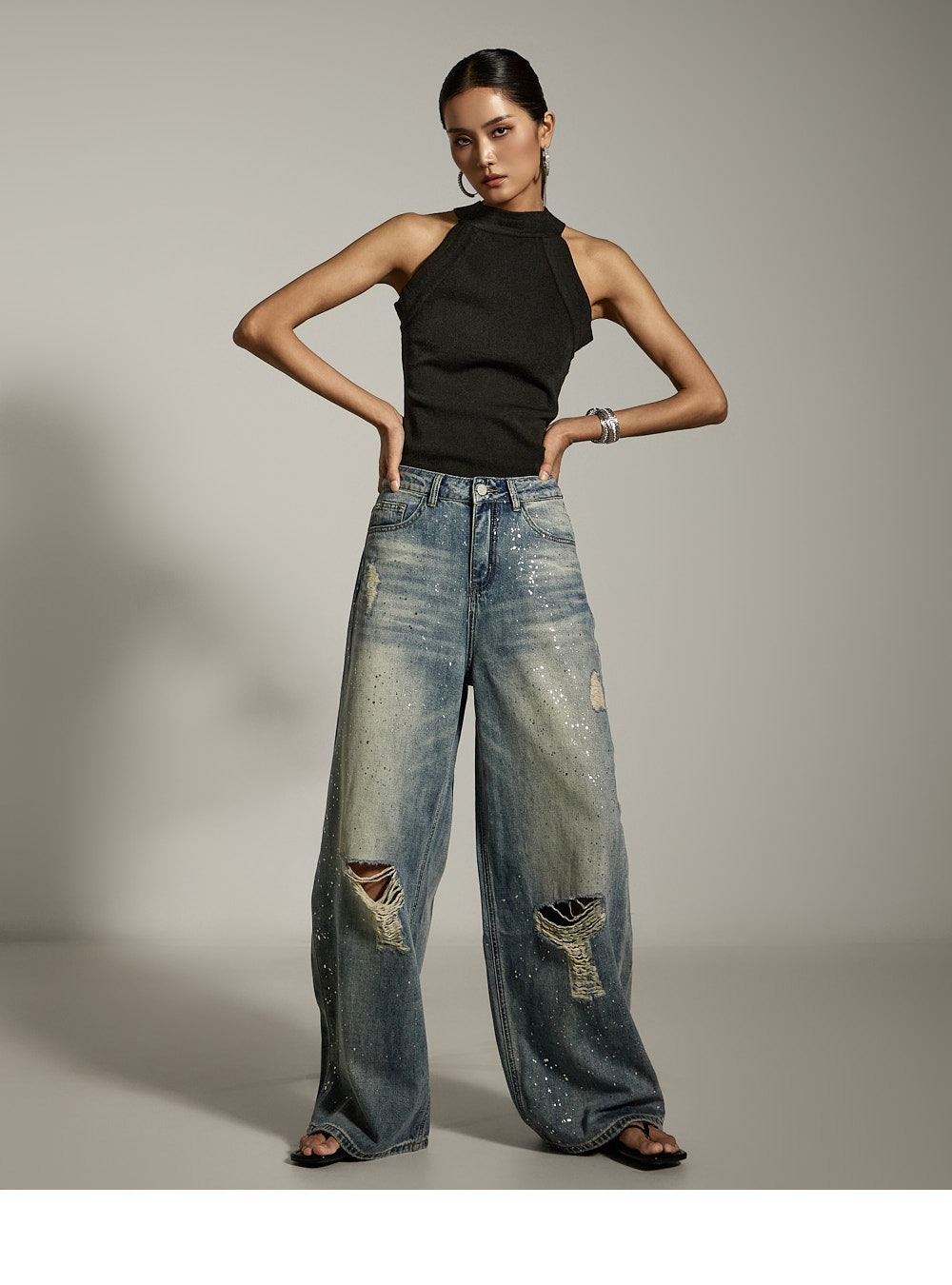 这是流行的闪光宽牛仔裤,具有大胆、时尚的气息。
