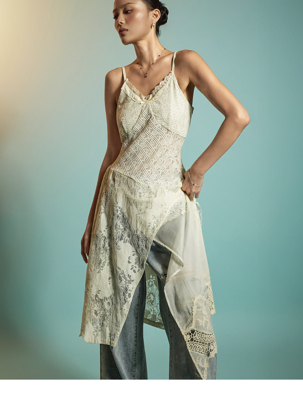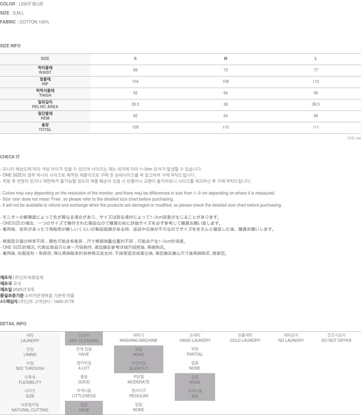 Model is 171cm tall and wears size S in light blue.