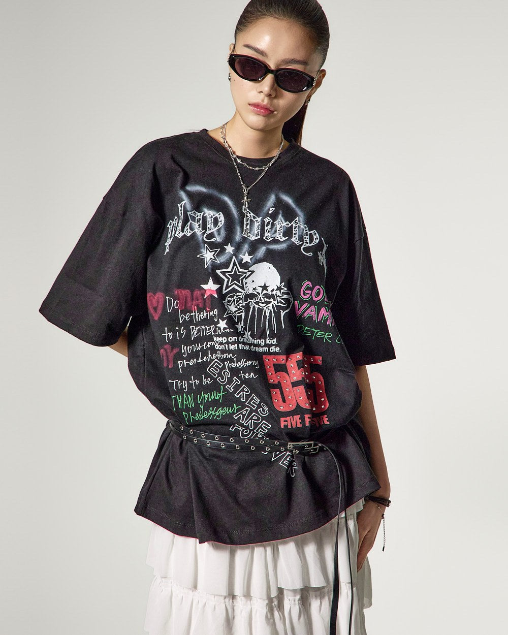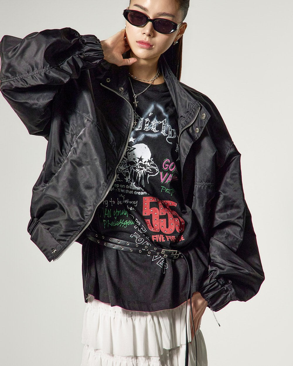 模特身高171厘米,身穿白色ONE码。