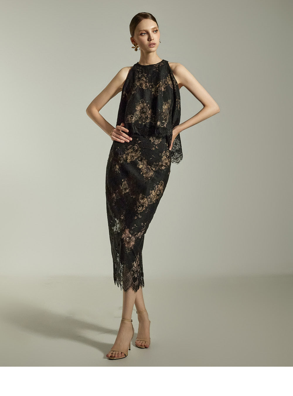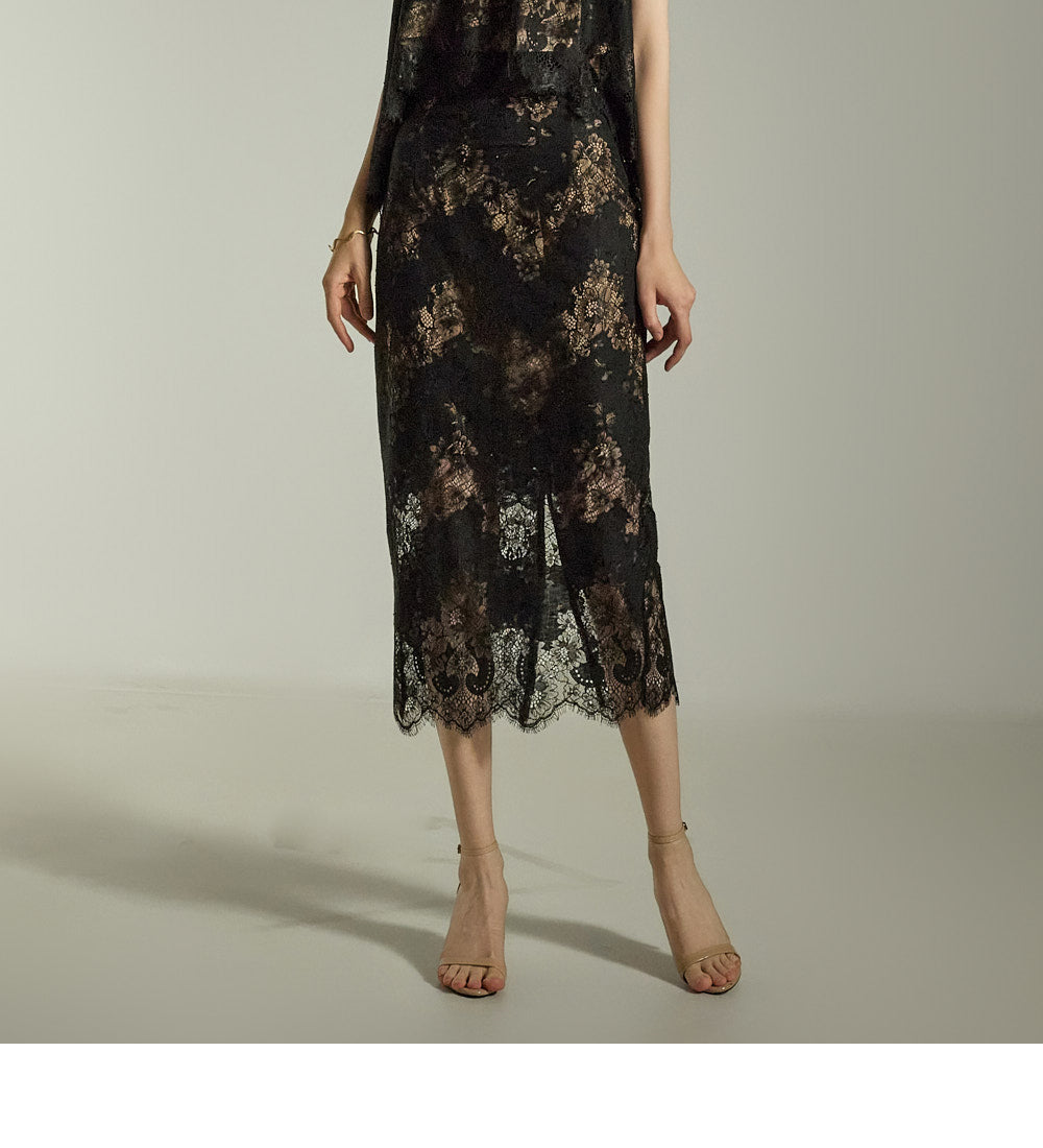 The all-over floral lace fabric features a sheer hem detail that adds a subtle touch.