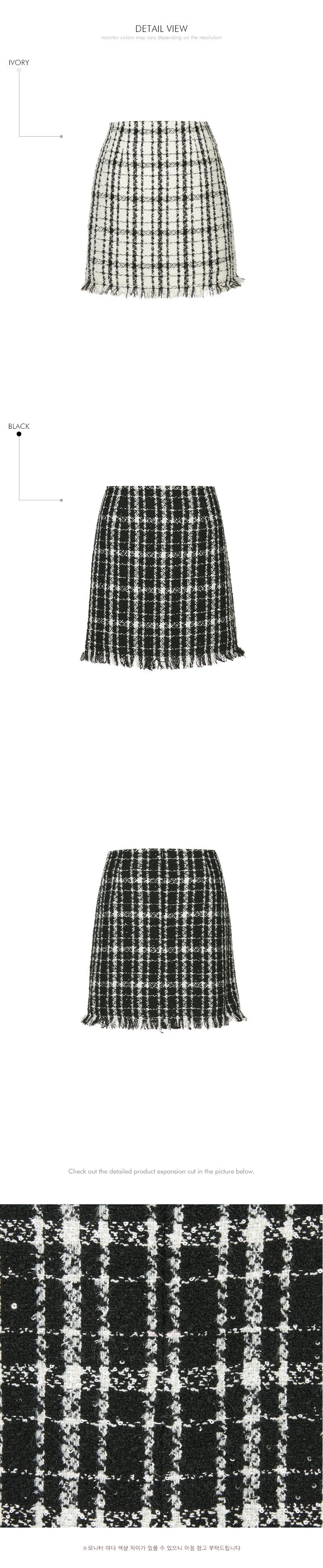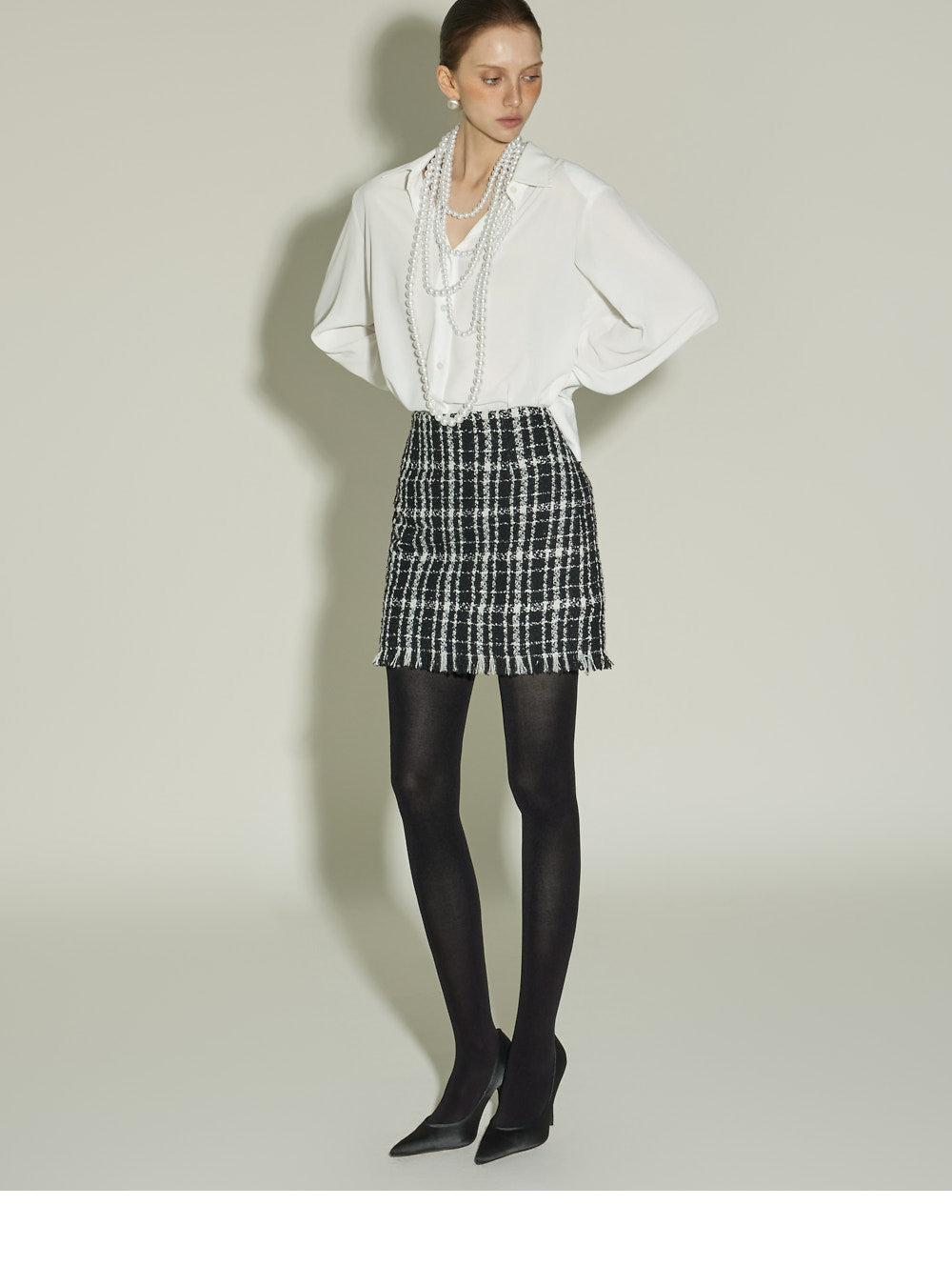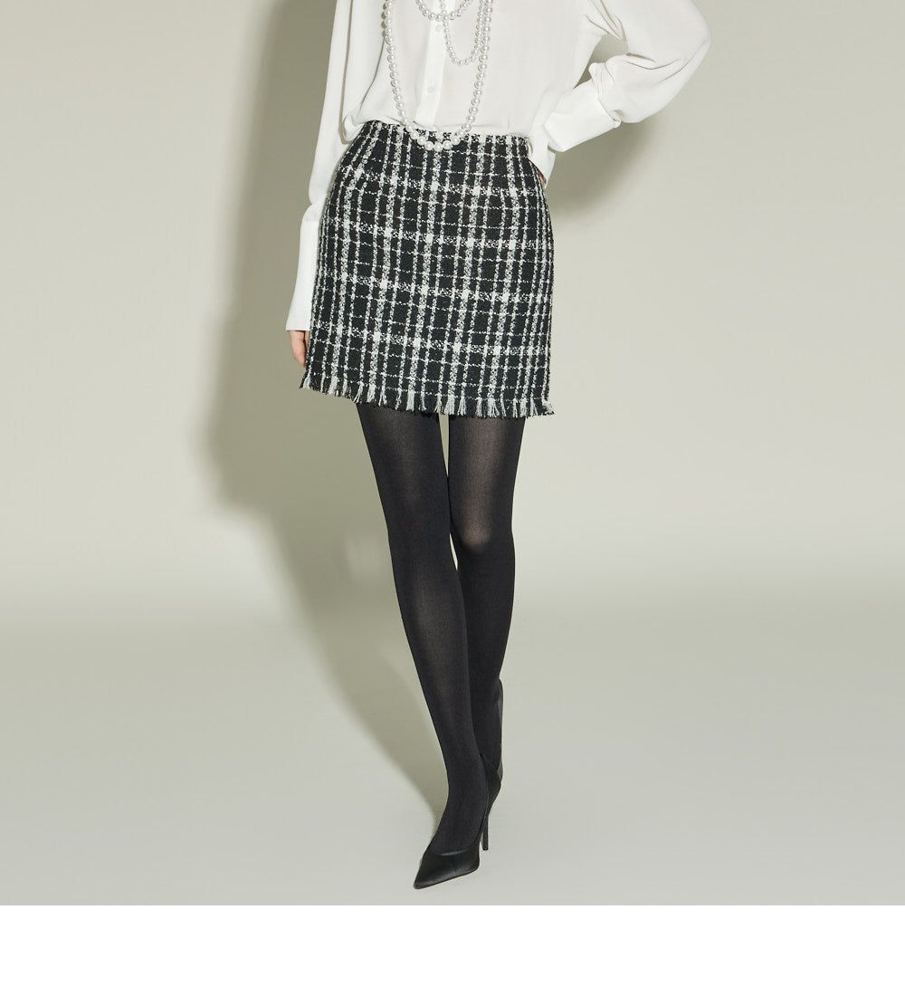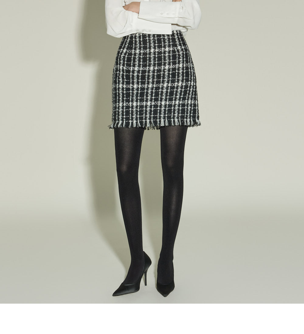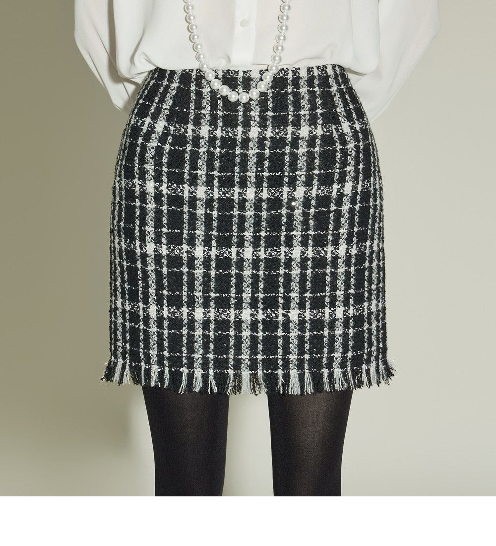 This tweed check skirt exudes a luxurious and sophisticated vibe.