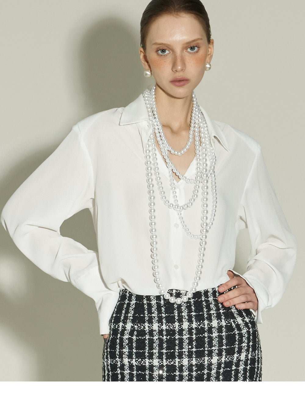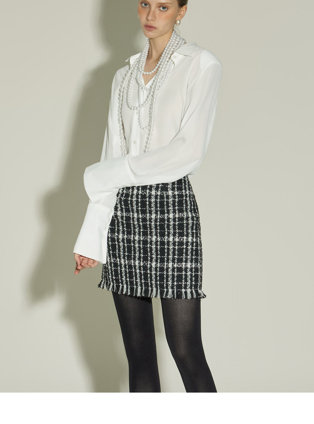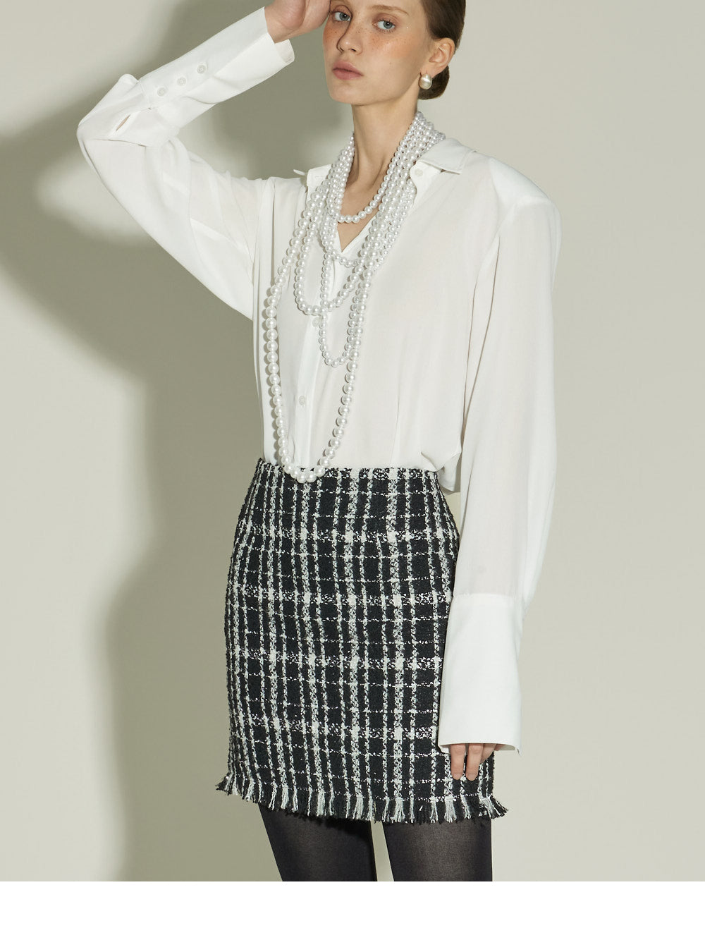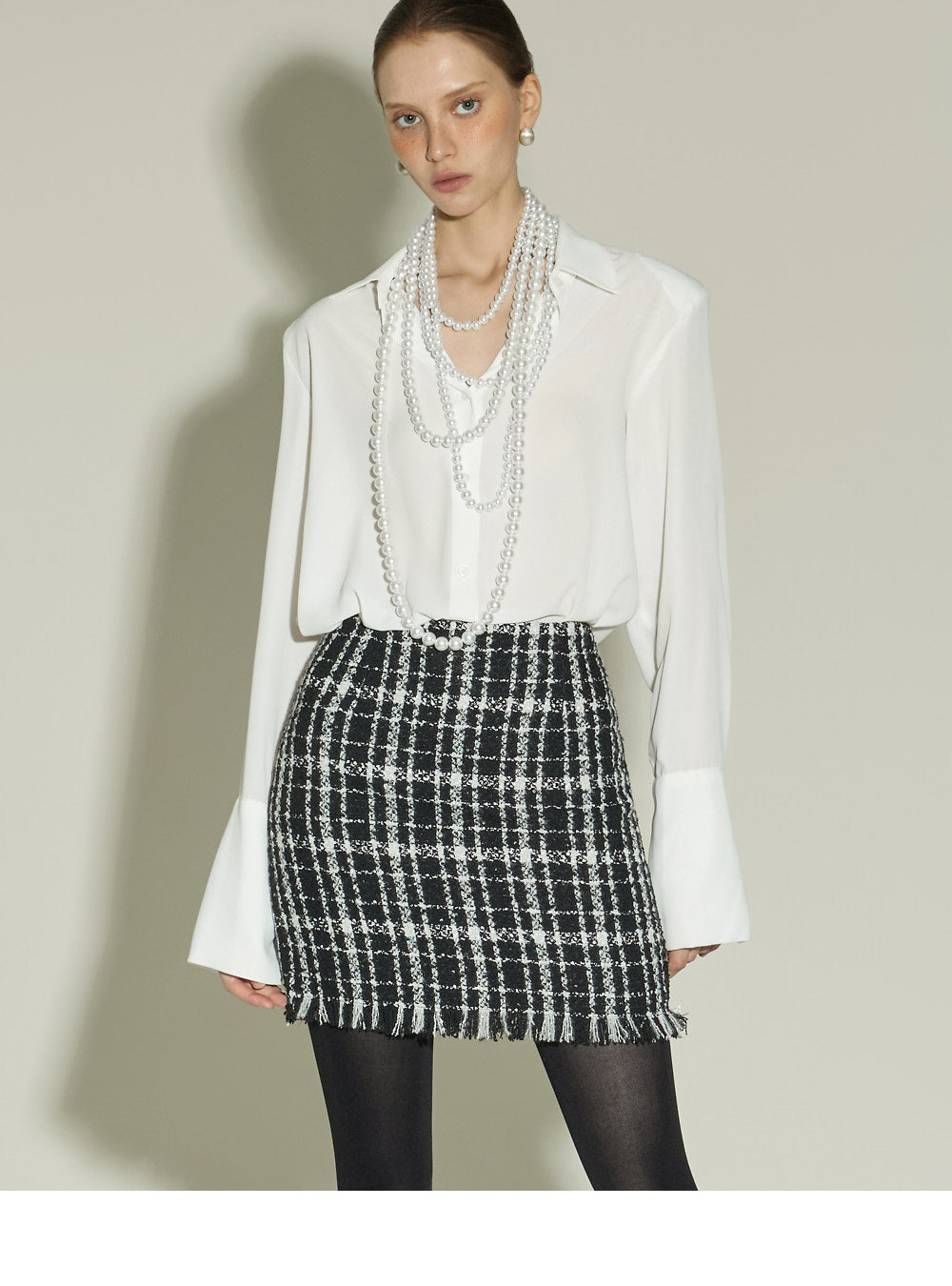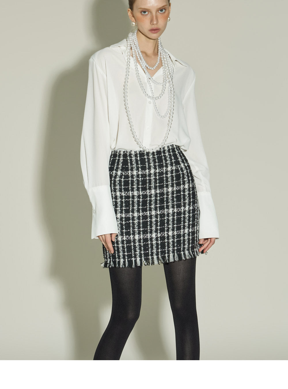 This tweed check skirt exudes a luxurious and sophisticated vibe.