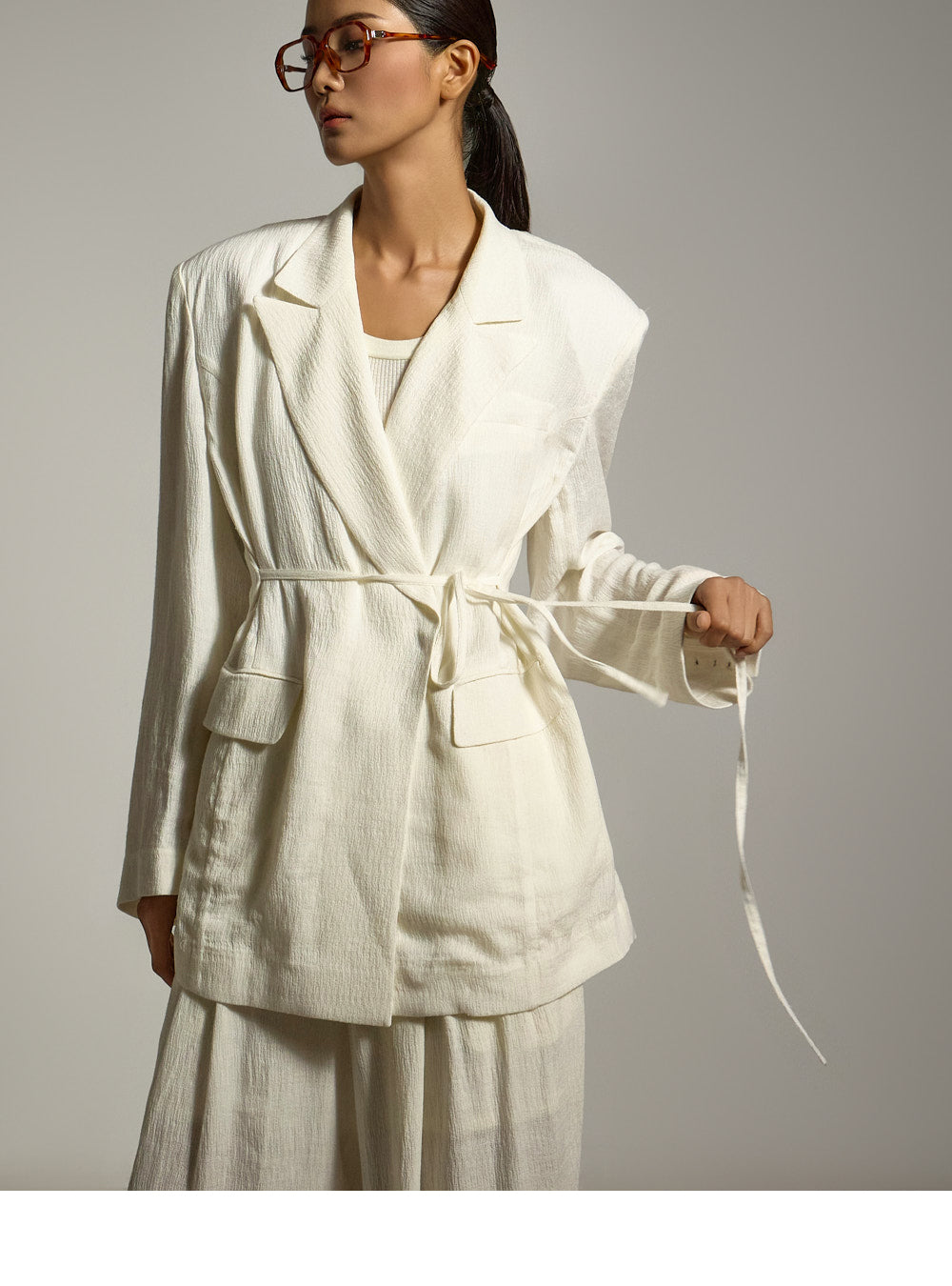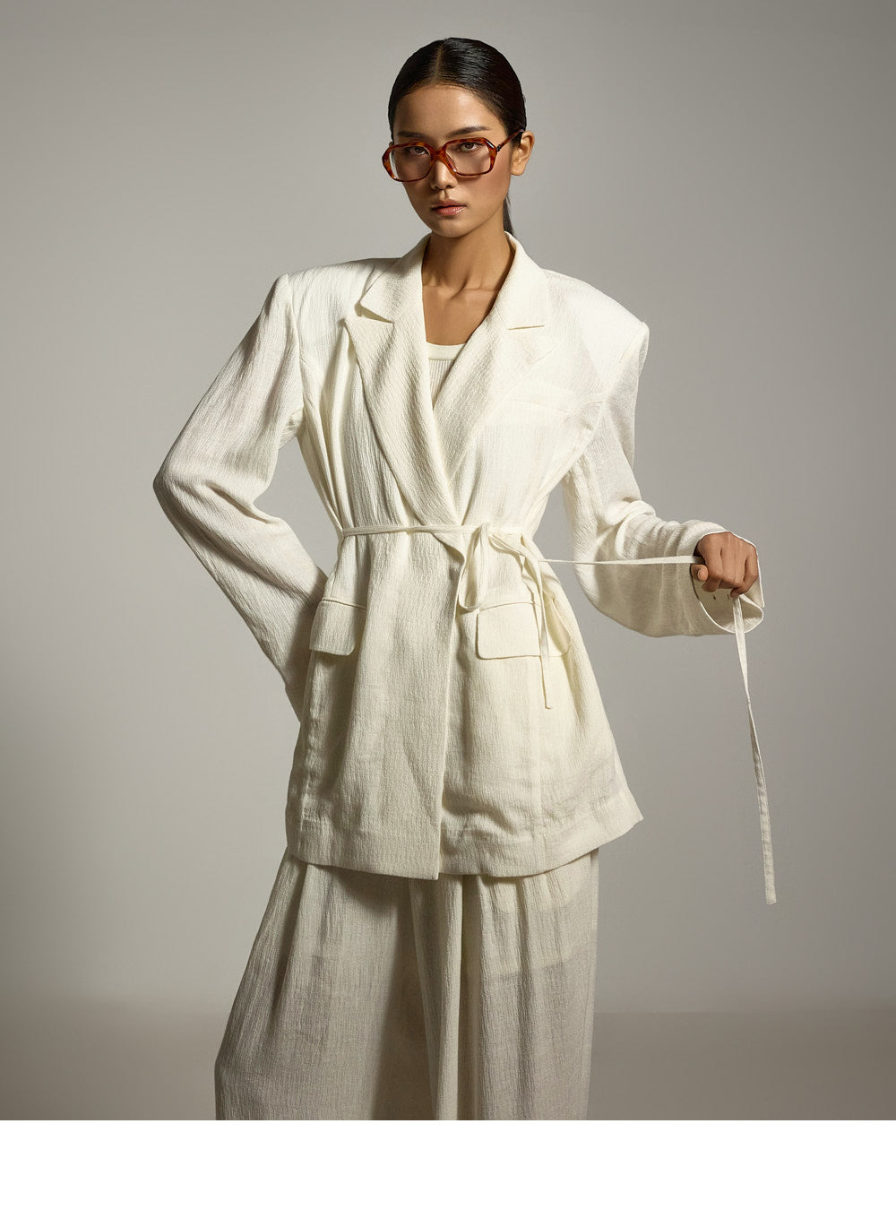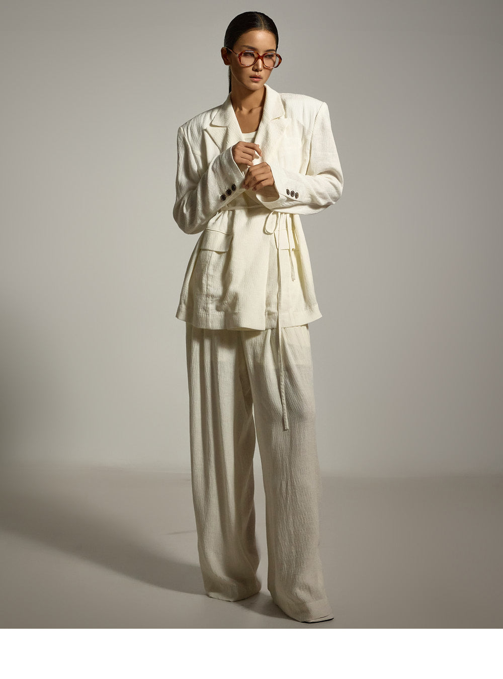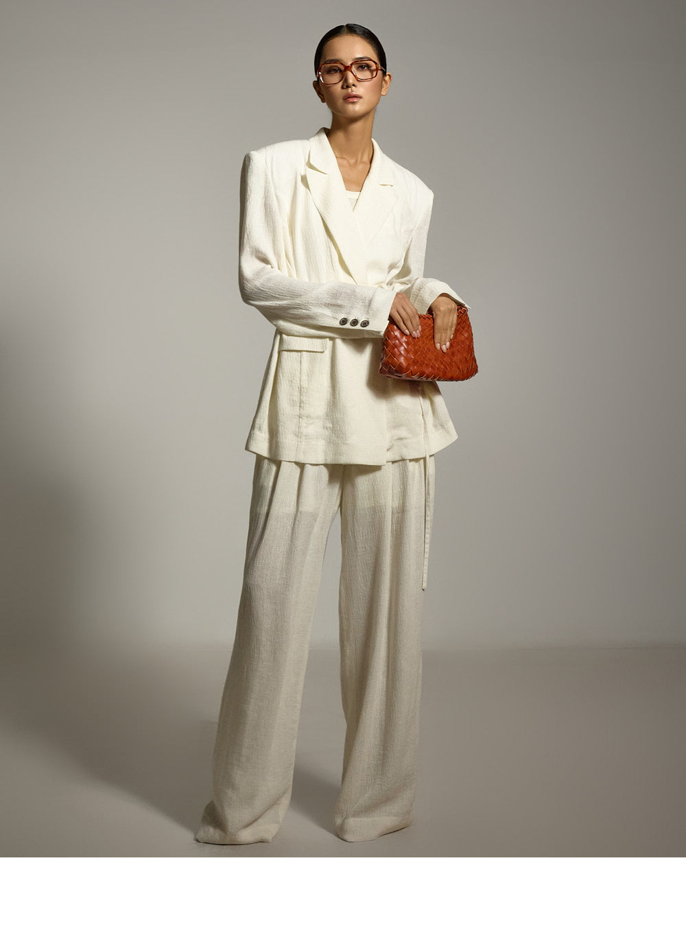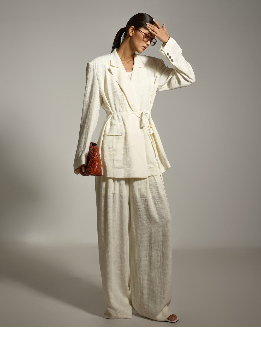 这款精致的亚麻套装由亚麻、人造丝混合制成,