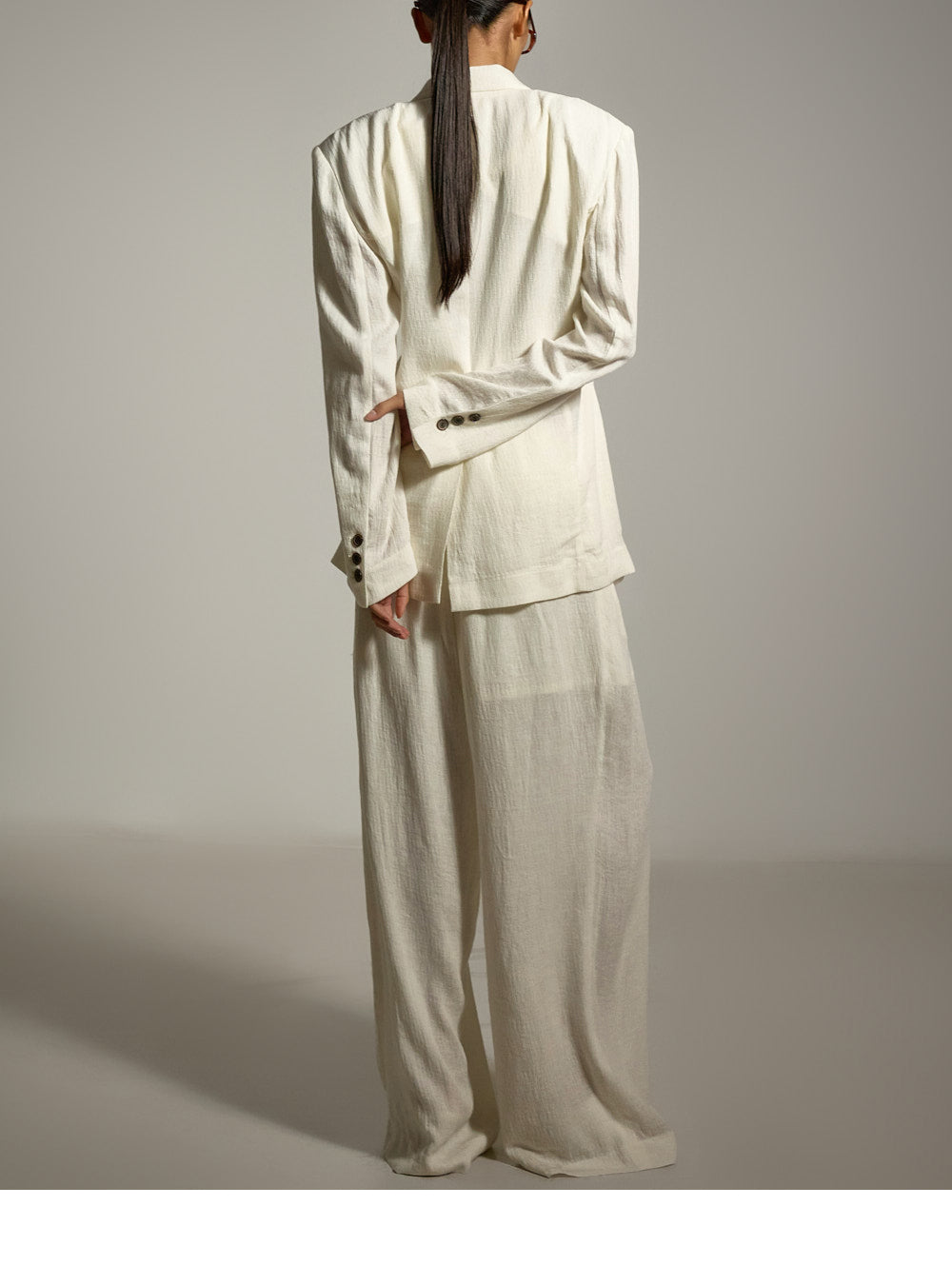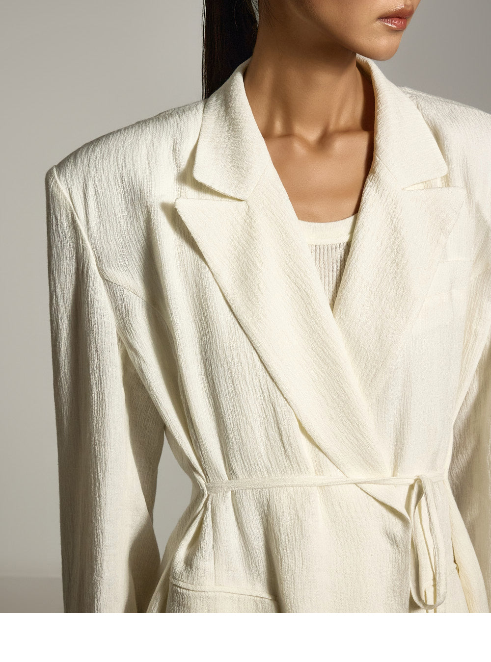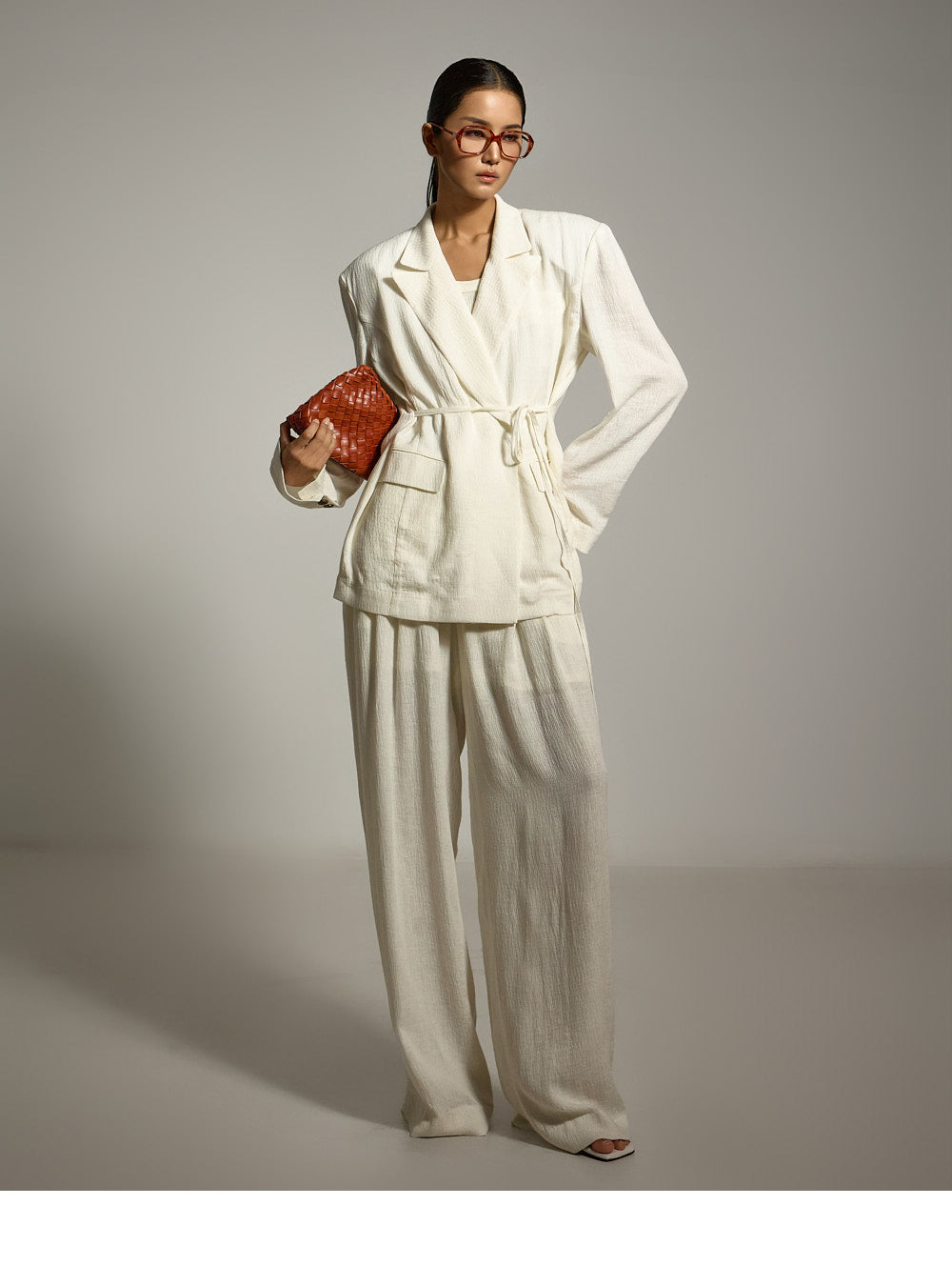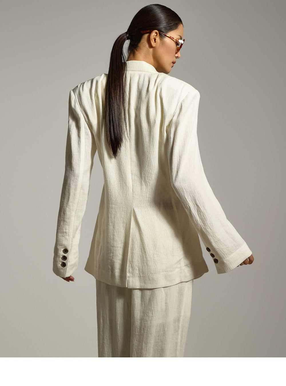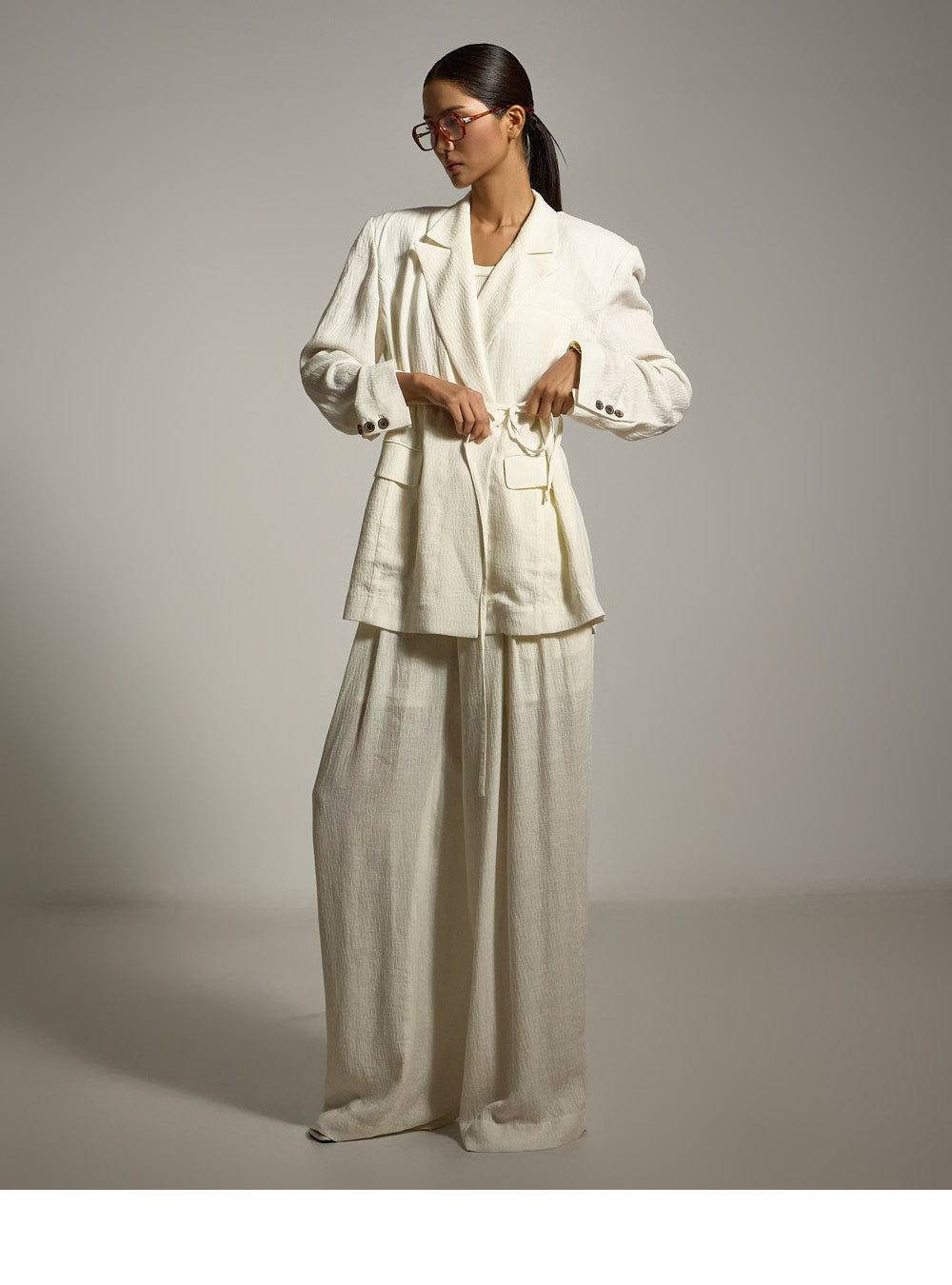 这款精致的亚麻套装由亚麻、人造丝混合制成,