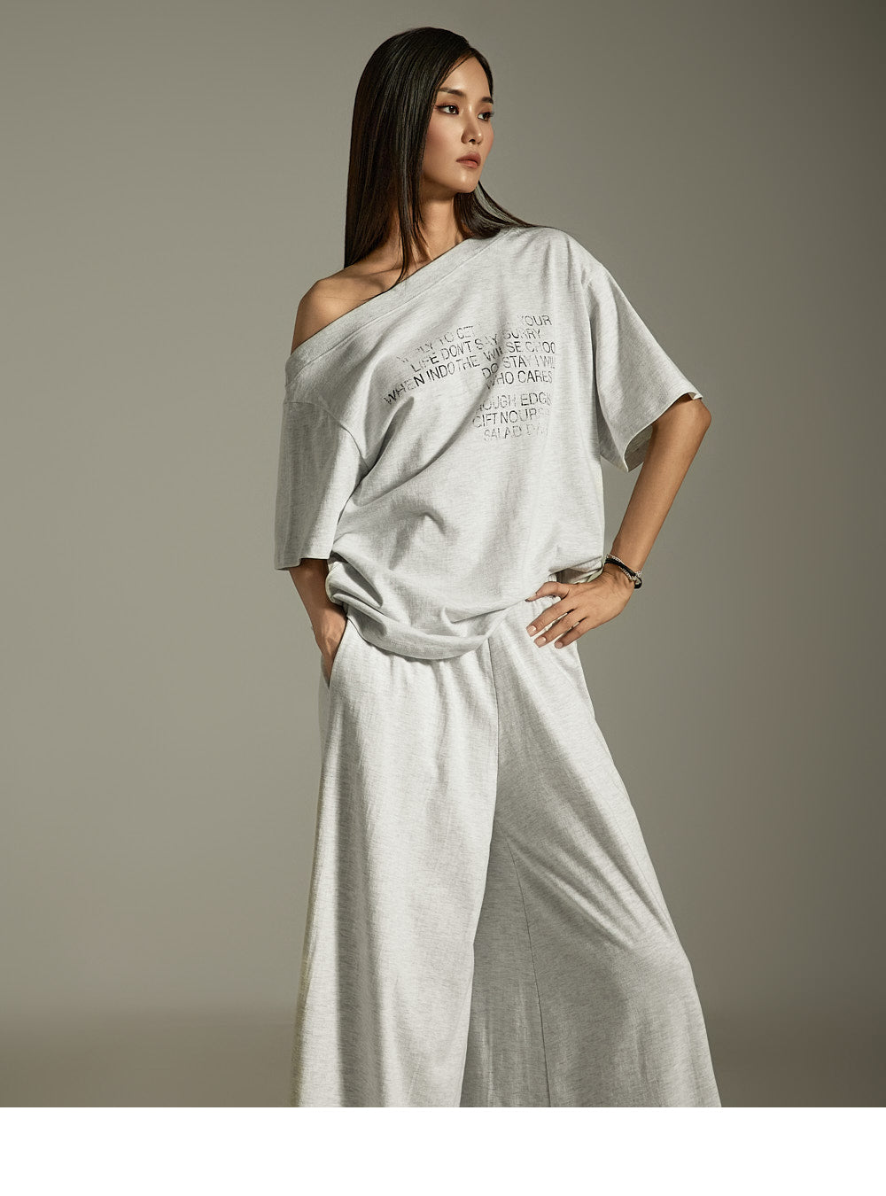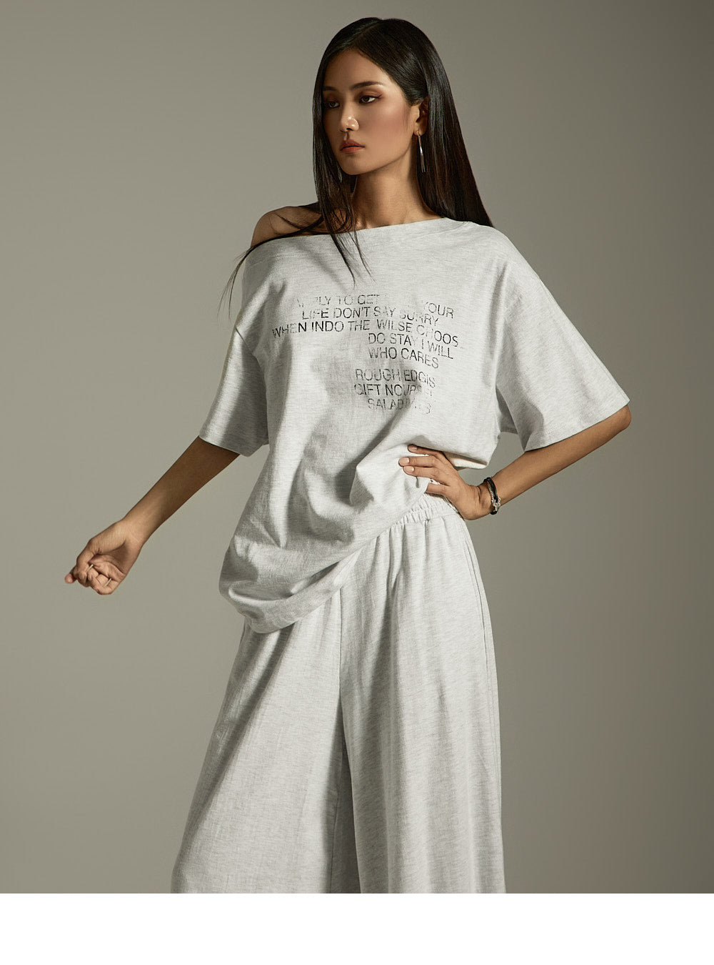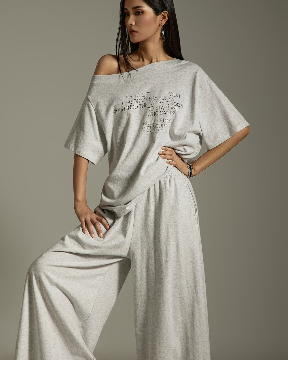上衣宽松,肩部有不对称细节,
