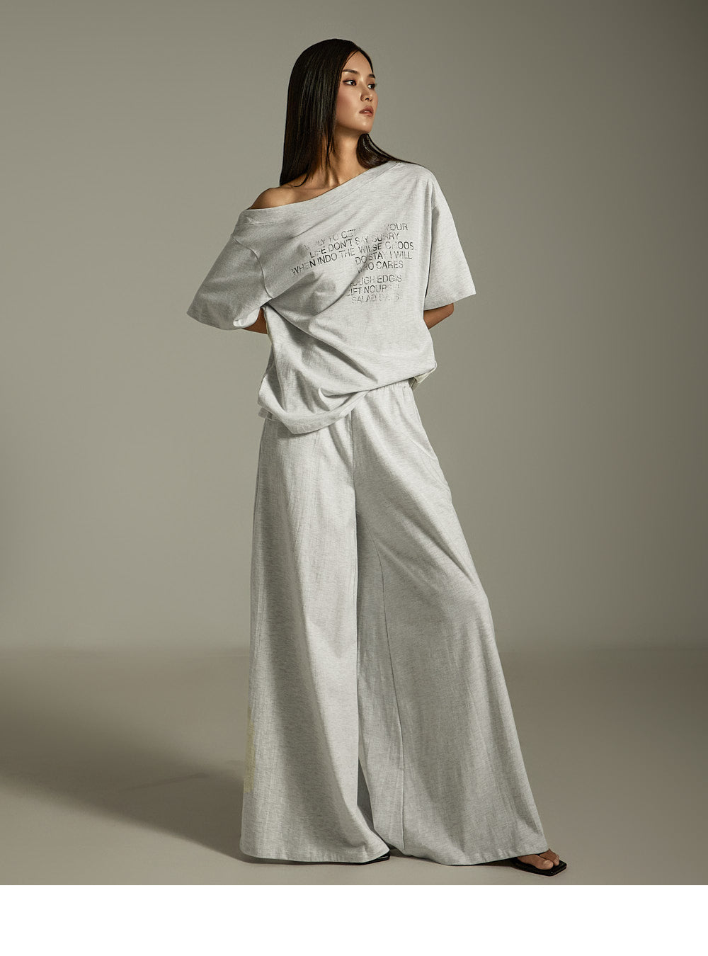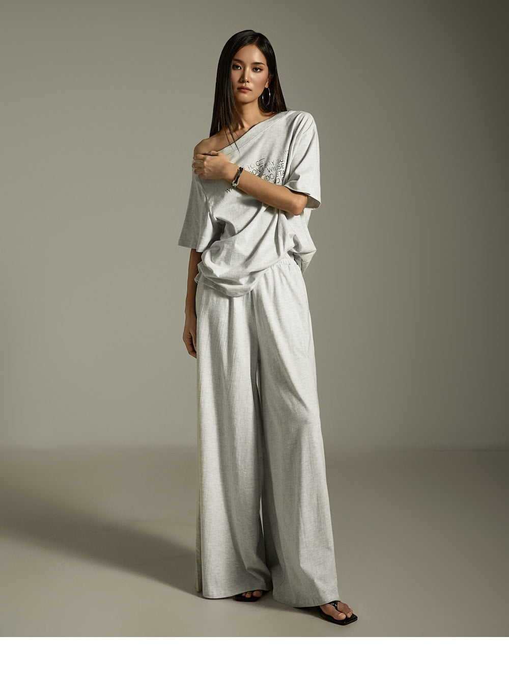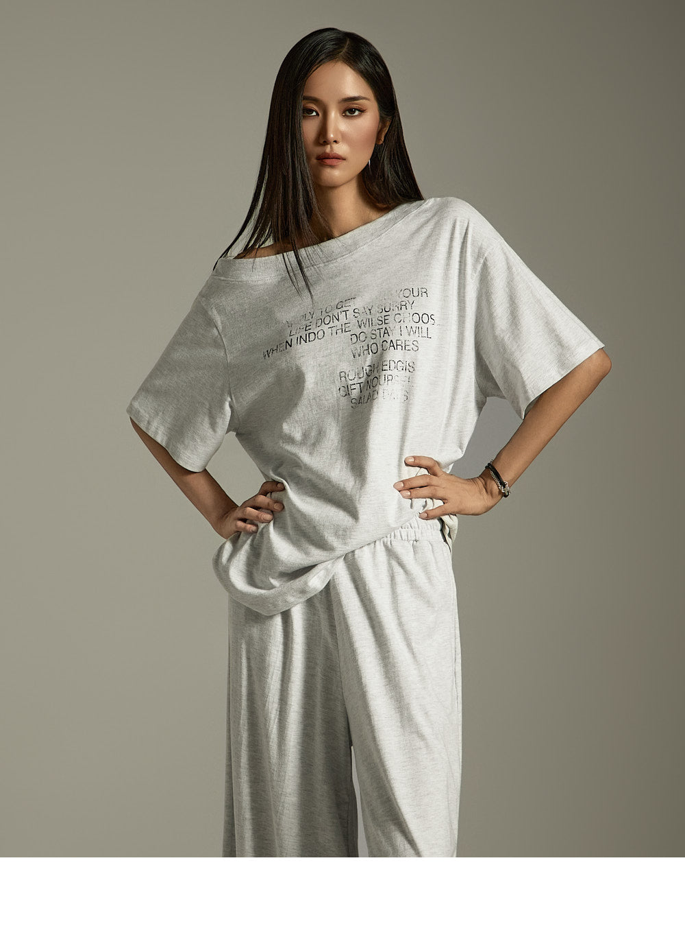 上衣宽松,肩部有不对称细节,