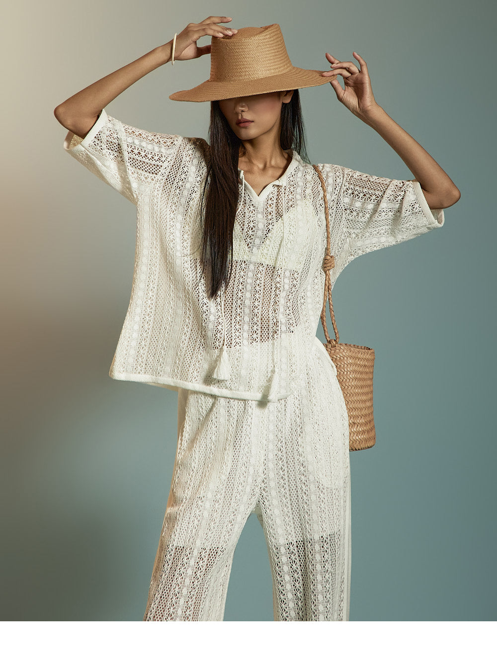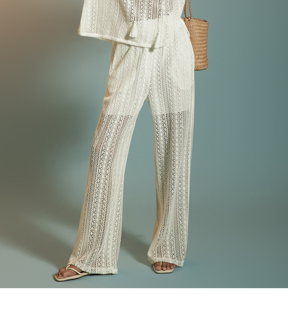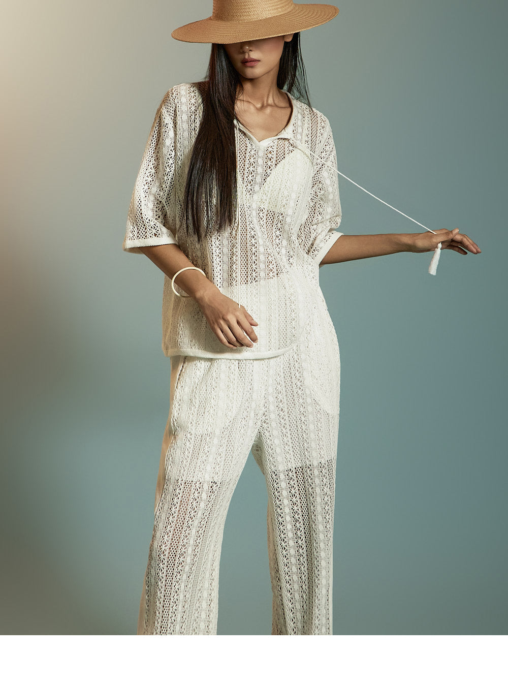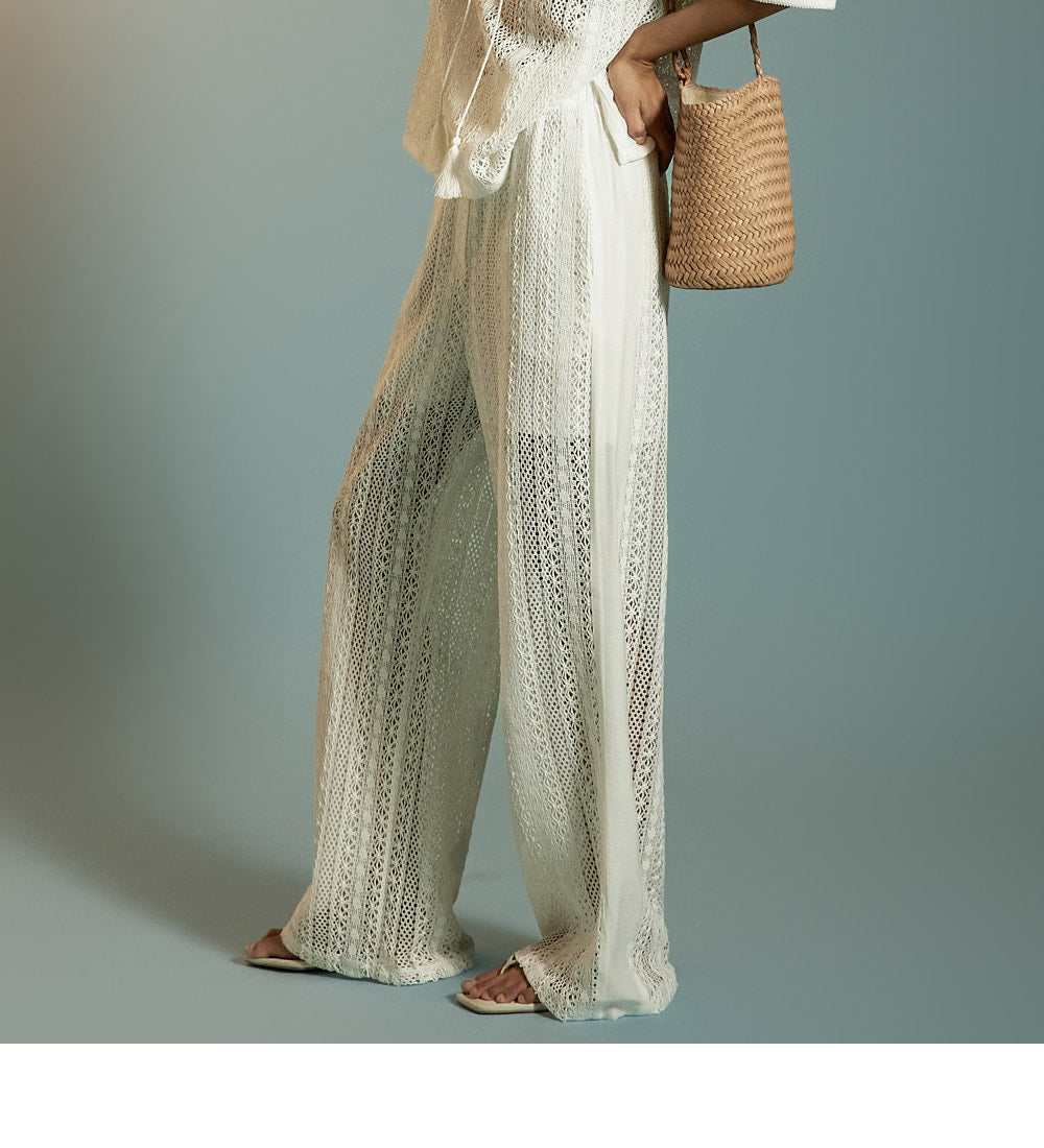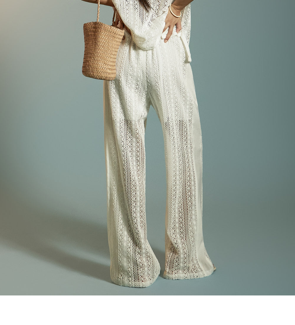 这是一套散发着轻松、休闲氛围的蕾丝针织套装。