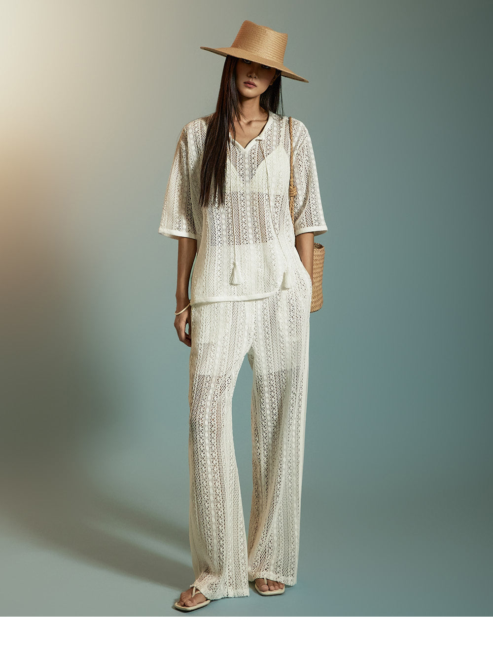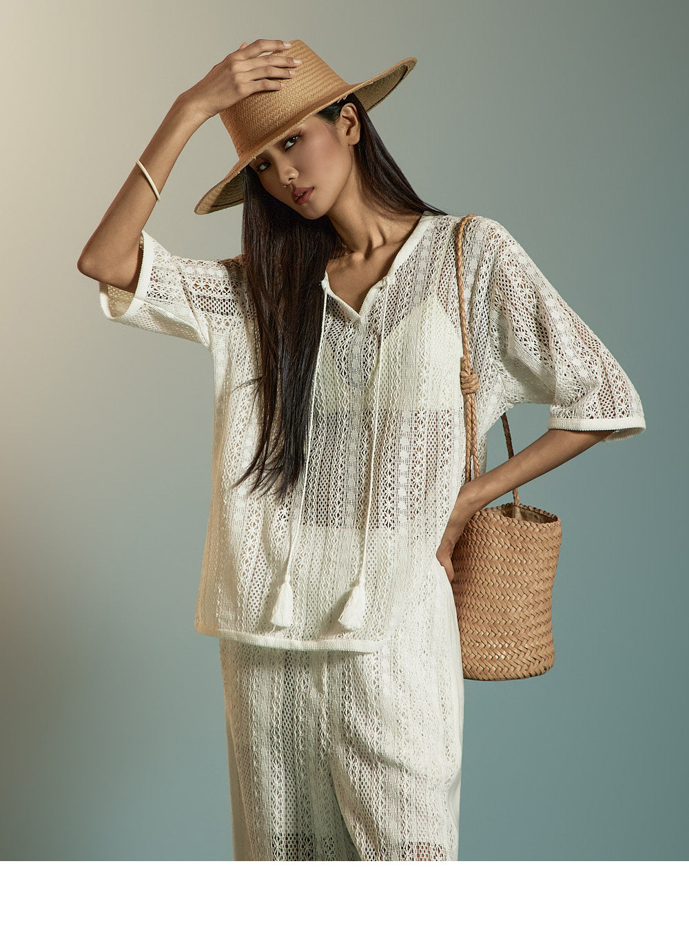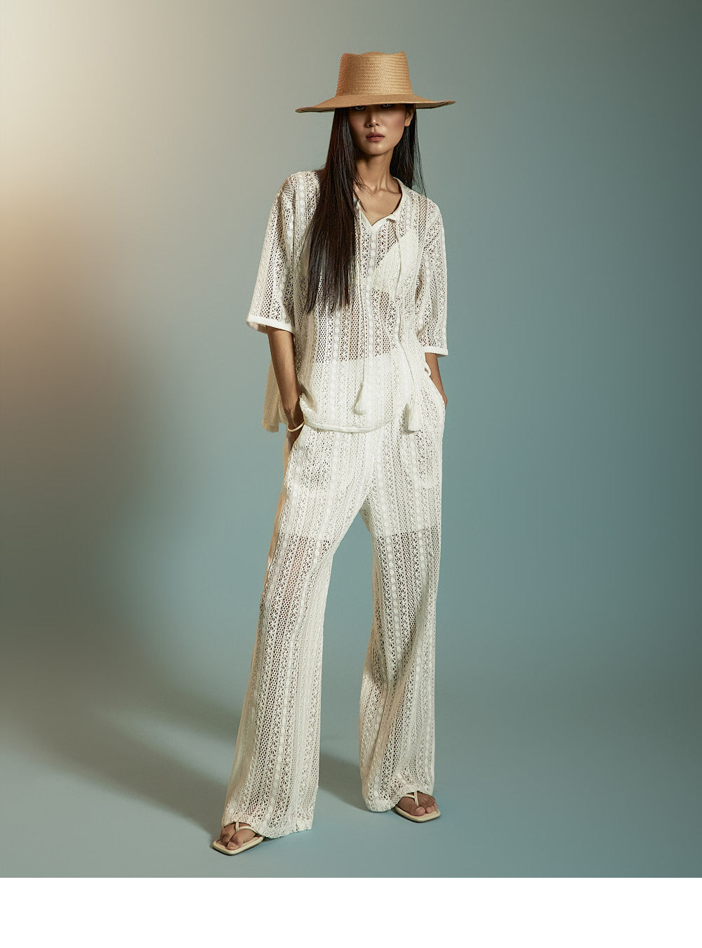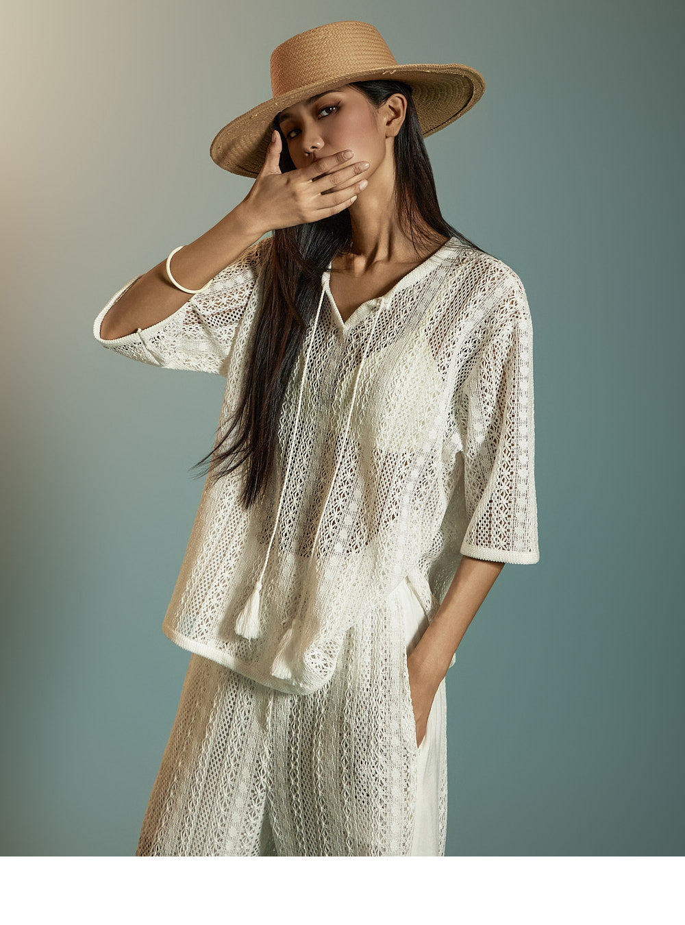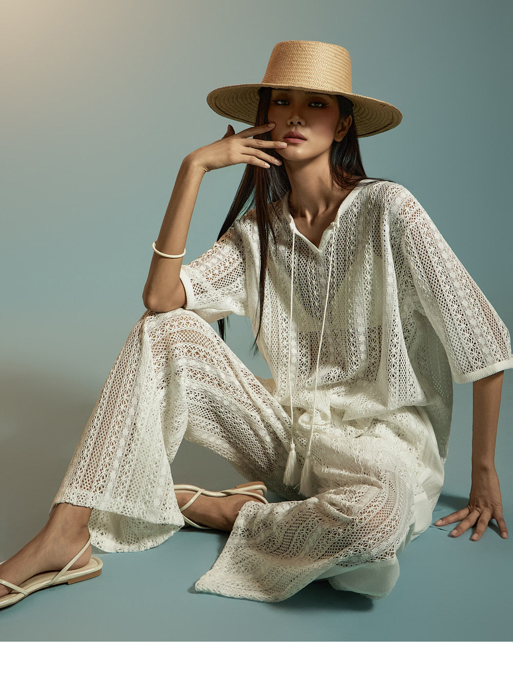 这是一套散发着轻松、休闲氛围的蕾丝针织套装。