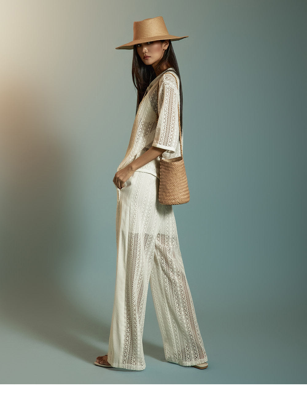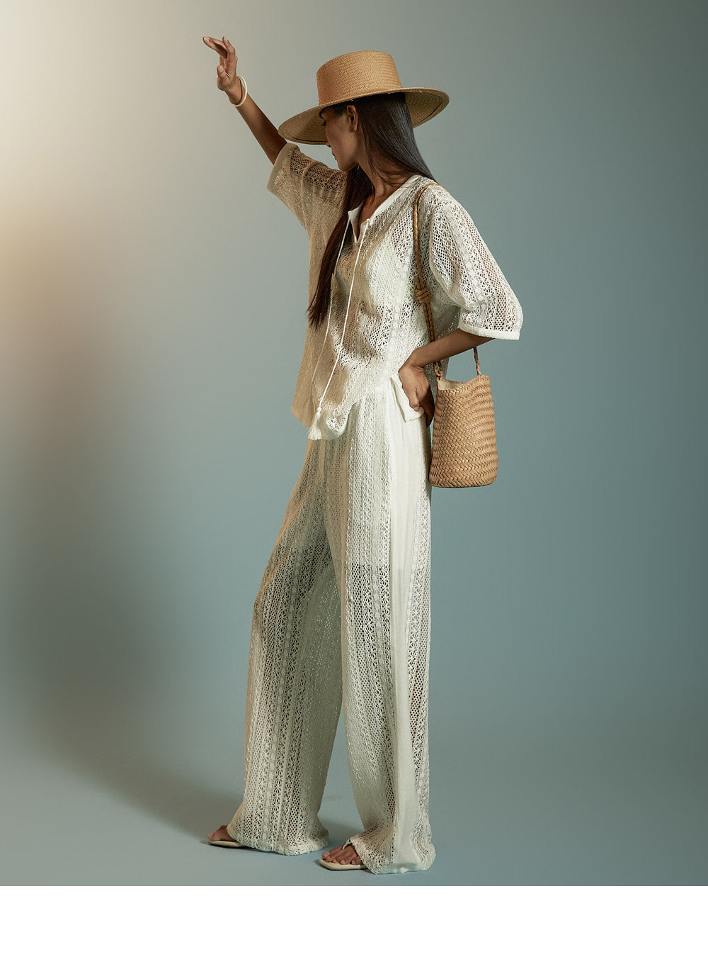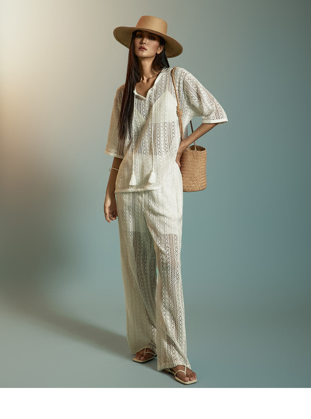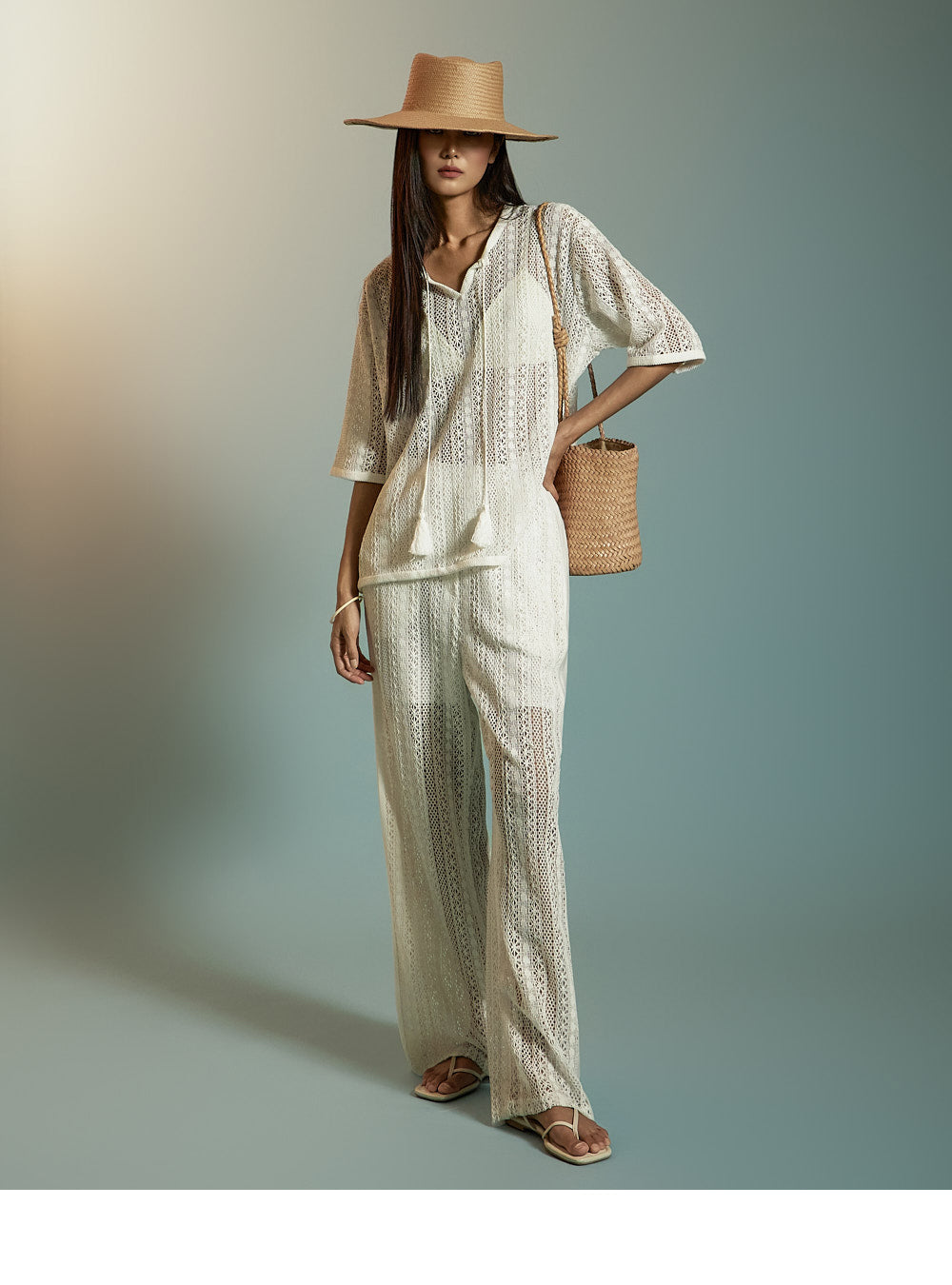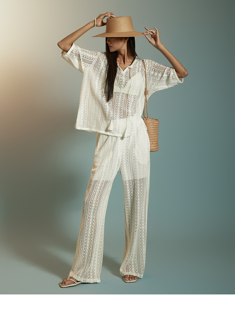 这是一套散发着轻松、休闲氛围的蕾丝针织套装。