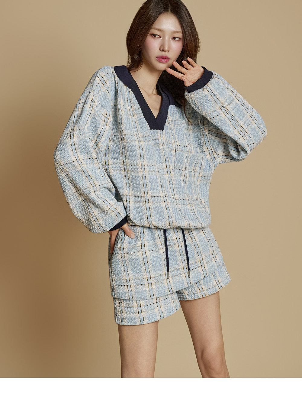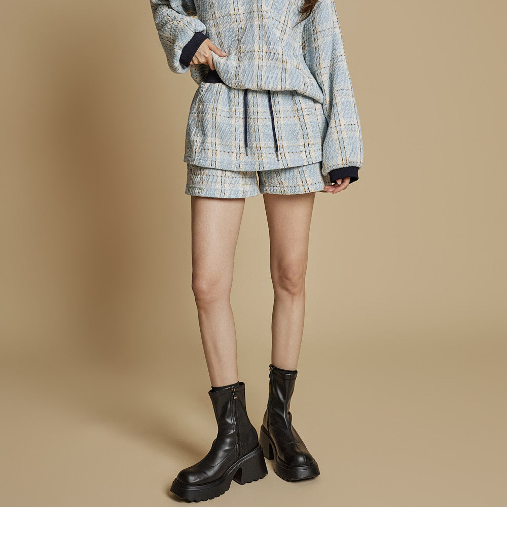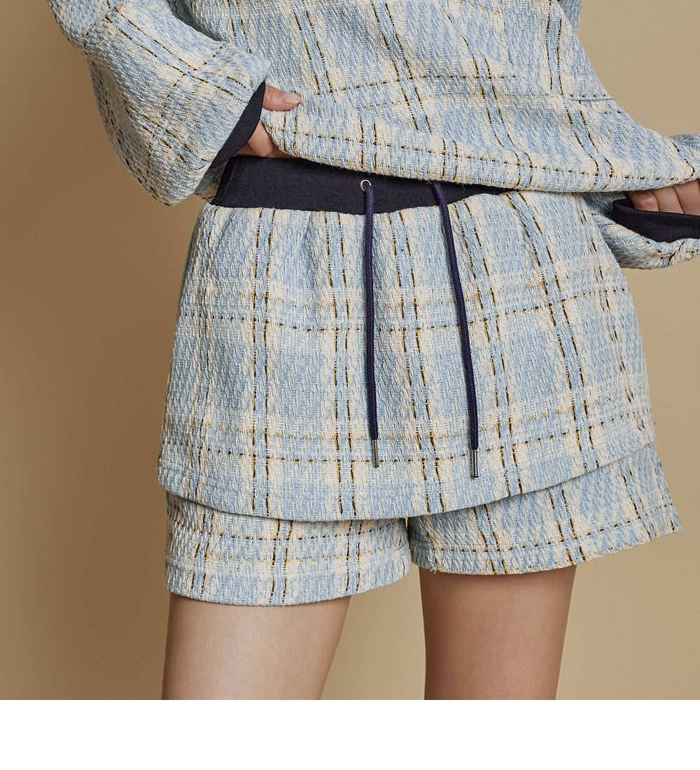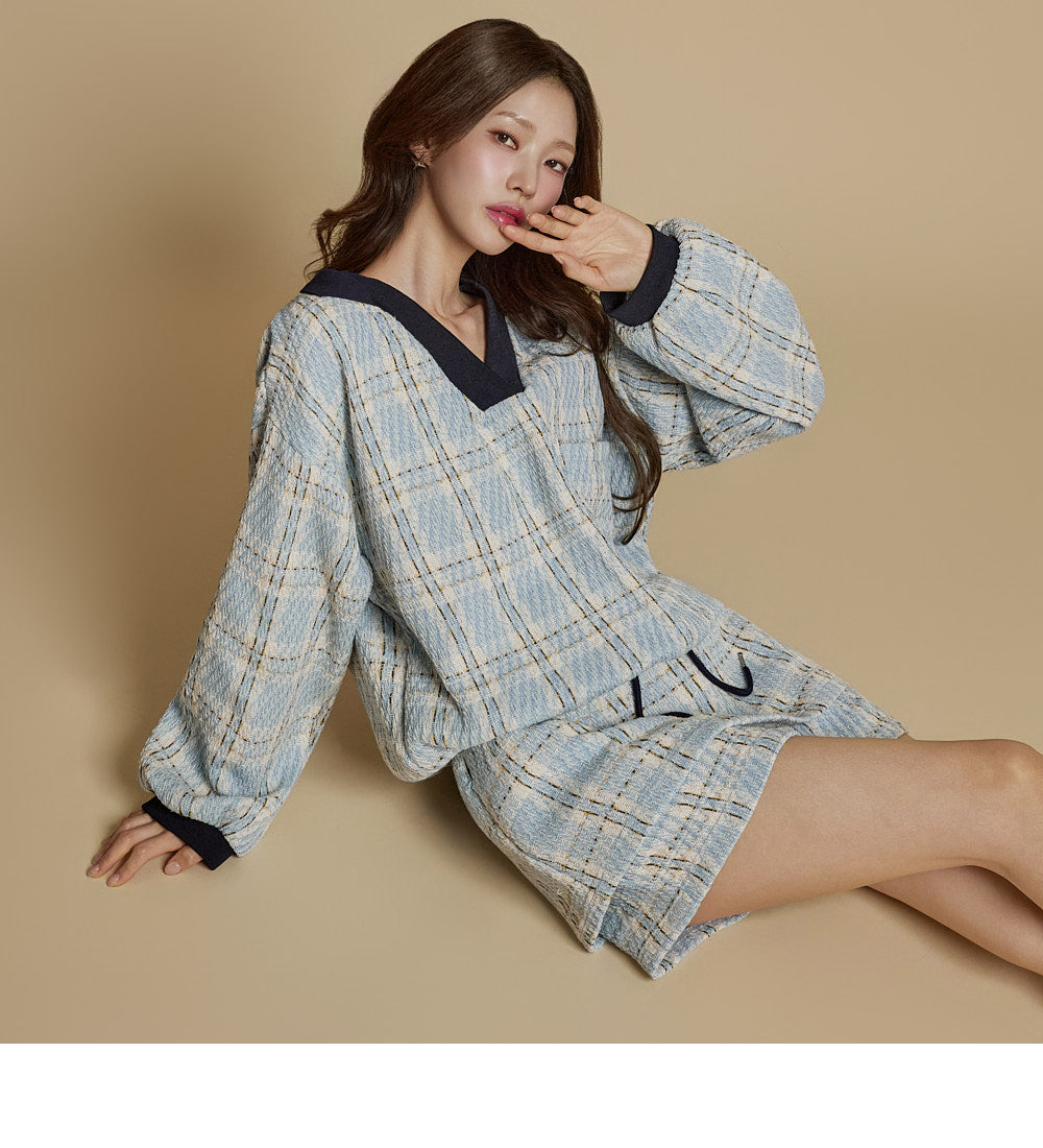 This is a casual checkered sweatshirt and shorts set.