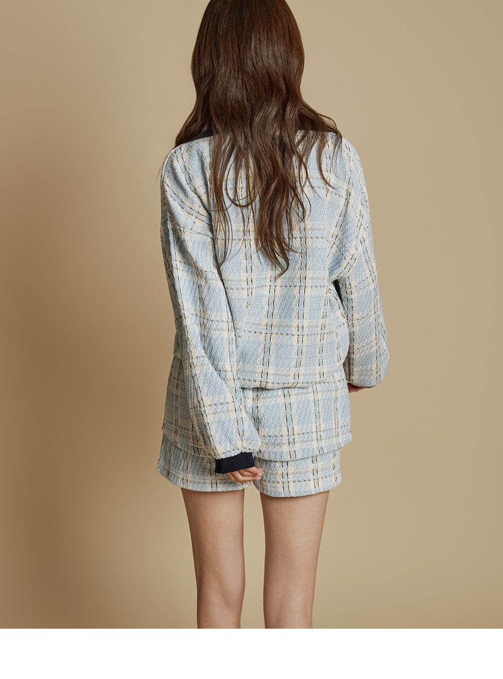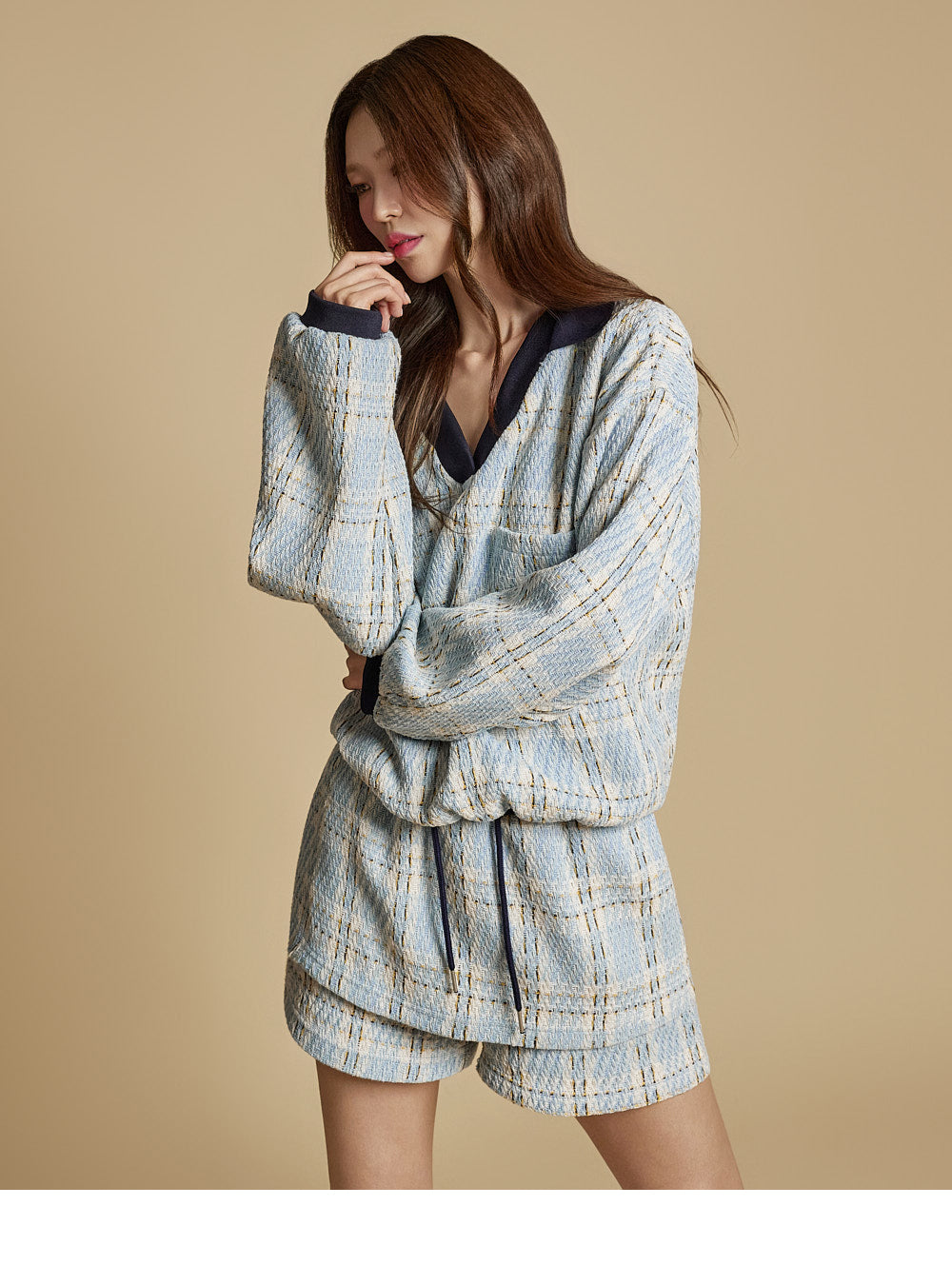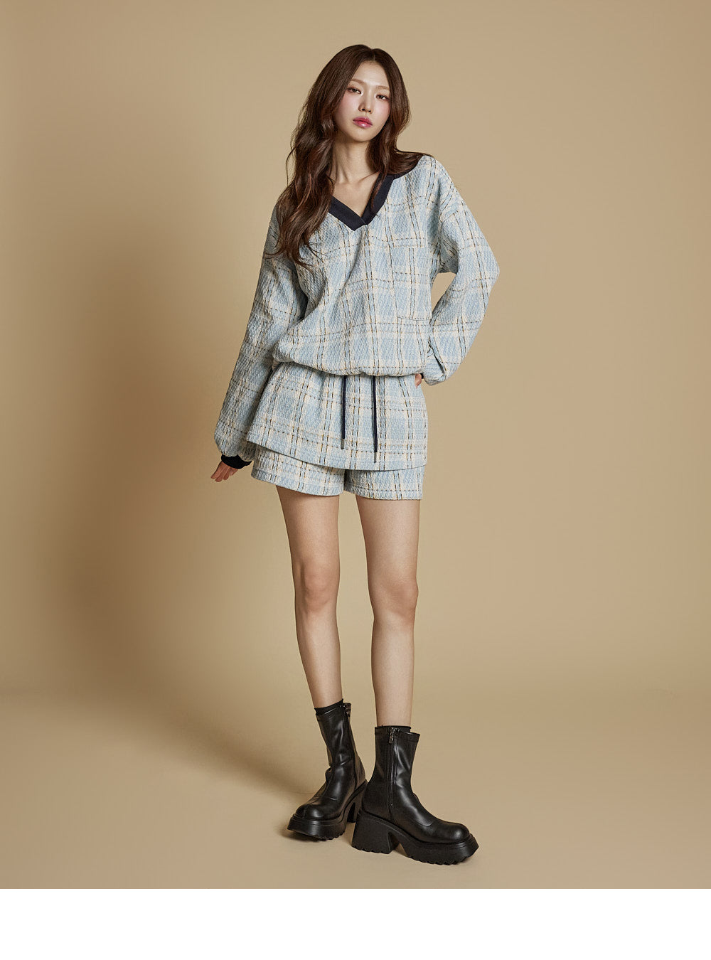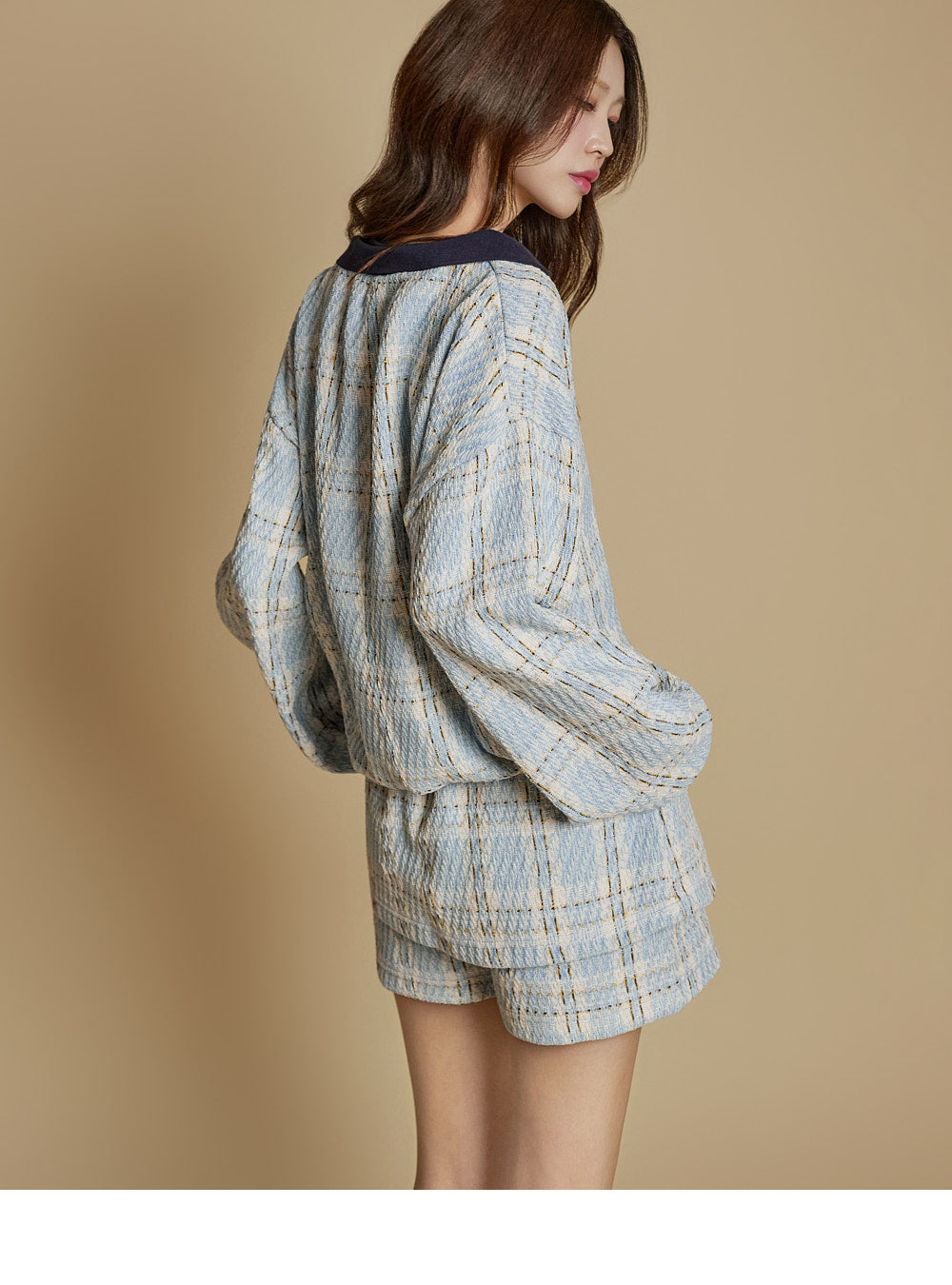 This is a casual checkered sweatshirt and shorts set.