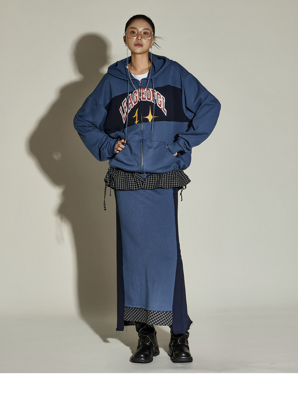 This set features a casual hooded zip-up and check skirt.