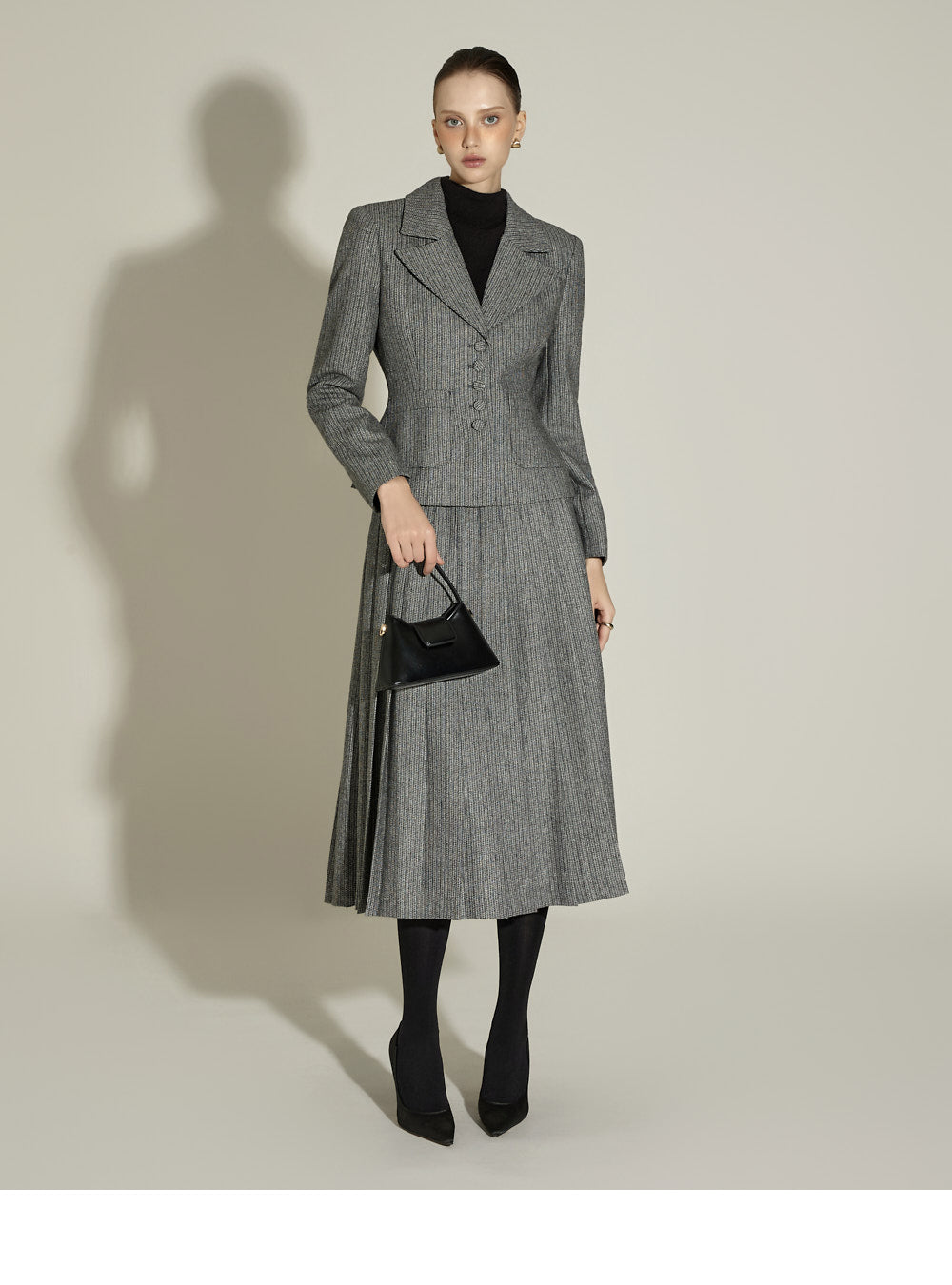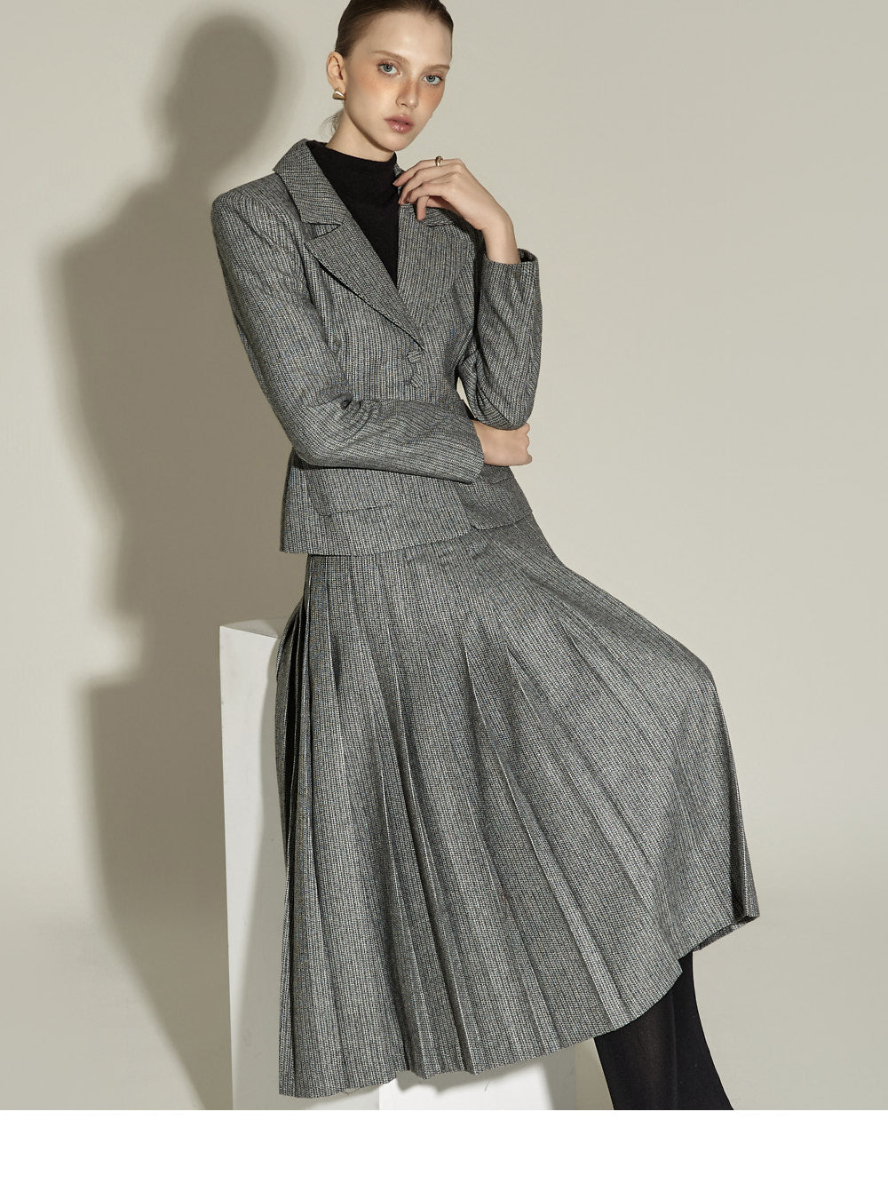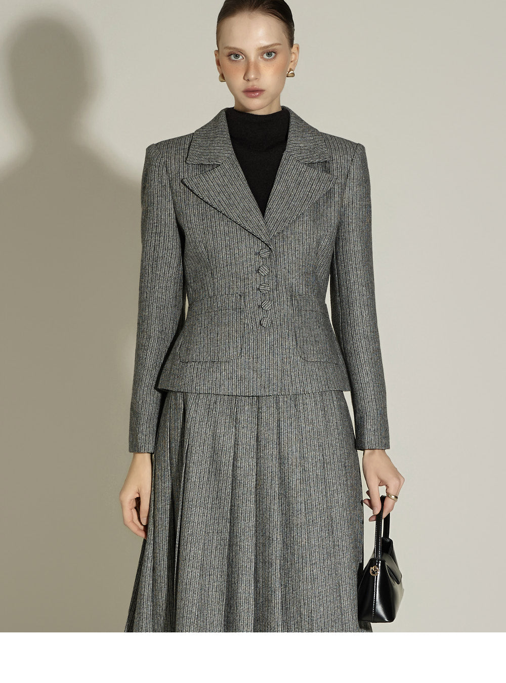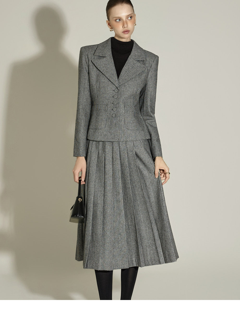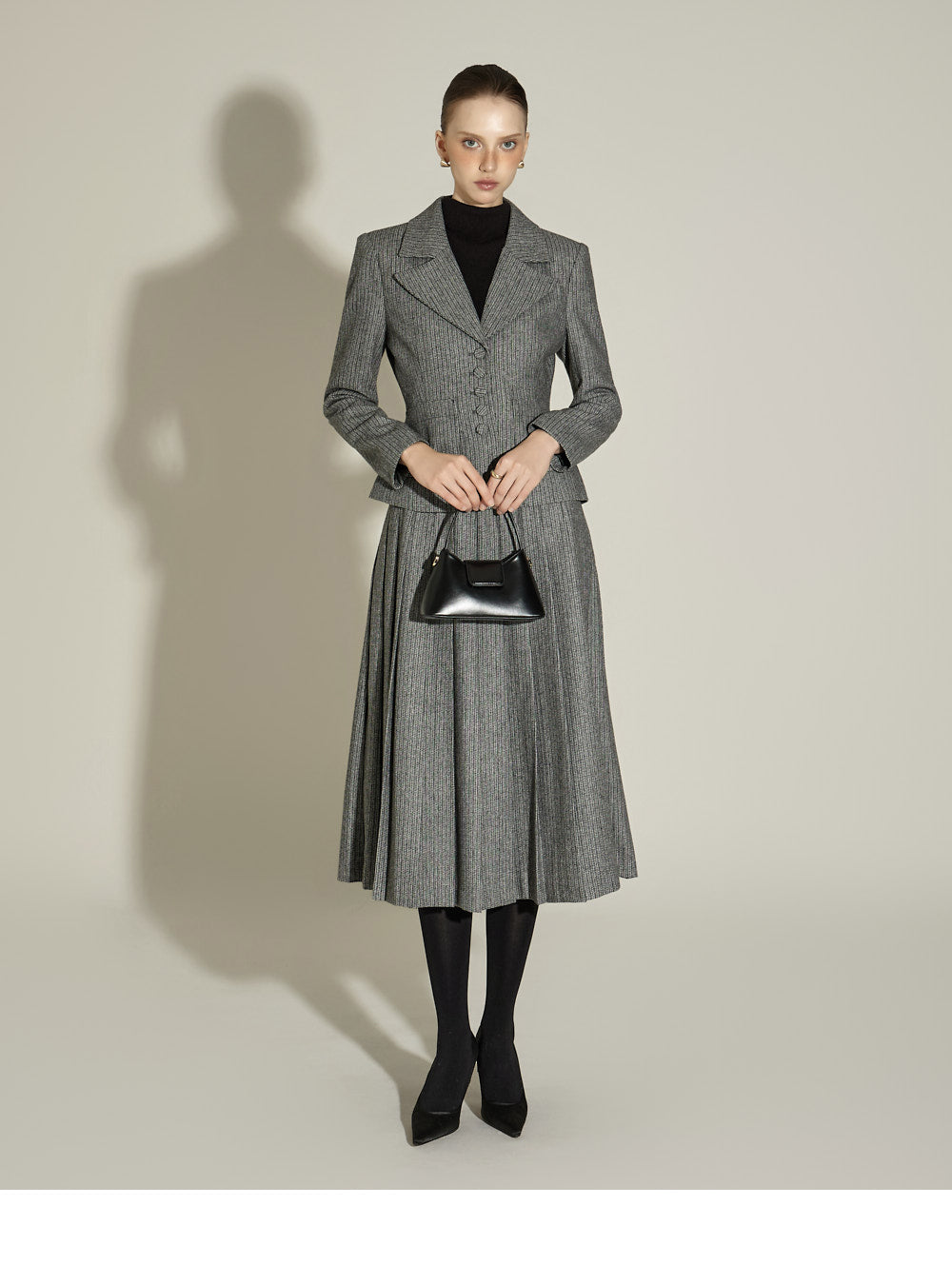 Model (174cm) is wearing a size S jacket and skirt in BLACK.